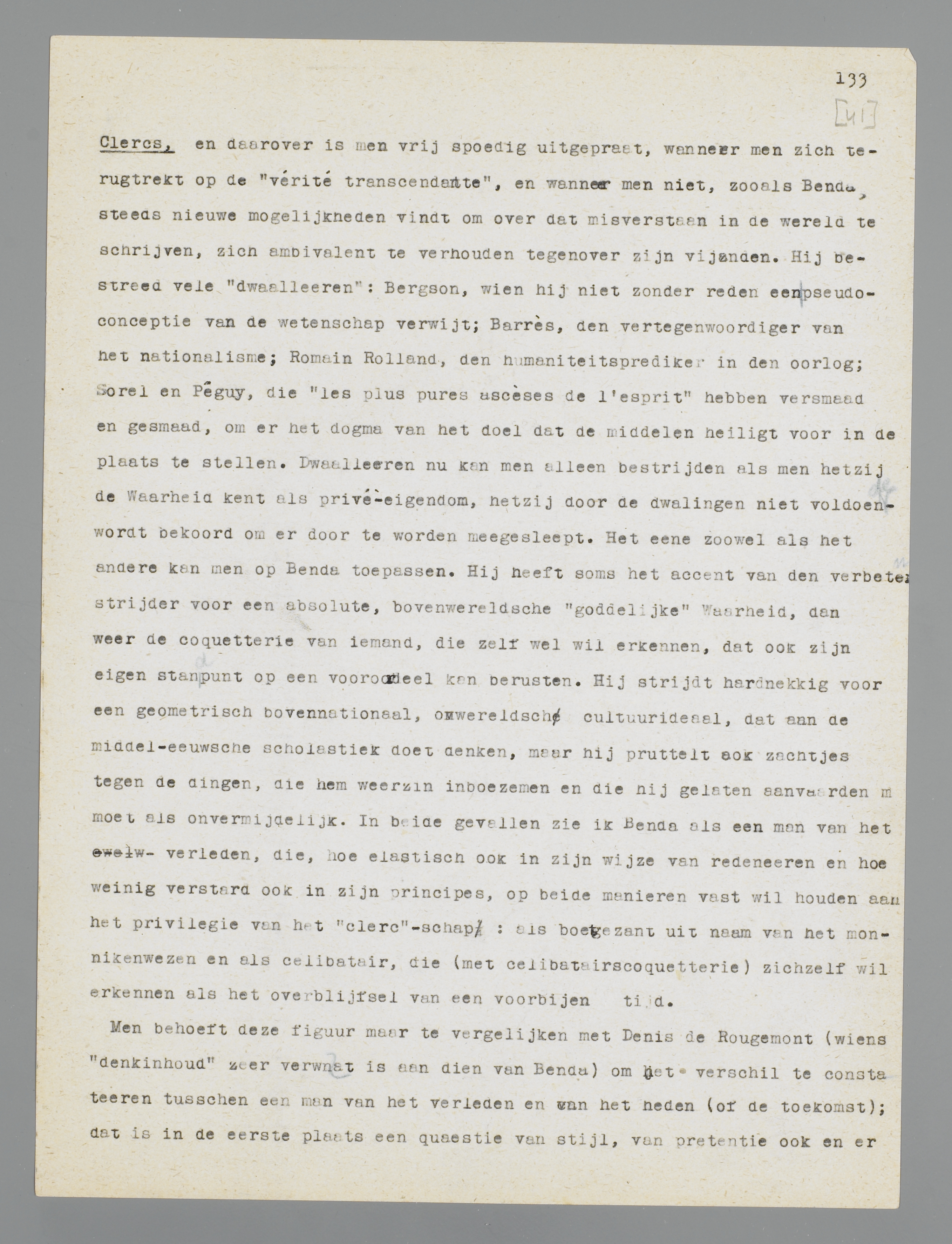 Men behoeft deze figuur maar te vergelijken met Denis de Rougemont (wiens ‘denkinhoud’ zeer verwant is aan dien van Benda) om het verschil te constateeren tusschen een man van het verleden en van het heden (of de toekomst); dat is in de eerste plaats een quaestie van stijl, van pretentie ook, en er is daarmee nog niets ongunstigs gezegd aan het adres van Benda. Integendeel: het feit, dat hij, de ‘oude’, met al zijn tics van bejaarden intellectueel, volko-