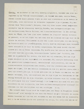 In een wereld, die het tragische zoo hoog honoreert als de onze is een figuur als Julien Benda, in Nederland voornamelijk bekend door zijn boek La Trahison des Clercs, een opmerkelijke uitzondering. Benda neemt het nl. zonder eenige cultureele valsche schaamte op voor wat hij duidelijk genoeg noemt ‘la conception non tragique de la vie’. In al zijn boeken heeft hij dat tot dusverre gedaan, maar hij heeft nog nooit zoo helder en zakelijk rekenschap afgelegd van de wording van zulk een geestesgegesteldheid als in zijn autobiographie La Jeunesse d'un Clerc. Er zijn niet al te veel boeken, die zoo van bladzijde tot bladzijde boeien als deze verantwoording van een ontwikkeling; wanneer men nog bedenkt, dat Benda in 1867 geboren is, dan heeft men des te meer reden om te veronderstellen, dat de niet-tragische opvatting van het leven geenszins gelijk te stellen is met verstard conformisme. Deze ‘clerc’ schrijft een zoo lenigen, klaren en genuanceerden stijl, dat men er noch de gestijfselde vooroordeelen van den officieelen ouden dag, noch de babbelzucht van sommige mededeelzame grijsaards ook maar voor een gram in vertegenwoordigd vindt; het ontbreken van het tragische moment is in deze beschrijving van een intellectueele