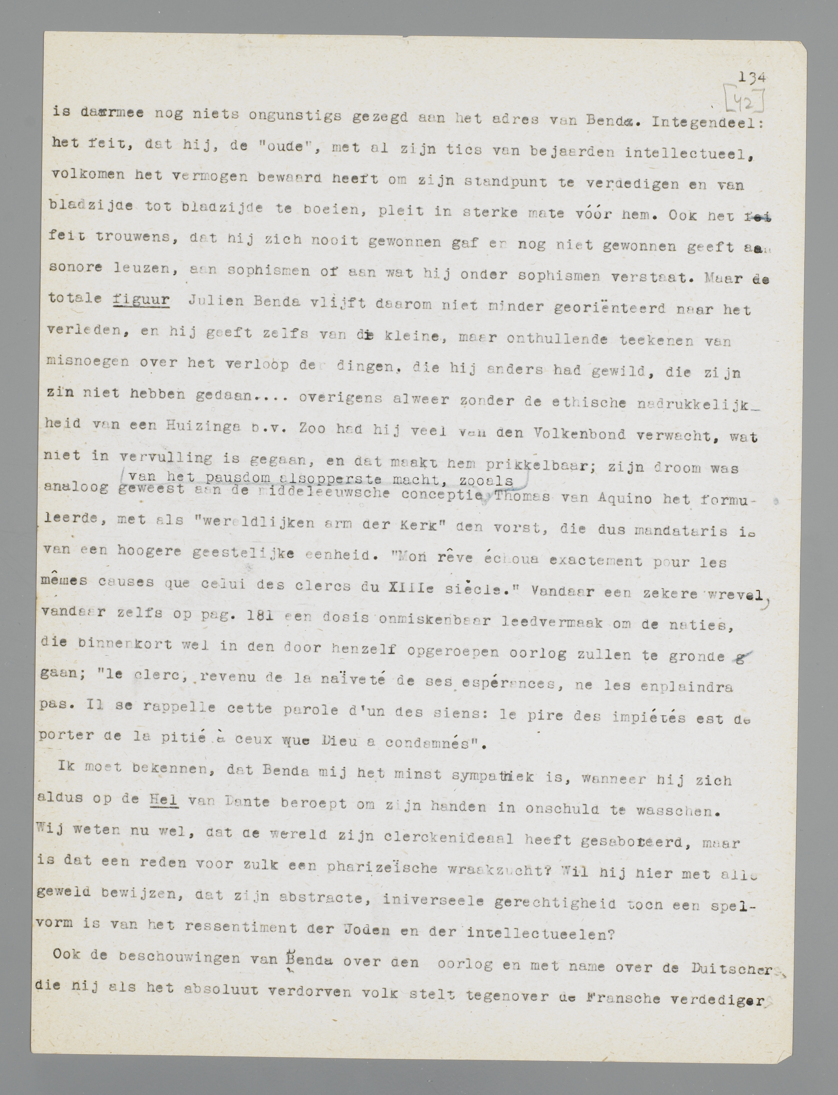 Ik moet bekennen, dat Benda mij het minst sympathiek is, wanneer hij zich aldus op de Hel van Dante beroept om zijn handen in onschuld te wasschen. Wij weten nu wel, dat de wereld zijn clerckenideaal heeft gesaboteerd, maar is dat een reden voor zulk een pharizeïsche wraakzucht? Wil hij hier met alle geweld bewijzen, dat zijn abstracte, universeele gerechtigheid toch een spelvorm is van het ressentiment der Joden en der intellectueelen?