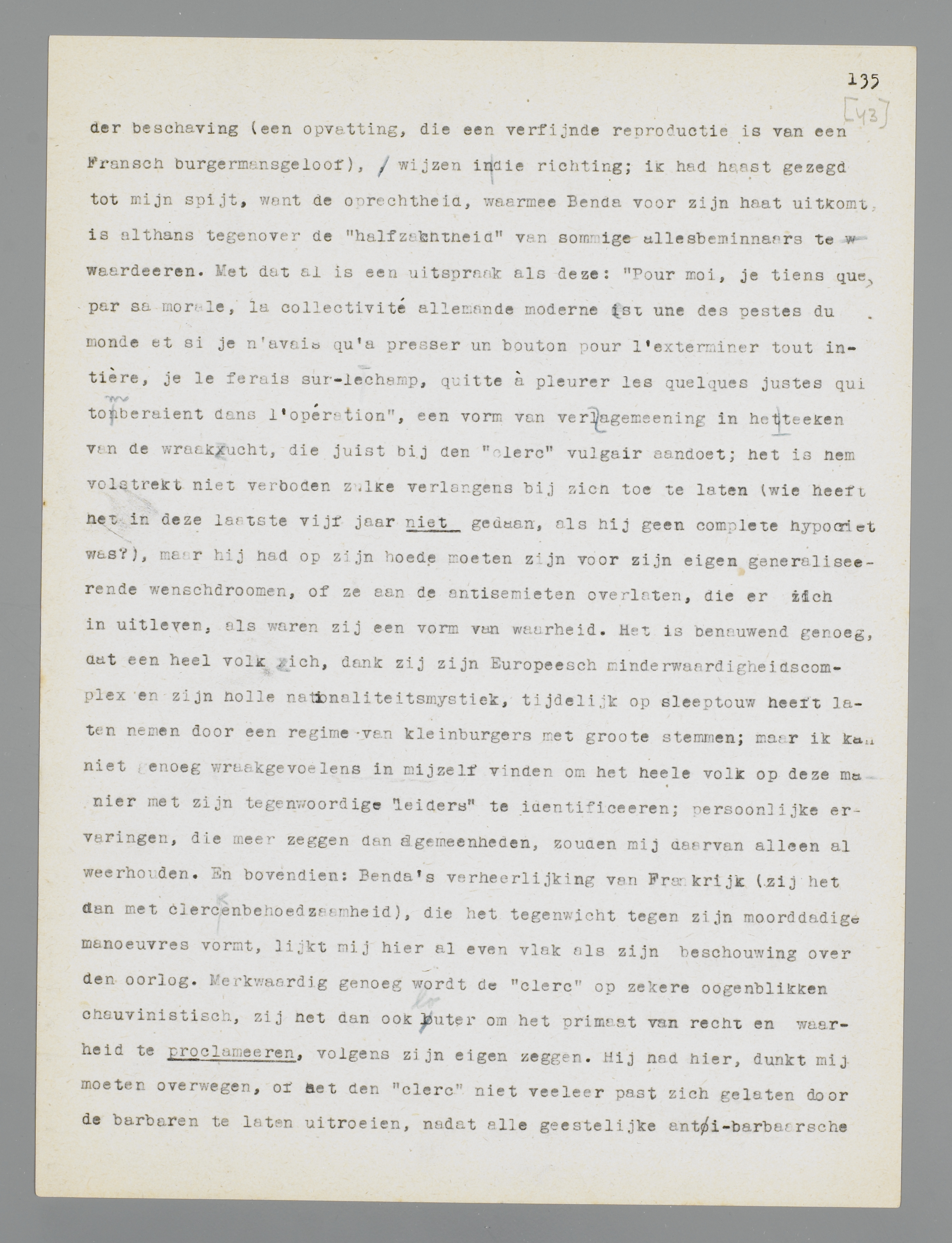 een vorm van veralgemeening in het teeken van de wraakzucht, die juist bij den ‘clerc’ vulgair aandoet; het is hem volstrekt niet verboden zulke verlangens bij zich toe te laten (wie heeft het in deze laatste vijf jaar niet gedaan, als hij geen complete hypocriet was?), maar hij had op zijn hoede moeten zijn voor zijn eigen generaliseerende wenschdroomen, of ze aan de antisemieten overlaten, die er zich in uitleven, als waren zij een vorm van waarheid. Het is benauwend genoeg, dat een heel volk zich, dank zij zijn Europeesch minderwaardigheids-complex en zijn holle nationaliteitsmystiek, tijdelijk op sleeptouw heeft laten nemen door een regime van kleinburgers met groote stemmen; maar ik kan niet genoeg wraakgevoelens in mijzelf vinden om het heele volk op deze manier met zijn tegenwoordige ‘leiders’ te identificeeren; persoonlijke ervaringen, die meer zeggen dan algemeenheden, zouden mij daarvan alleen al weerhouden. En bovendien: Benda's verheerlijking van Frankrijk (zij het dan met clercken-behoedzaamheid), die het tegenwicht tegen zijn moorddadige manoeuvres vormt, lijkt mij hier al even vlak als zijn beschouwing over den oorlog. Merkwaardig genoeg wordt de ‘clerc’ op zekere oogenblikken chauvinistisch, zij het dan ook louter om het primaat van recht en waarheid te proclameeren, volgens zijn eigen zeggen. Hij had hier, dunkt mij, moeten overwegen, of het