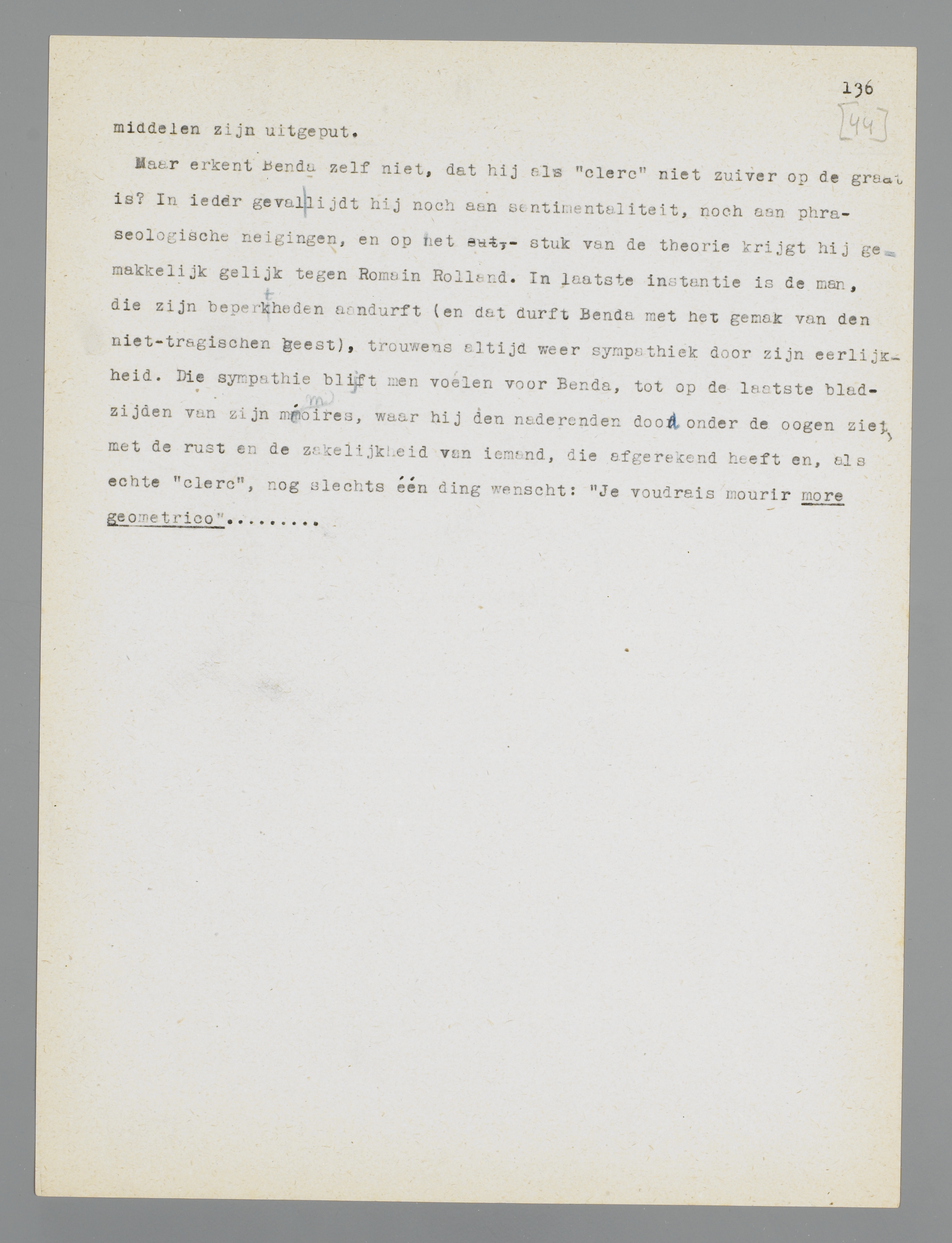 Maar erkent Benda zelf niet, dat hij als ‘clerc’ niet zuiver op de graat is? In ieder geval lijdt hij noch aan sentimentaliteit, noch aan phraseologische neigingen, en op het stuk van de theorie krijgt hij gemakkelijk gelijk tegen Romain Rolland. In laatste instantie is de man, die zijn beperktheden aandurft (en dat durft Benda met het gemak van den niet-tragischen geest), trouwens altijd weer sympathiek door zijn eerlijkheid. Die sympathie blijft men voelen voor Benda, tot op de laatste bladzijden van zijn mémoires, waar hij den naderenden dood onder de oogen ziet, met de rust en de zakelijkheid van iemand, die afgerekend heeft en, als echte ‘clerc’, nog slechts één ding wenscht: ‘Je voudrais mourir more geometrico’...