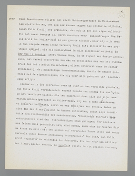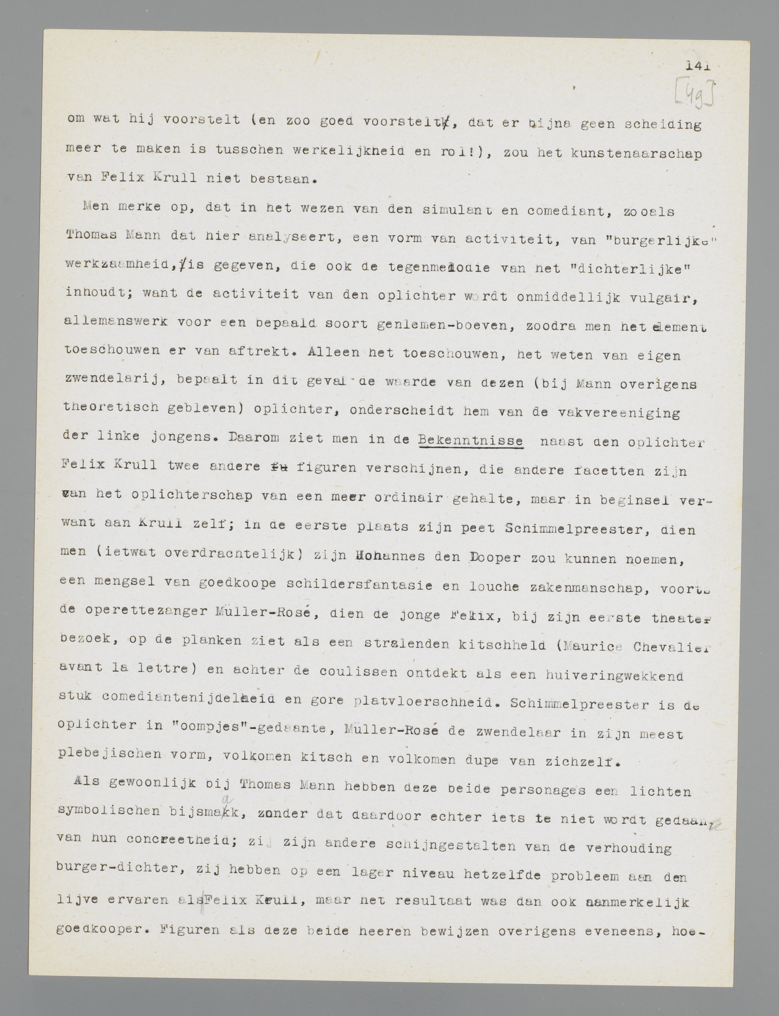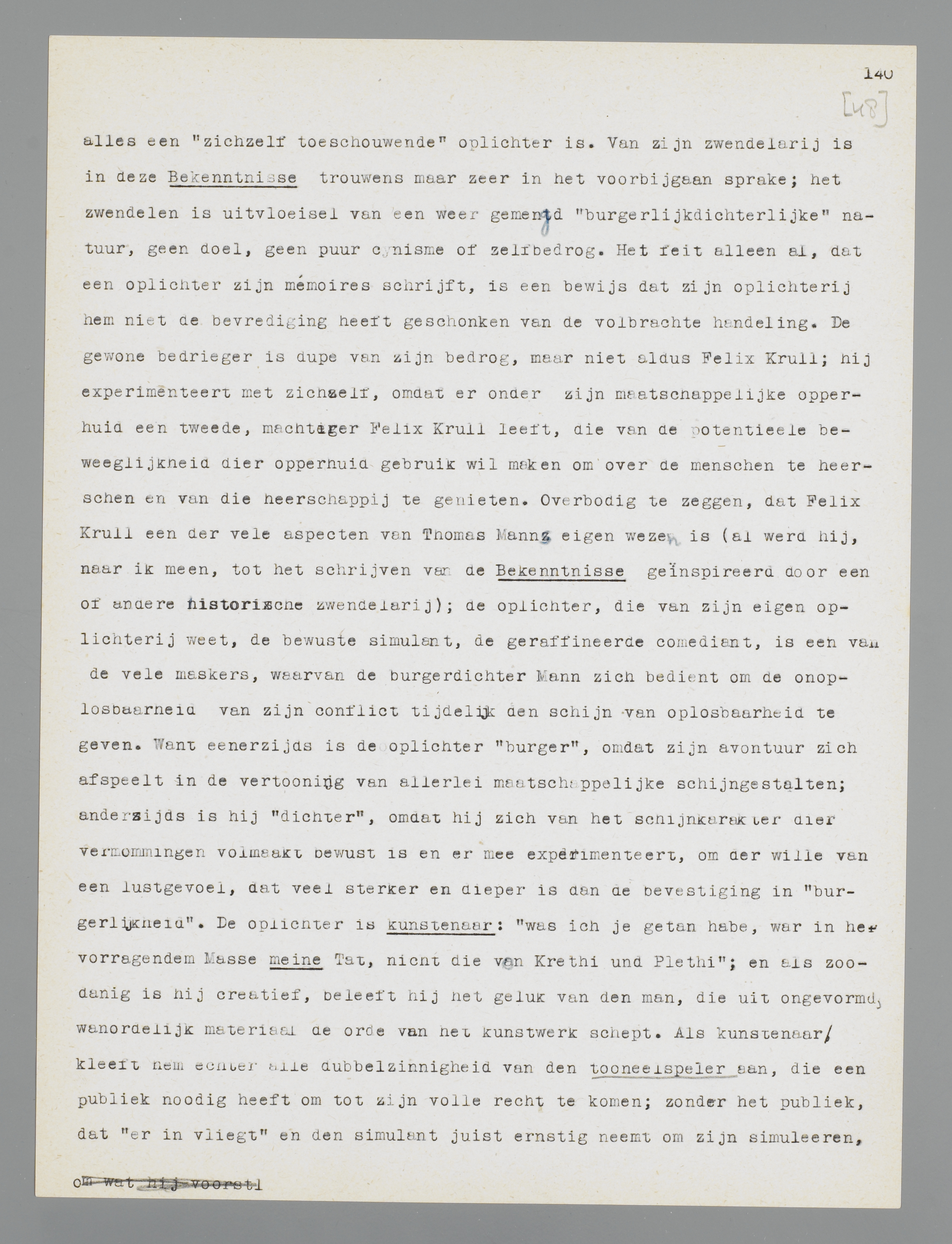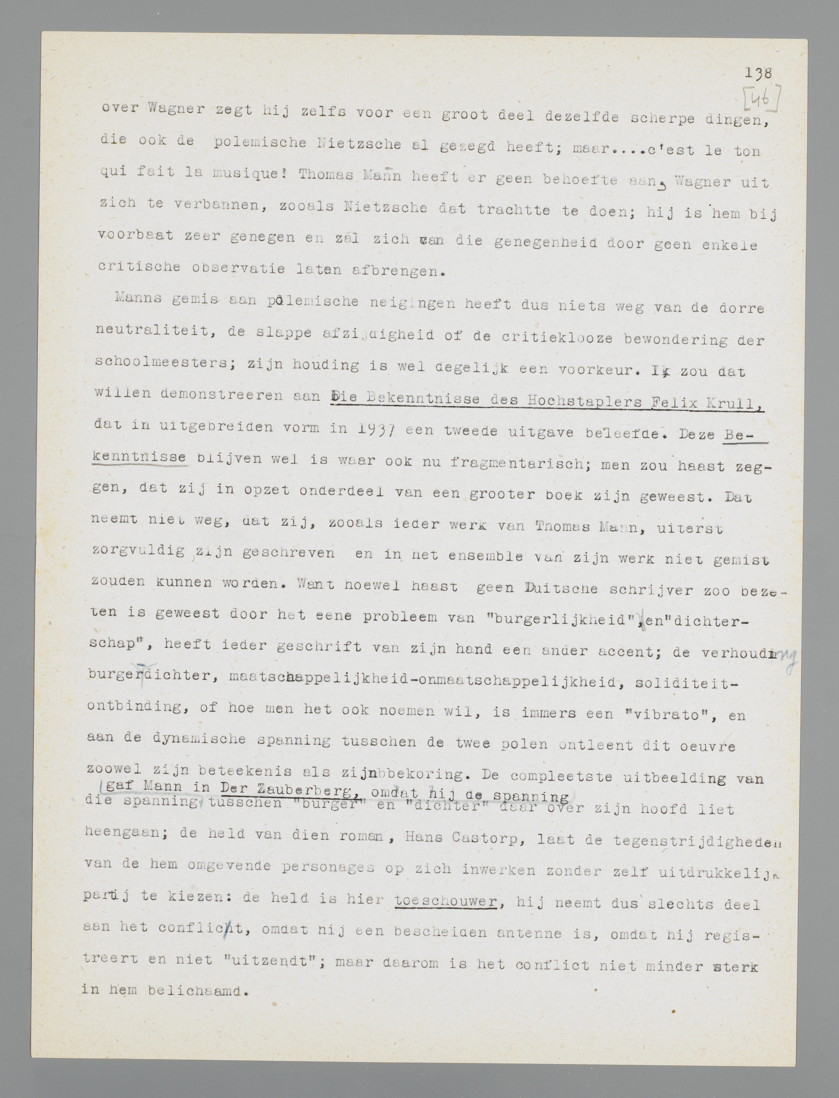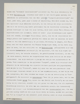 Manns gemis aan polemische neigingen heeft dus niets weg van de dorre neutraliteit, de slappe afzijdigheid of de critieklooze bewondering der schoolmeesters; zijn houding is wel degelijk een voorkeur. Ik zou dat willen demonstreeren aan Die Bekenntnisse des Hochstaplers Felix Krull, dat in uitgebreiden vorm in 1937 een tweede uitgave beleefde. Deze Bekenntnisse blijven wel is waar ook nu fragmentarisch; men zou