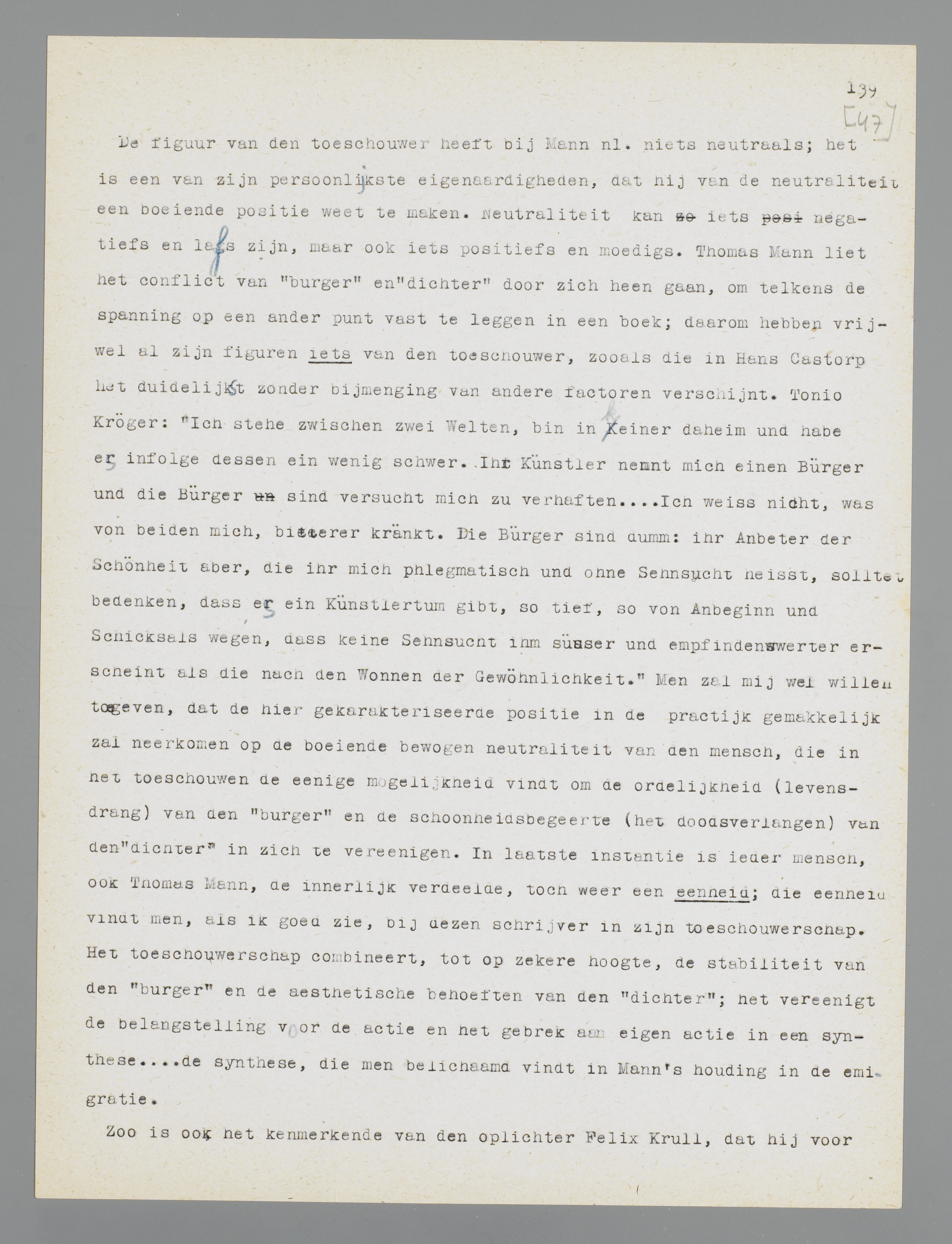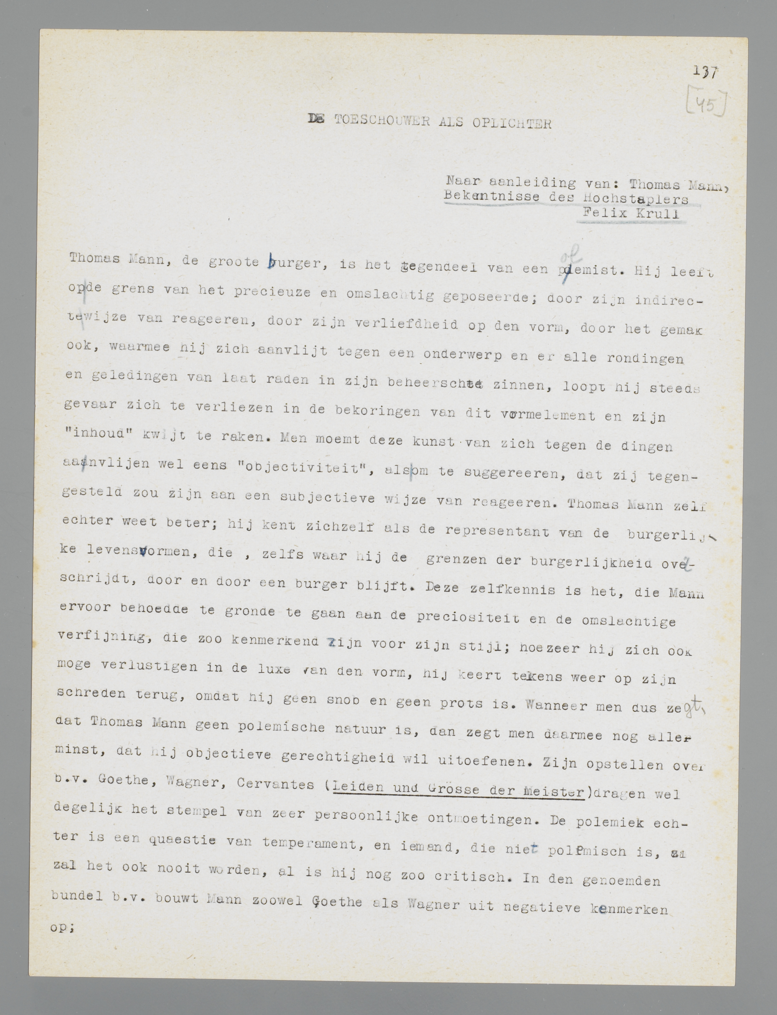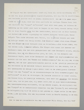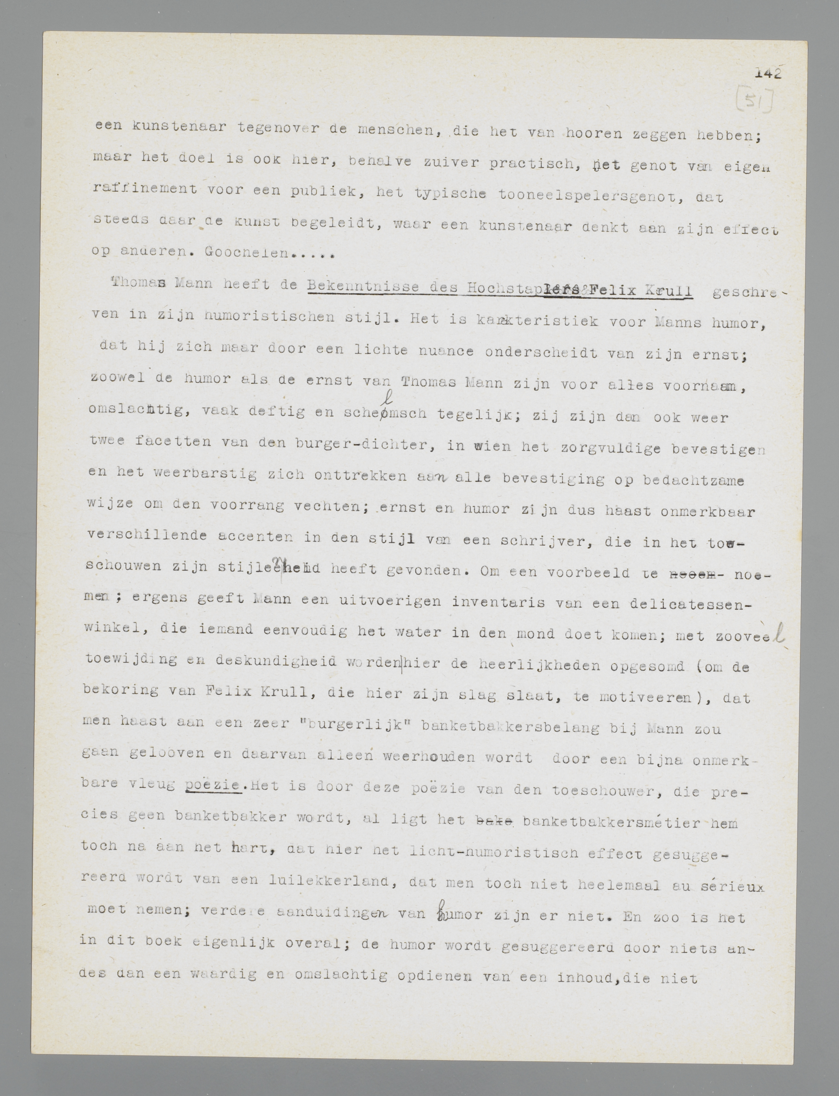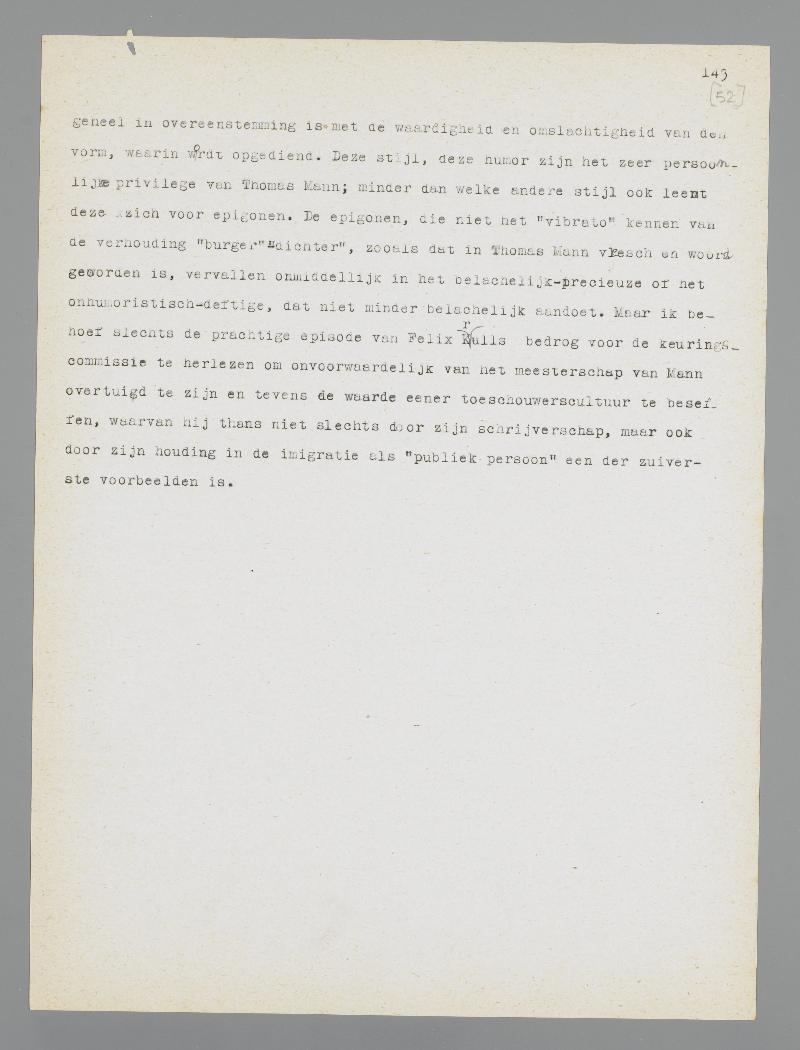 Manns gemis aan polemische neigingen heeft dus niets weg van de dorre neutraliteit, de slappe afzijdigheid of de critieklooze bewondering der schoolmeesters; zijn houding is wel degelijk een voorkeur. Ik zou dat willen demonstreeren aan Die Bekenntnisse des Hochstaplers Felix Krull, dat in uitgebreiden vorm in 1937 een tweede uitgave beleefde. Deze Bekenntnisse blijven wel is waar ook nu fragmentarisch; men zou