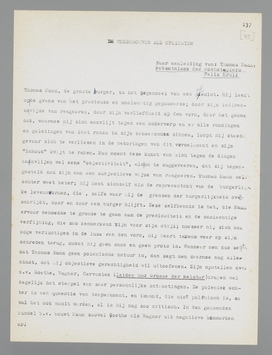 Thomas Mann, de groote burger, is het tegendeel van een polemist. Hij leeft op de grens van het precieuze en omslachtig geposeerde; door zijn indirecte wijze van reageeren, door zijn verliefdheid op den vorm, door het gemak ook, waarmee hij zich aanvlijt tegen een onderwerp en er alle rondingen en geledingen van laat raden in zijn beheerschte zinnen, loopt hij steeds gevaar zich te verliezen in de bekoringen van dit vormelement en zijn ‘inhoud’ kwijt te raken. Men noemt deze kunst van zich tegen de dingen aanvlijen wel eens ‘objectiviteit’, als om te suggereeren, dat zij tegengesteld zou zijn aan een subjectieve wijze van reageeren. Thomas Mann zelf echter weet beter; hij kent zichzelf als de representant van de burgerlijke levensvormen, die, zelfs waar hij de grenzen der burgerlijkheid overschrijdt, door en door een burger blijft. Deze zelfkennis is het, die Mann ervoor behoedde te gronde te gaan aan de preciositeit en de omslachtige verfijning, die zoo kenmerkend zijn voor zijn stijl; hoezeer hij zich ook moge verlustigen in de luxe van den vorm, hij keert telkens weer op zijn schreden terug, omdat hij geen snob en geen prots is.