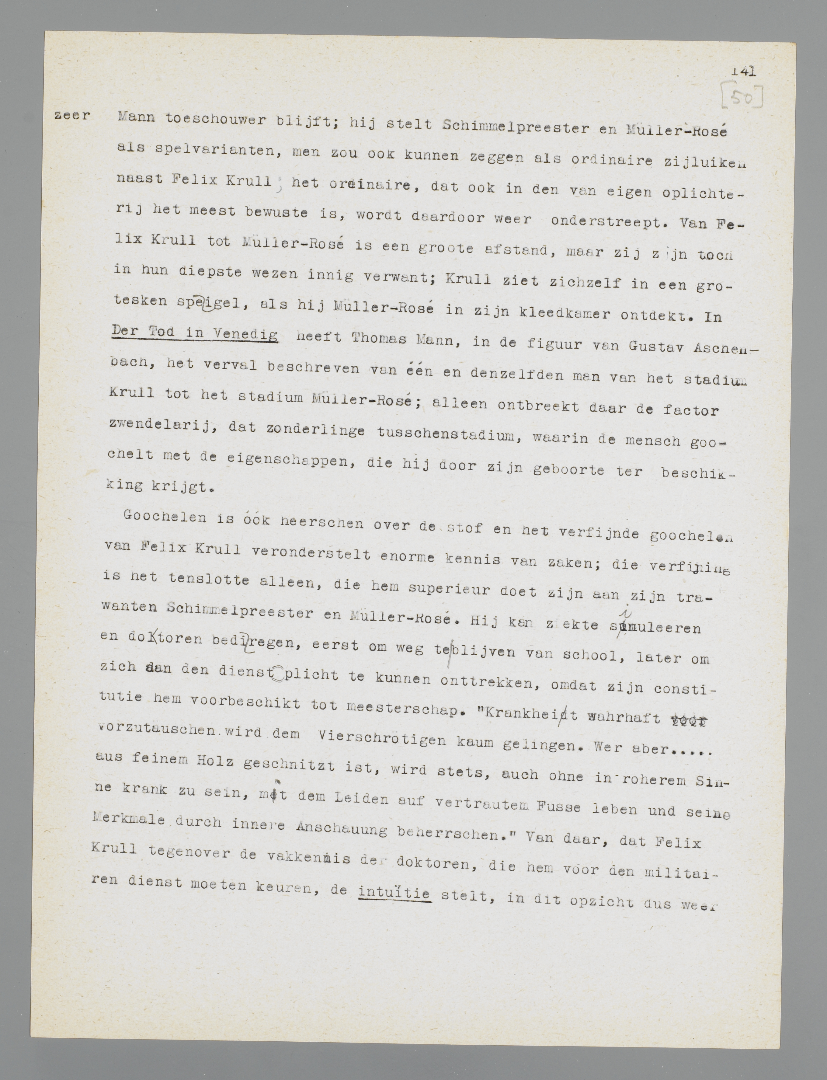 Als gewoonlijk bij Thomas Mann hebben deze beide personages een lichten symbolischen bijsmaak, zonder dat daardoor echter iets te niet wordt gedaan van hun concreetheid; zij zijn andere schijngestalten van de verhouding burger-dichter, zij hebben op een lager niveau hetzelfde probleem aan den lijve ervaren als Felix Krull, maar het resultaat was dan ook aanmerkelijk goedkooper. Figuren als deze beide heeren bewijzen overigens eveneens, hoezeer Mann toeschouwer blijft; hij stelt Schimmelpreester en Müller-Rosé als spelvarianten, men zou ook kunnen zeggen als ordinaire zijluiken naast Felix Krull; het ordinaire, dat ook in den van eigen oplichterij het meest bewuste oplichter, zooals Krull er een is, toch aanwezig is, wordt daardoor weer onderstreept. Van Felix Krull tot Müller-Rosé is een groote afstand, maar zij zijn toch in hun diepste wezen innig verwant; Krull ziet zichzelf in een grotesken spiegel, als hij Müller-Rosé in zijn kleedkamer ontdekt. In Der Tod in Venedig heeft Thomas Mann, in de figuur van Gustav Aschen-