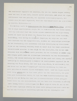 is door deze poëzie van den toeschouwer, die precies geen banketbakker wordt, al ligt het banketbakkersmétier hem toch na aan het hart, dat hier het licht-humoristisch effect gesuggereerd wordt van een luilekkerland, dat men toch niet heelemaal au sérieux moet nemen; verdere aanduidingen van humor zijn er niet. En zoo is het in dit boek eigenlijk overal; de humor wordt gesuggereerd door niets anders dan een waardig en omslachtig opdienen van een inhoud, die niet geheel in overeenstemming is met de waardigheid en omslachtigheid van den vorm, waarin wordt opgediend. Deze stijl, deze humor zijn het zeer persoonlijke privilege van Thomas Mann; minder dan welke andere stijl ook leent deze zich voor epigonen. De epigonen, die niet het ‘vibrato’ kennen van de verhouding ‘burger’-‘dichter’, zooals dat in Thomas Mann vleesch en woord geworden is, vervallen onmiddellijk in het belachelijk-precieuze of het onhumoristisch-deftige, dat niet minder belachelijk aandoet. Maar ik behoef slechts de prachtige episode van Felix Krulls bedrog voor de keuringscommissie te herlezen om onvoorwaardelijk van het meesterschap van Mann overtuigd te zijn en tevens de waarde eener toeschouwerscultuur te beseffen, waarvan hij thans niet slechts door zijn schrijverschap, maar ook door zijn houding in de emigratie als ‘publiek persoon’ een der zuiverste voorbeelden is.
