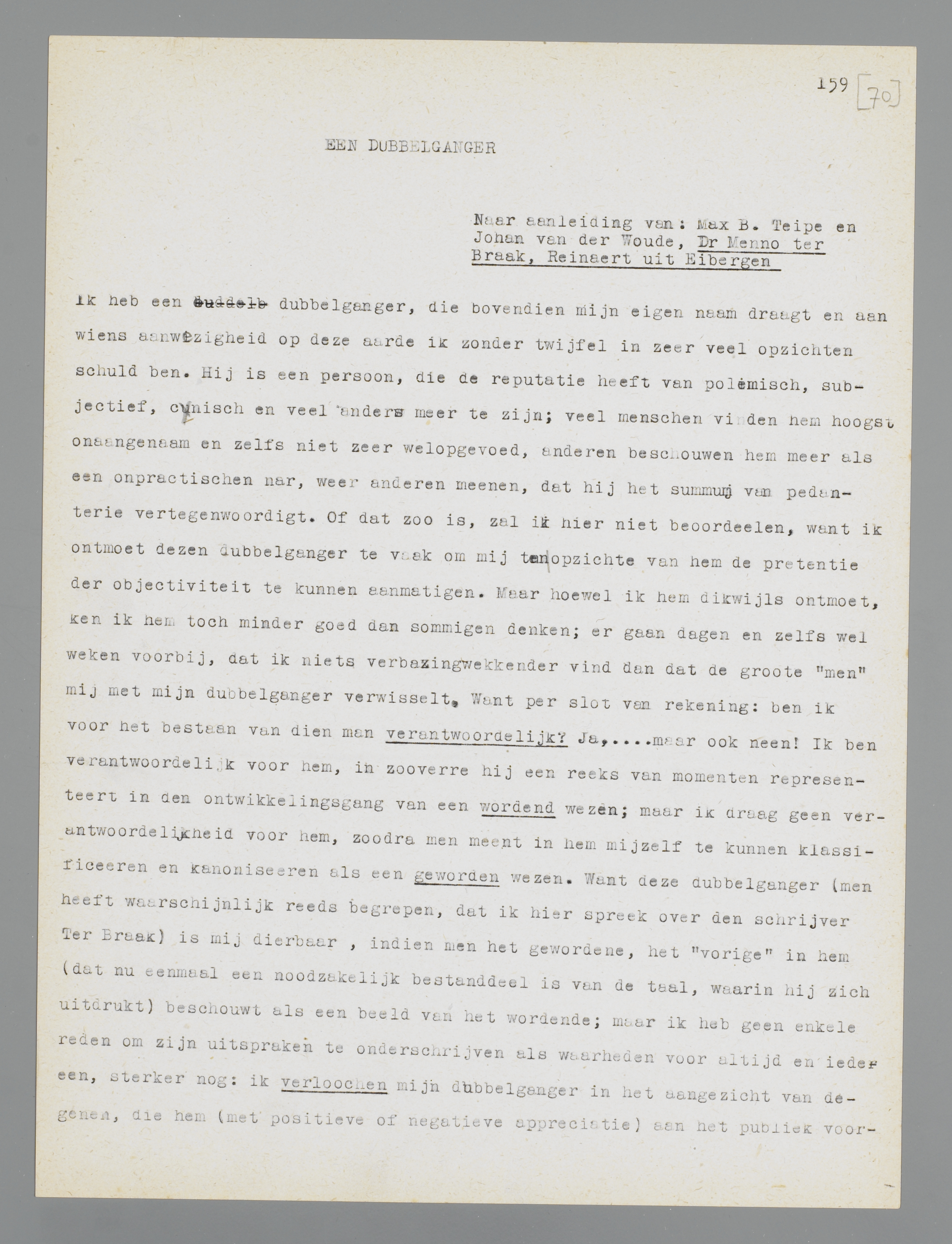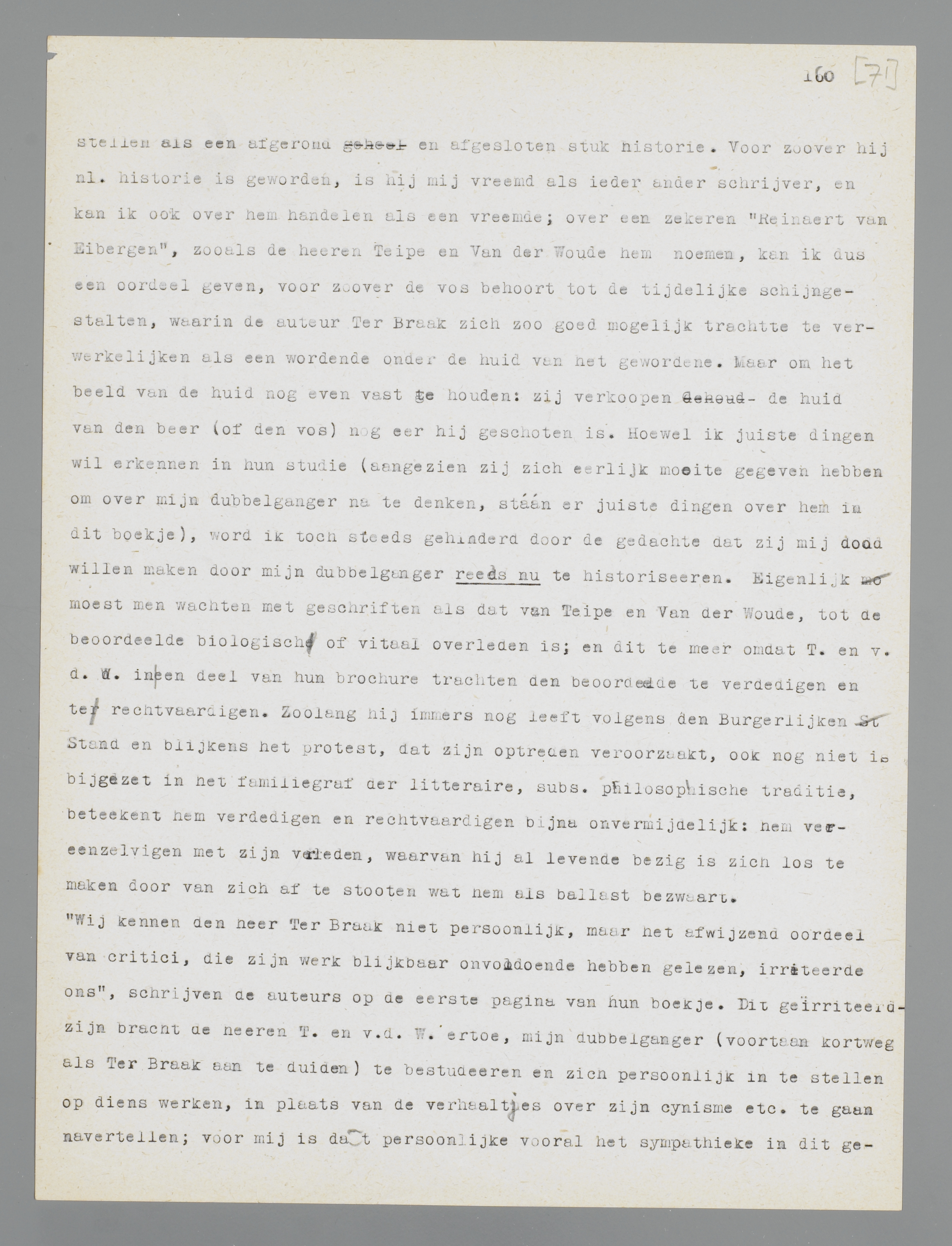 maar ik draag geen verantwoordelijkheid voor hem, zoodra men meent in hem mijzelf te kunnen klassificeeren en kanoniseeren als een geworden wezen. Want deze dubbelganger (men heeft waarschijnlijk reeds begrepen, dat ik hier spreek over den schrijver Ter Braak) is mij dierbaar, indien men het gewordene, het ‘vorige’ in hem (dat nu eenmaal een noodzakelijk bestanddeel is van de taal, waarin hij zich uitdrukt) beschouwt als een beeld van het wordende; maar ik heb geen enkele reden om zijn uitspraken te onderschrijven als waarheden voor altijd en iedereen, sterker nog: ik verloochen mijn dubbelganger in het aangezicht van degenen, die hem (met positieve of negatieve appreciatie) aan het publiek voorstellen als een afgerond en afgesloten stuk historie. Voor zoover hij nl. historie is geworden, is hij mij vreemd als ieder ander schrijver, en kan ik ook over hem handelen als een vreemde; over een zekeren ‘Reinaert van Eibergen’, zooals de heeren Teipe en Van der Woude hem noemen, kan ik dus een oordeel geven, voor zoover de vos behoort tot de tijdelijke schijngestalten, waarin de auteur Ter Braak zich zoo goed mogelijk trachtte te verwerkelijken als een wordende onder de huid van het gewordene. Maar om het beeld van de huid nog even vast te houden: zij verkoopen de huid van den beer (of den vos) nog eer hij geschoten is. Hoewel ik