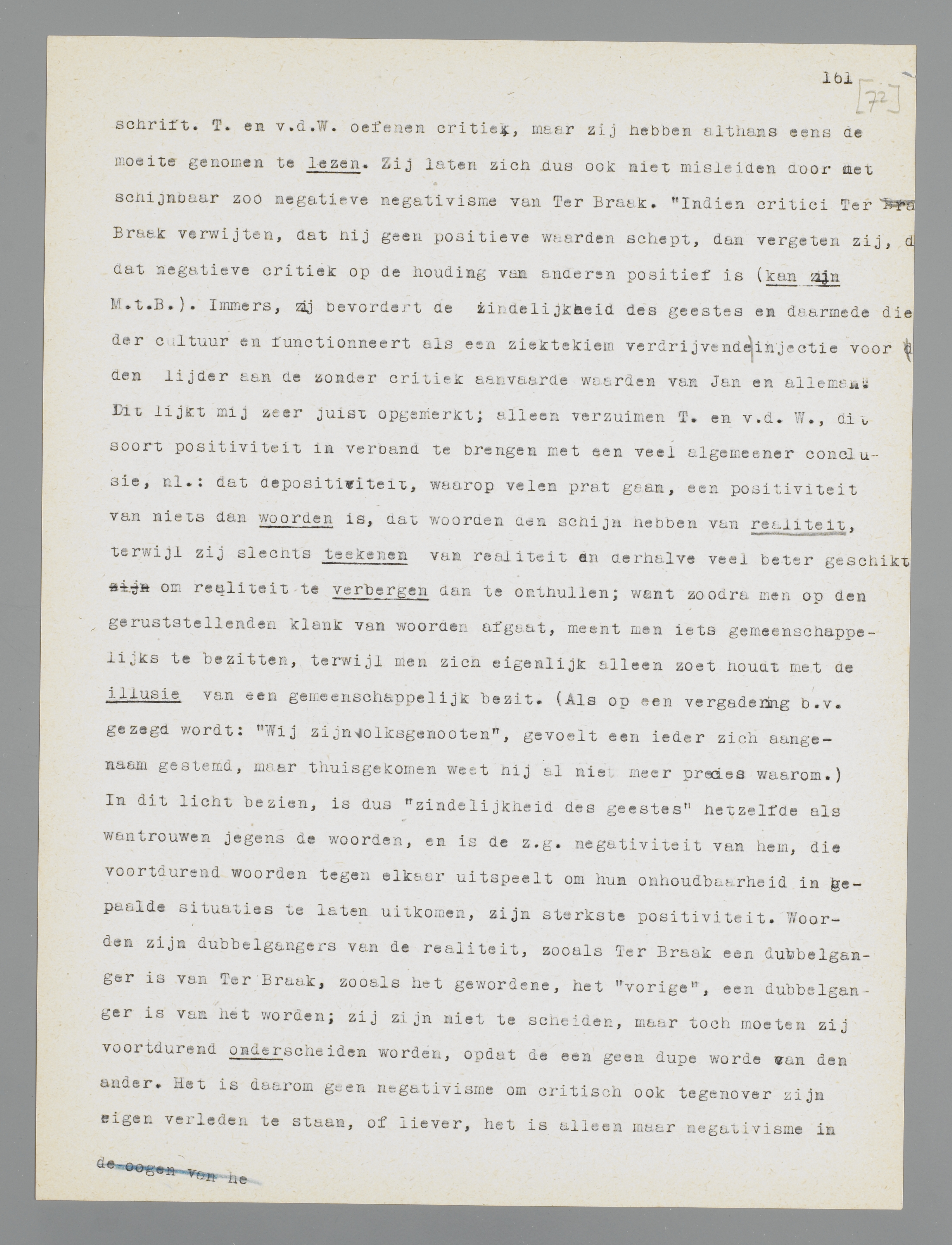 persoonlijk in te stellen op diens werken, in plaats van de verhaaltjes over zijn cynisme etc. te gaan navertellen; voor mij is dat persoonlijke vooral het sympathieke in dit geschrift. T. en v.d. W. oefenen critiek, maar zij hebben althans eens de moeite genomen te lezen. Zij laten zich dus ook niet misleiden door het schijnbaar zoo negatieve negativisme van Ter Braak. ‘Indien critici Ter Braak verwijten, dat hij geen positieve waarden schept, dan vergeten zij, dat negatieve critiek op de houding van anderen positief is (kan zijn. M.t.B.). Immers, zij bevordert de zindelijkheid des geestes en daarmede die der cultuur en functionneert als een ziektekiem verdrijvende injectie voor den lijder aan de zonder critiek aanvaarde waarden van Jan en alleman.’ Dit lijkt mij zeer juist opgemerkt; alleen verzuimen T. en v.d. W., dit soort positiviteit in verband te brengen met een veel algemeener conclusie, nl.: dat de positiviteit, waarop velen prat gaan, een positiviteit van niets dan woorden is, dat woorden den schijn hebben van realiteit, terwijl zij slechts teekenen zijn van realiteit en derhalve veel beter geschikt om realiteit te verbergen dan te onthullen; want zoodra men op den geruststellenden klank van woorden afgaat, meent men iets gemeenschappelijks te bezitten, terwijl men zich eigenlijk alleen zoet houdt met de illusie van een gemeenschappelijk bezit. (Als op een vergade-