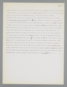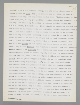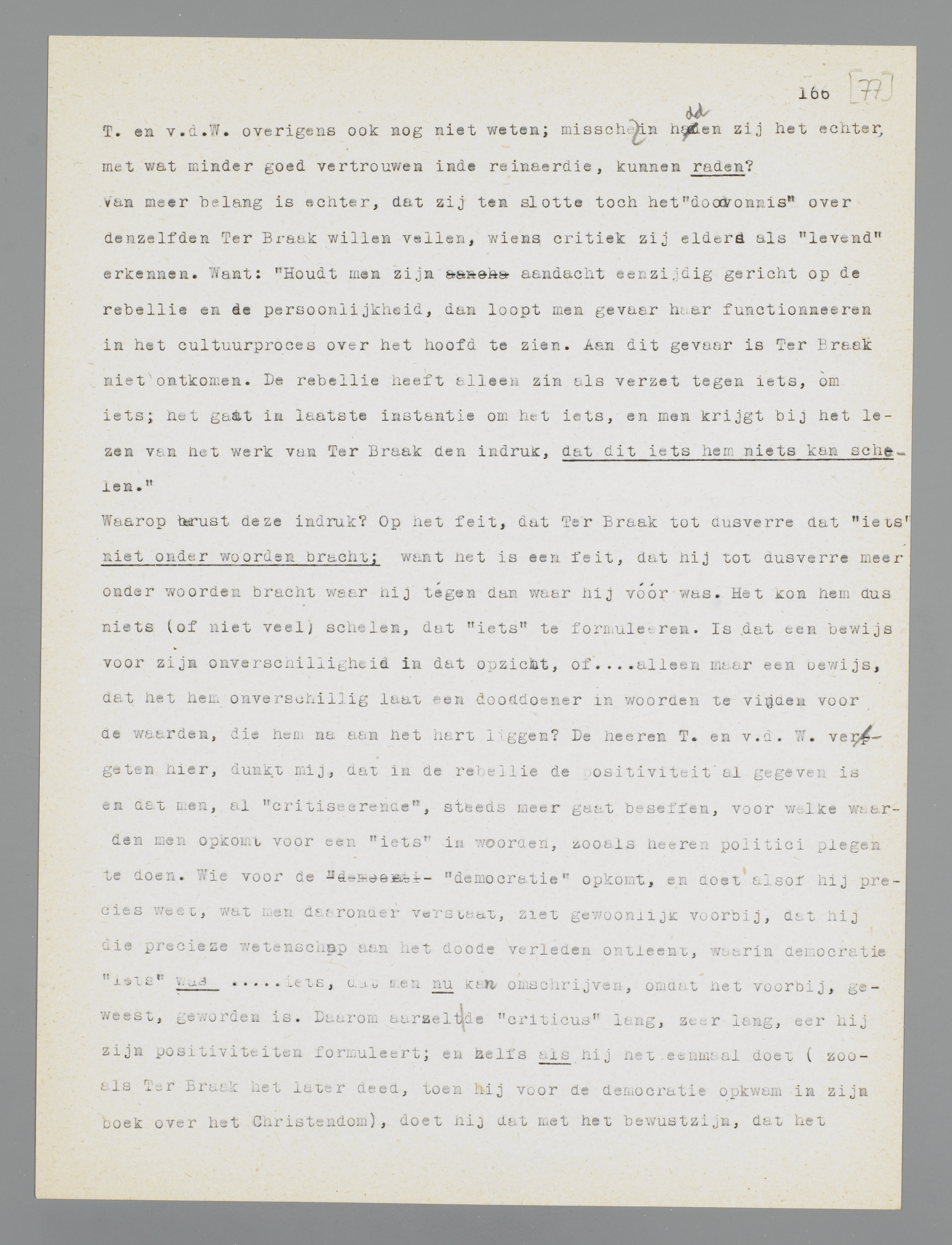 Waarop berust deze indruk? Op het feit, dat Ter Braak tot dusverre dat ‘iets’ niet onder woorden bracht; want het is een feit, dat hij tot dusverre meer onder woorden bracht waar hij tégen dan waar hij vóór was. Het kon hem dus niets (of niet veel) schelen, dat ‘iets’ te formuleeren. Is dat een bewijs voor zijn onverschilligheid in dat opzicht, of... alleen maar een bewijs, dat het hem onverschillig laat een dooddoener in woorden te vinden voor de waarden, die hem na aan het hart liggen? De heeren T. en v.d. W. vergeten hier, dunkt mij, dat in de rebellie de positiviteit al gegeven is en dat men, al ‘critiseerende’, steeds meer gaat beseffen, voor welke waarden men opkomt; dit is zeker, dat men als ‘criticus’ niet opkomt voor een ‘iets’ in woorden, zooals heeren politici plegen te doen. Wie voor de ‘democratie’ opkomt,