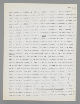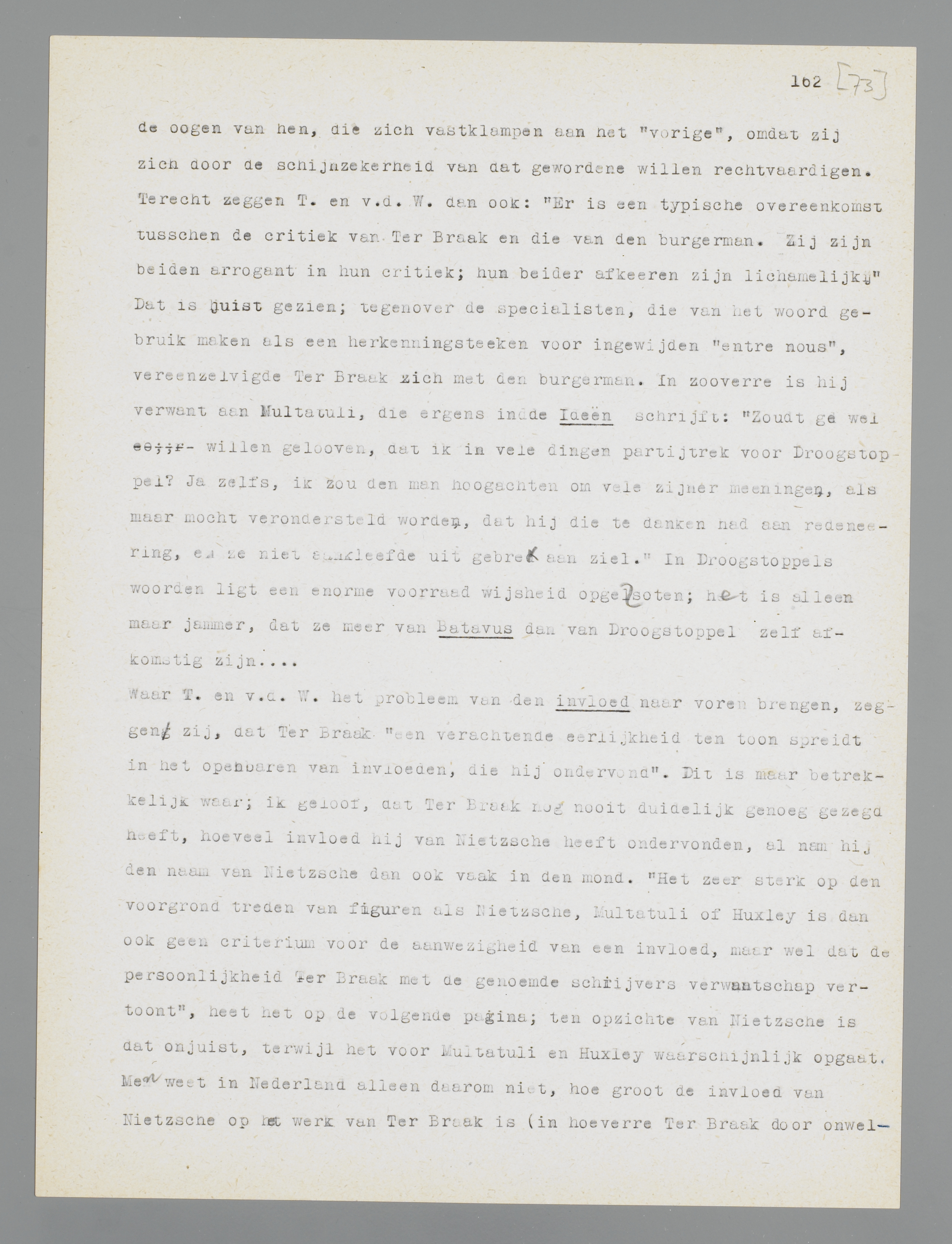Waar T. en v.d. W. het probleem van den invloed naar voren brengen, zeggen zij, dat Ter Braak ‘een verachtende eerlijkheid ten toon spreidt in het openbaren van invloeden, die hij ondervond’. Dit is maar betrekkelijk waar; ik geloof, dat Ter Braak nog nooit duidelijk genoeg gezegd heeft, hoeveel invloed hij van Nietzsche heeft ondervonden, al nam hij den naam van Nietzsche dan ook vaak in den mond. ‘Het zeer sterk op den voorgrond treden van figuren als Nietzsche, Multatuli of Huxley is dan ook geen criterium voor de aanwezigheid van een invloed, maar wel dat de persoonlijkheid Ter Braak met de genoemde schrijvers verwantschap vertoont’, heet het op de volgende pagina; ten opzichte van Nietzsche is