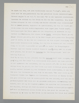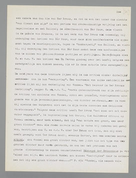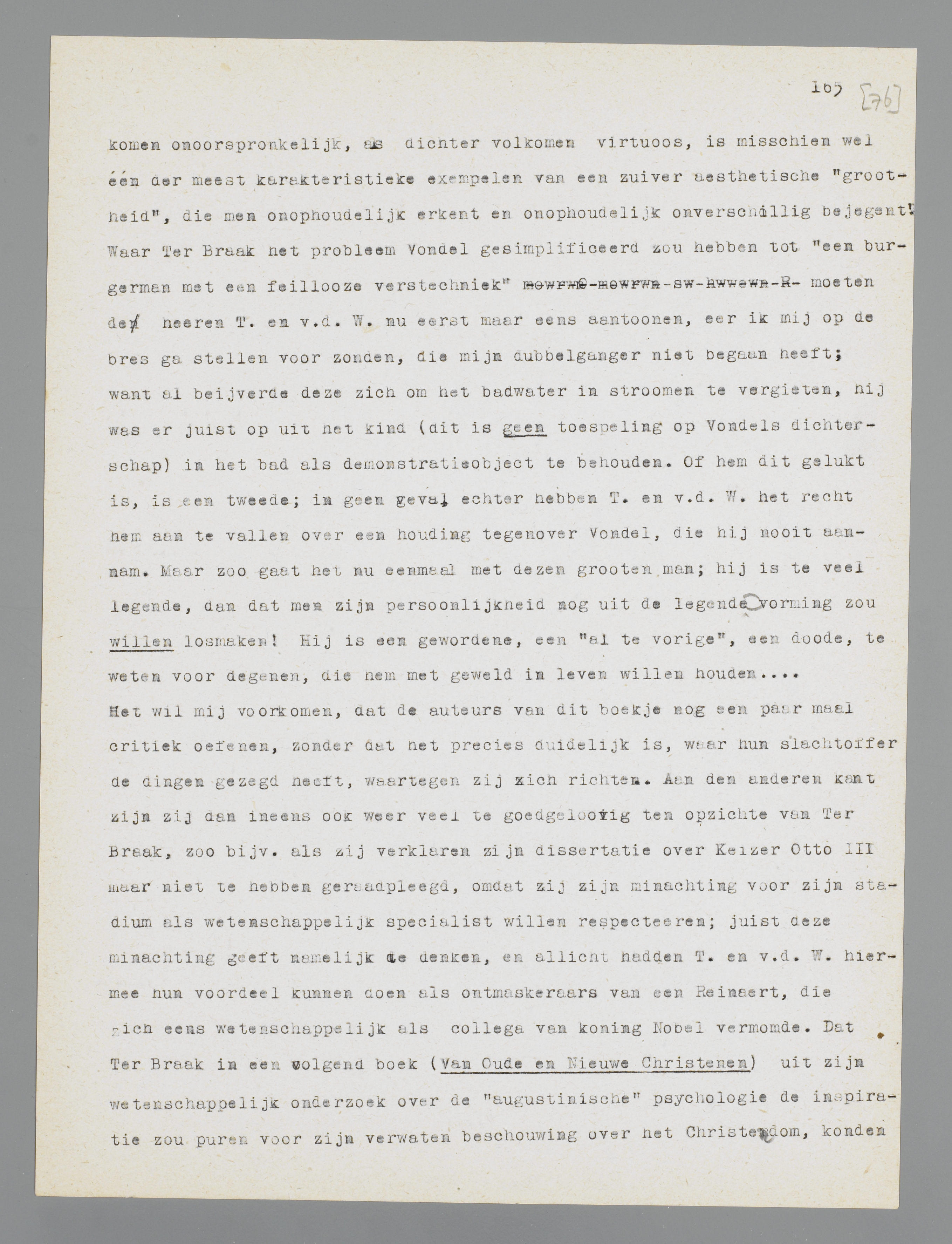Het wil mij voorkomen, dat de auteurs van dit boekje nog een paar maal critiek oefenen, zonder dat het precies duidelijk is, waar hun slachtoffer de dingen gezegd heeft, waartegen zij zich richten. Aan den anderen kant zijn zij dan ineens ook weer veel te goedgeloovig ten opzichte van Ter Braak, zoo bijv. als zij verklaren zijn dissertatie over Keizer Otto III maar niet te hebben geraadpleegd, omdat zij zijn minachting voor zijn stadium als wetenschappelijk specialist willen respecteeren; juist deze minachting geeft namelijk te denken, en allicht hadden T. en v.d. W. hiermee hun voordeel kunnen doen als ontmaskeraars van een Reinaert, die zich eens wetenschappelijk als collega van koning Nobel vermomde. Dat Ter Braak in een volgend boek (Van Oude en Nieuwe Christenen) uit zijn wetenschappelijk onderzoek over de ‘augustinische’ psychologie de inspiratie zou puren voor zijn verwaten beschouwing over het Christendom, konden T. en v.d. W. overigens ook nog niet weten; misschien hadden zij het echter, met wat minder goed vertrouwen in de reinaerdie, kunnen raden?