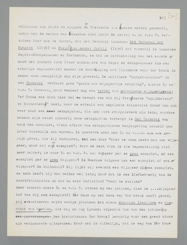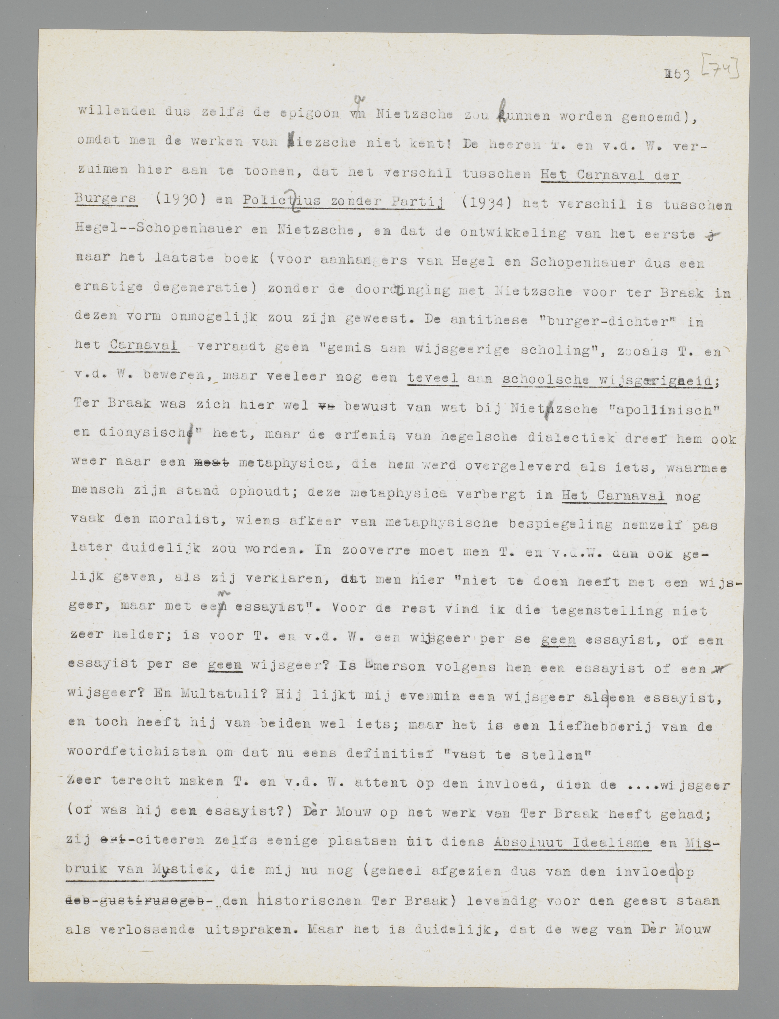 dat onjuist, terwijl het voor Multatuli en Huxley waarschijnlijk opgaat. Men weet in Nederland alleen daarom niet, hoe groot de invloed van Nietzsche op het werk van Ter Braak is (in hoeverre Ter Braak door onwelwillenden dus zelfs de epigoon van Nietzsche zou kunnen worden genoemd), omdat men de werken van Nietzsche niet kent! De heeren T. en v.d. W. verzuimen hier aan te toonen, dat het verschil tusschen Het Carnaval der Burgers (1930) en Politicus zonder Partij (1934) het verschil is tusschen Hegel - Schopenhauer en Nietzsche, en dat de ontwikkeling van het eerste naar het laatste boek (voor aanhangers van Hegel en Schopenhauer dus een ernstige degeneratie) zonder de doordringing met Nietzsche voor Ter Braak in dezen vorm onmogelijk zou zijn geweest. De antithese ‘burger-dichter’ in het Carnaval verraadt geen ‘gemis aan wijsgeerige scholing’, zooals T. en v.d. W. beweren, maar veeleer nog een teveel aan schoolsche wijsgeerigheid; Ter Braak was zich hier wel bewust van wat bij Nietzsche ‘apollinisch’ en ‘dionysisch’ heet, maar de erfenis van hegelsche dialectiek dreef hem ook weer naar een metaphysica, die hem werd overgeleverd als iets, waarmee de mensch zijn stand ophoudt; deze metaphysica verbergt in Het Carnaval nog vaak den moralist, wiens afkeer van metaphysische bespiegeling hemzelf pas later duidelijk zou worden. In zoo-