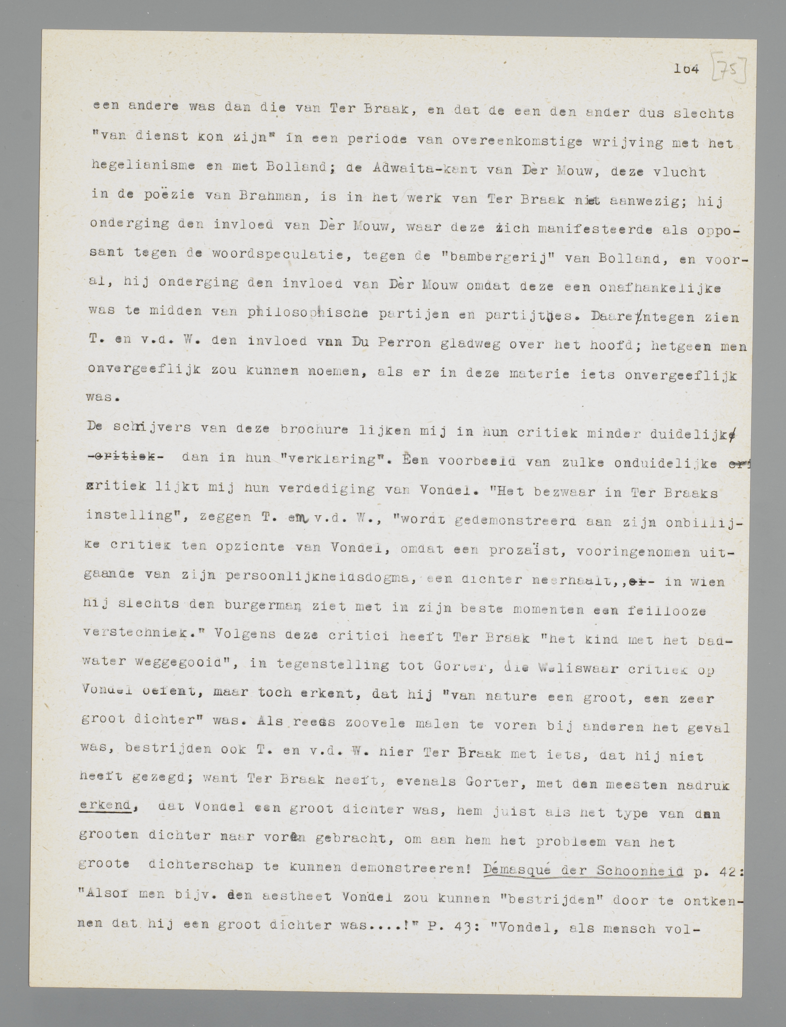 meesten nadruk erkend, dat Vondel een groot dichter was, hem juist als het type van den grooten dichter naar voren gebracht, om aan hem het probleem van het groote dichterschap te kunnen demonstreeren! Démasqué der Schoonheid p.42: ‘Alsof men bijv. den aestheet Vondel zou kunnen “bestrijden” door te ontkennen dat hij een groot dichter was...!’ P.43: ‘Vondel, als mensch volkomen onoorspronkelijk, als dichter volkomen virtuoos, is misschien wel één der meest karakteristieke exempelen van een zuiver aesthetische “grootheid”, die men onophoudelijk erkent en onophoudelijk onverschillig bejegent.’ Waar Ter Braak het probleem Vondel gesimplificeerd zou hebben tot ‘een burgerman met een feillooze verstechniek’ moeten de heeren T. en v.d. W. nu eerst maar eens aantoonen, eer ik mij op de bres ga stellen voor zonden, die mijn dubbelganger niet begaan heeft; want al beijverde deze zich om het badwater in stroomen te vergieten, hij was er juist op uit het kind (dit is geen toespeling op Vondels dichterschap) in het bad als demonstratieobject te behouden. Of hem dit gelukt is, is een tweede; in geen geval echter hebben T. en v.d. W. het recht hem aan te vallen over een houding tegenover Vondel, die hij nooit aannam. Maar zoo gaat het nu eenmaal met dezen grooten man; hij is te veel legende, dan dat men zijn persoonlijkheid nog uit de legende-