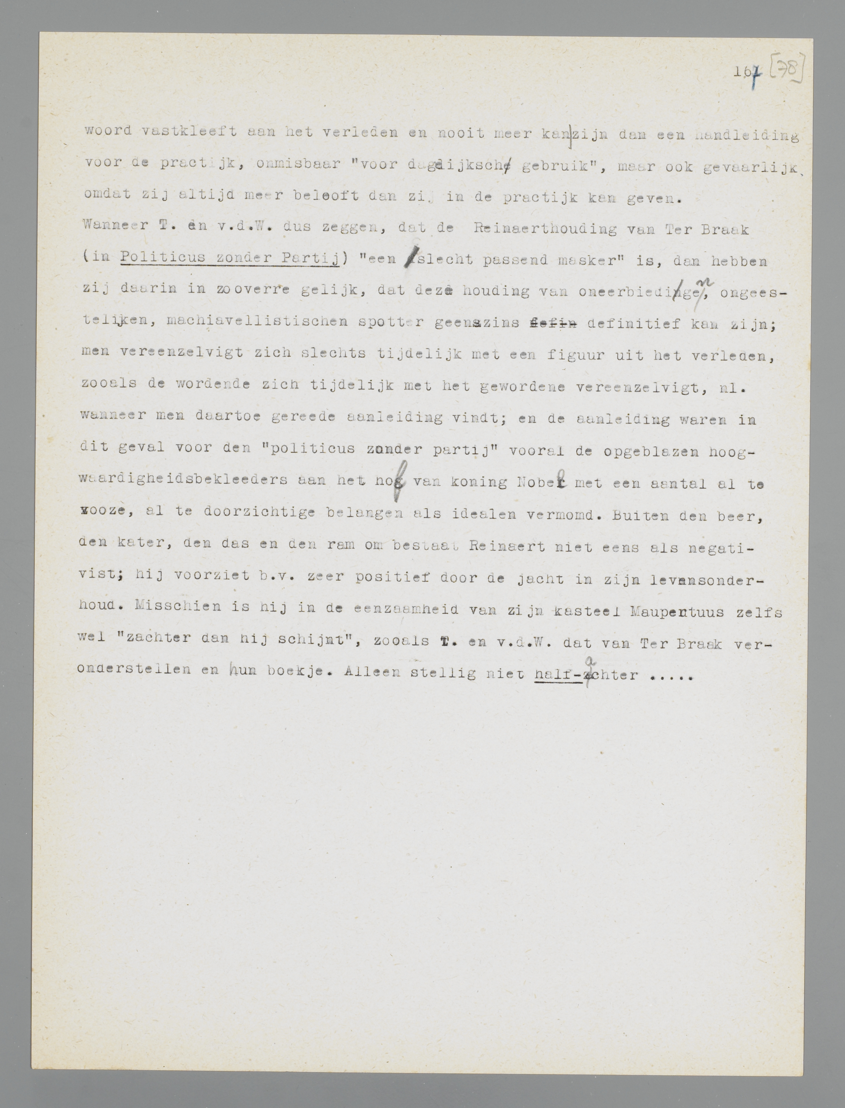 Wanneer T. en v.d. W. dus zeggen, dat de Reinaerthouding van Ter Braak (in Politicus zonder Partij) ‘een slecht passend masker’ is, dan hebben zij daarin in zooverre gelijk, dat deze houding van oneerbiedigen, ongeestelijken, machiavellistischen spotter geenszins definitief kan zijn; men vereenzelvigt zich slechts tijdelijk met een figuur uit het verleden, zooals de wordende zich tijdelijk met het gewordene vereenzelvigt, nl. wanneer men daartoe gereede aanleiding vindt; en de aanleiding waren in dit geval voor den ‘politicus zonder partij’ vooral de opgeblazen hoogwaardigheidsbekleeders aan het hof van koning Nobel