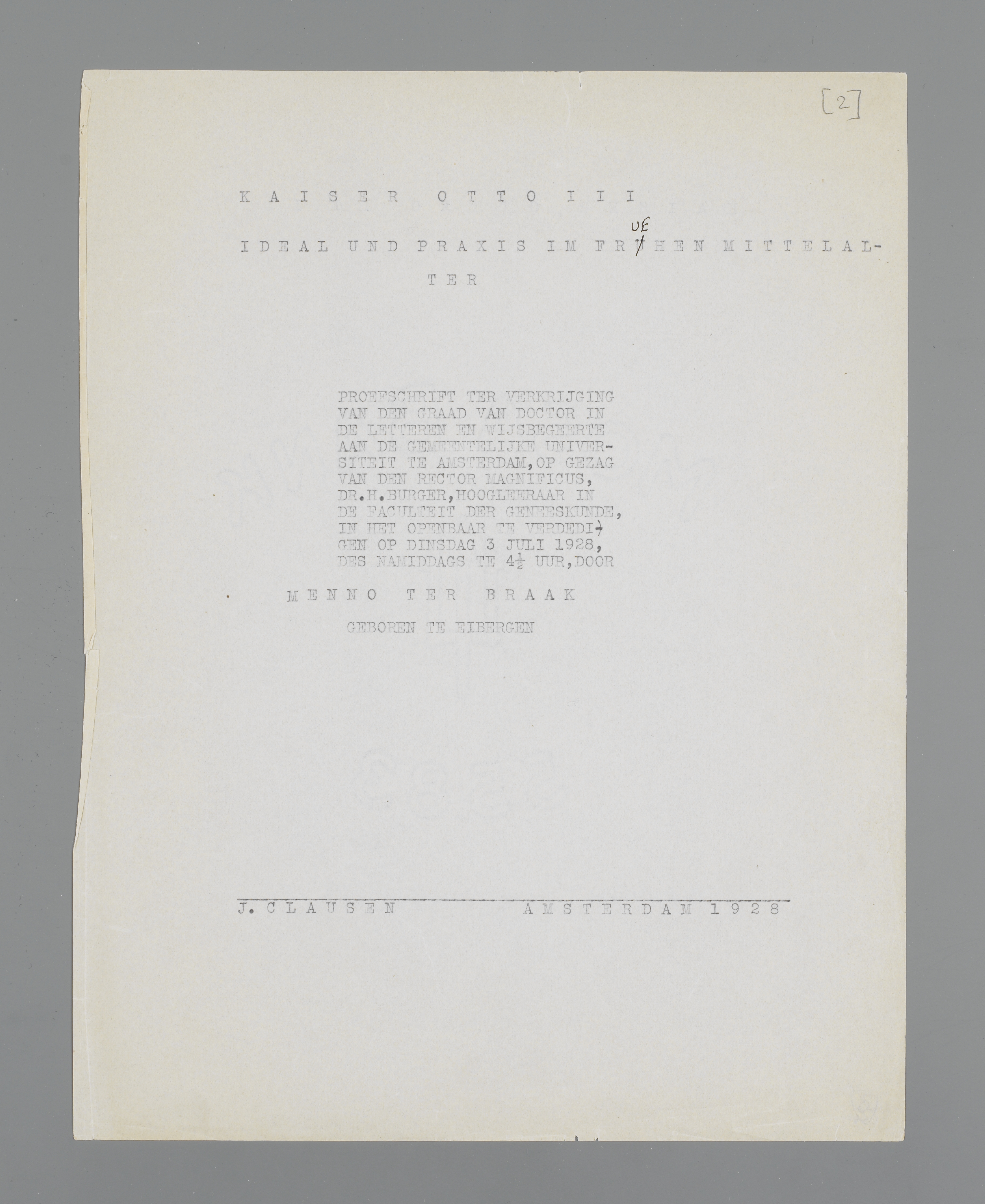Tenslotte: dat een belangrijk deel van mijn typographische zorgen door hulpvaardige handen werden verlicht, dank ik aan mijn vaderlijke vrienden, de Heeren CLAUSEN en HERTEL, wier omvangrijke technische kennis ik bij deze gelegenheid niet voor de eerste maal op de proef mocht stellen.