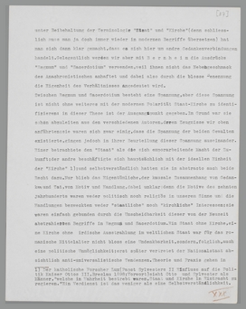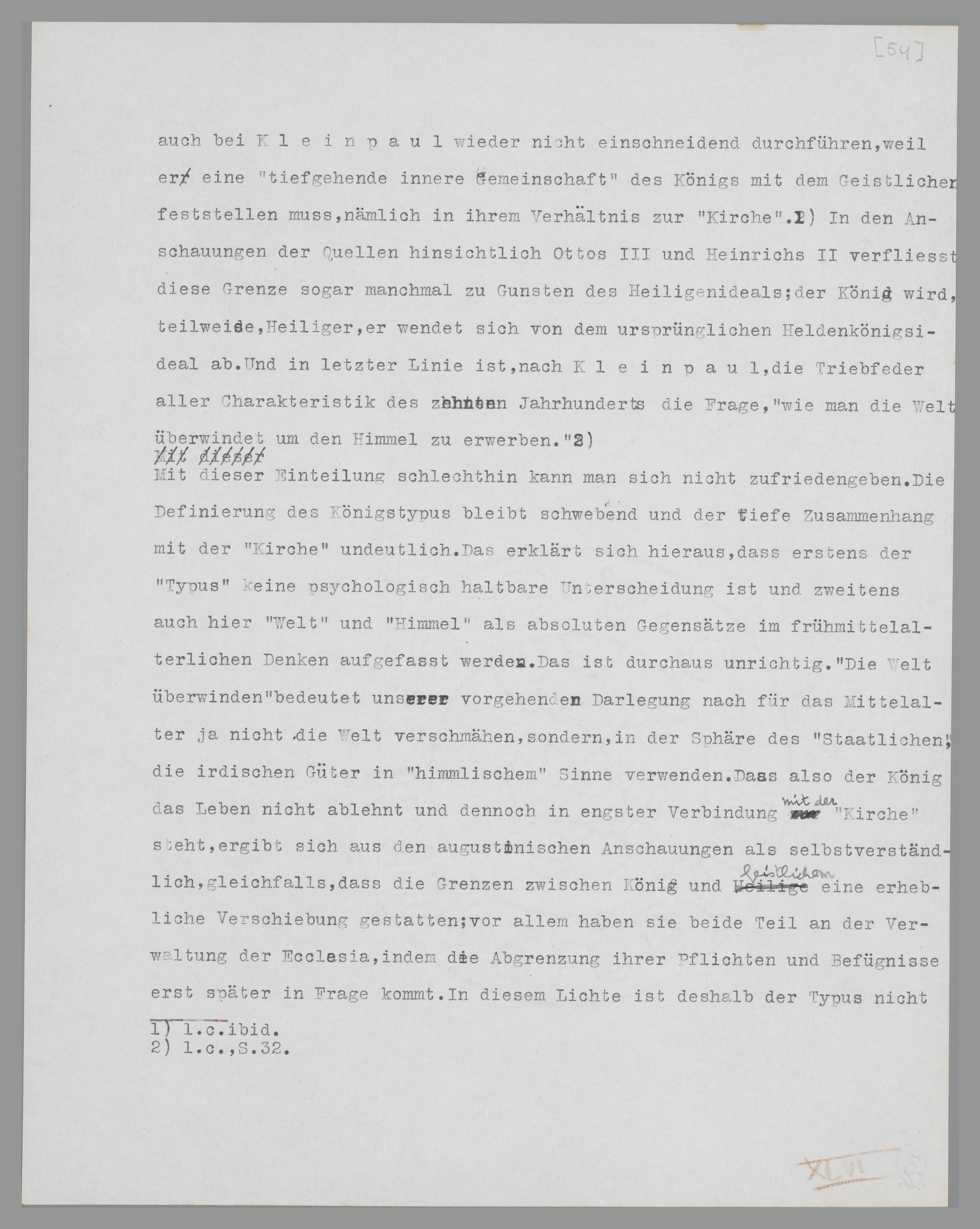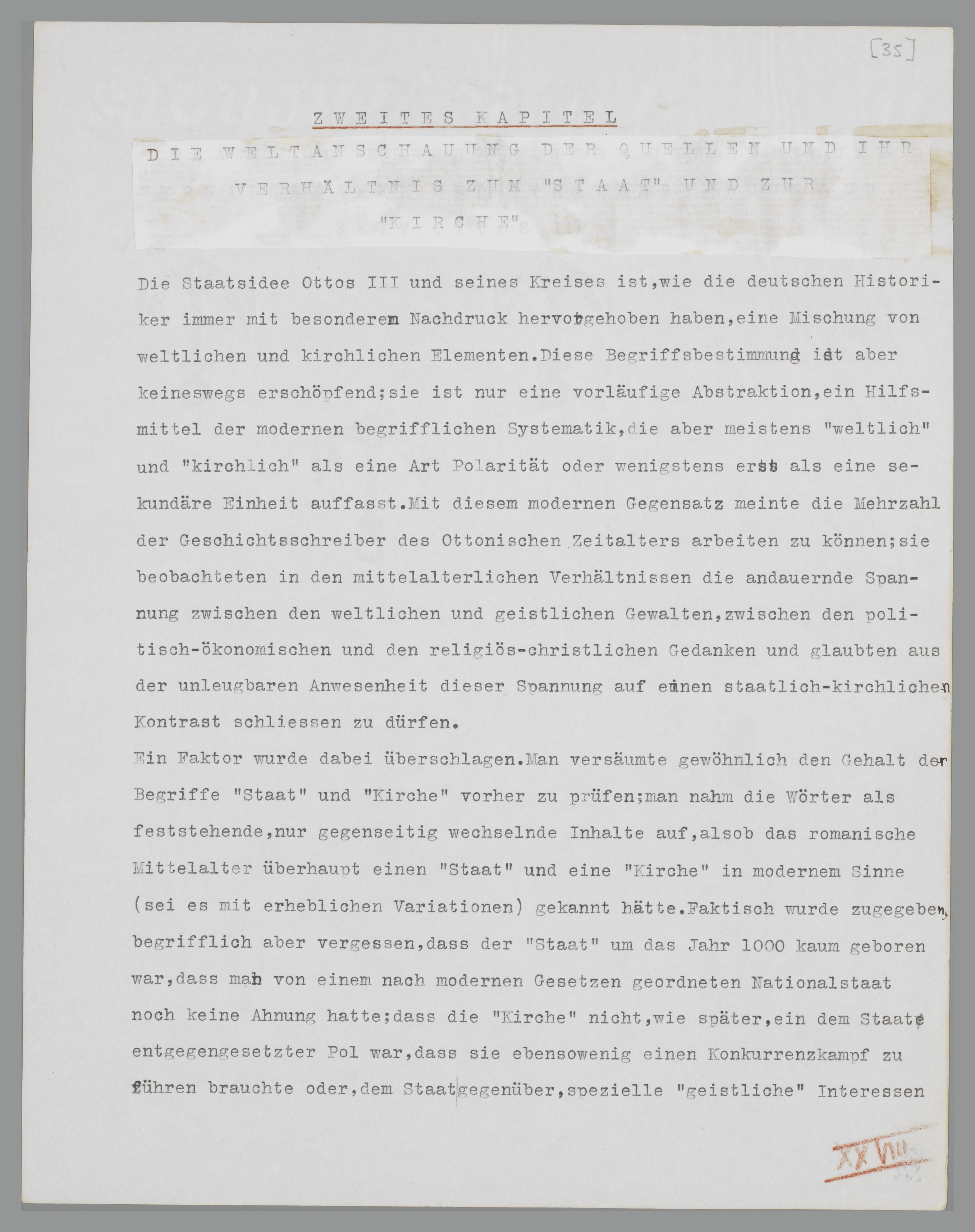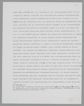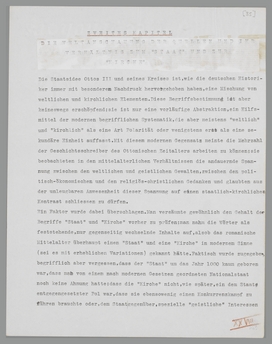 Ein Faktor wurde dabei übersehen. Man versäumte gewöhnlich den Gehalt der Begriffe ‘Staat’ und ‘Kirche’ vorher zu prüfen; man nahm die Wörter als feststehende, nur gegenseitig wechselnde Inhalte auf, als ob das romanische Mittelalter überhaupt einen ‘Staat’ und eine ‘Kirche’ in modernem Sinne (sei es mit erheblichen Variationen) gekannt hätte. Faktisch wurde zugegeben, begrifflich aber vergessen, dass der ‘Staat’ um das Jahr 1000 kaum geboren war,