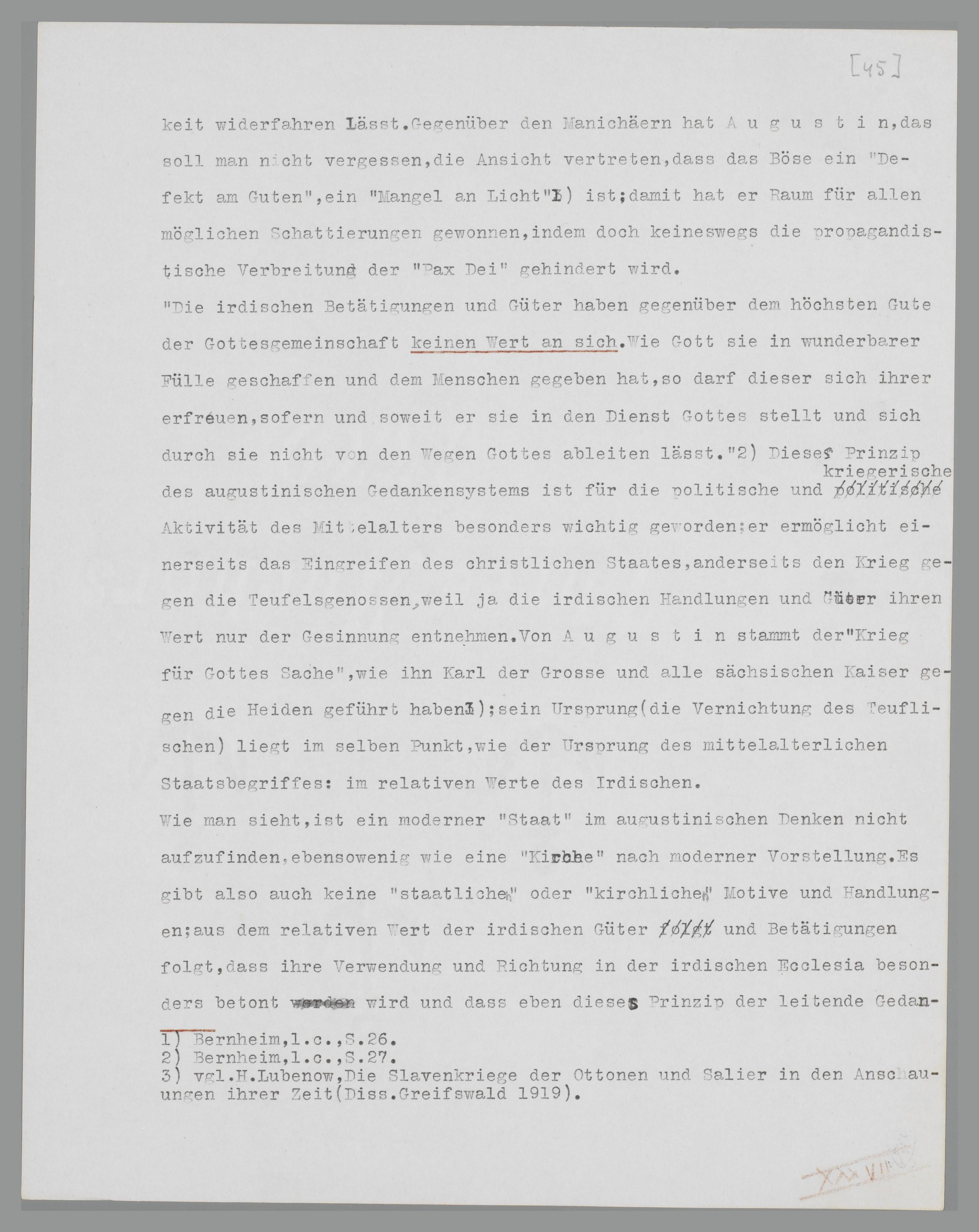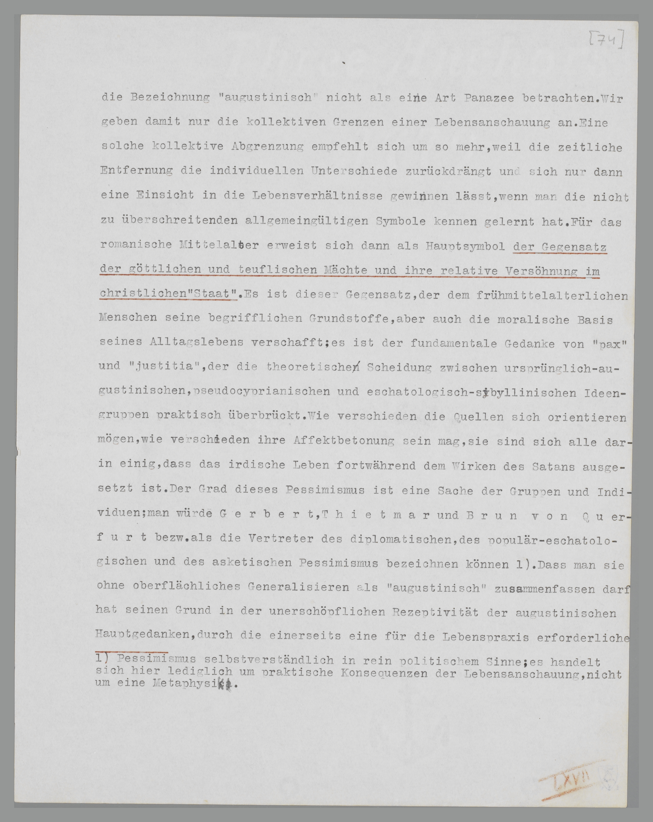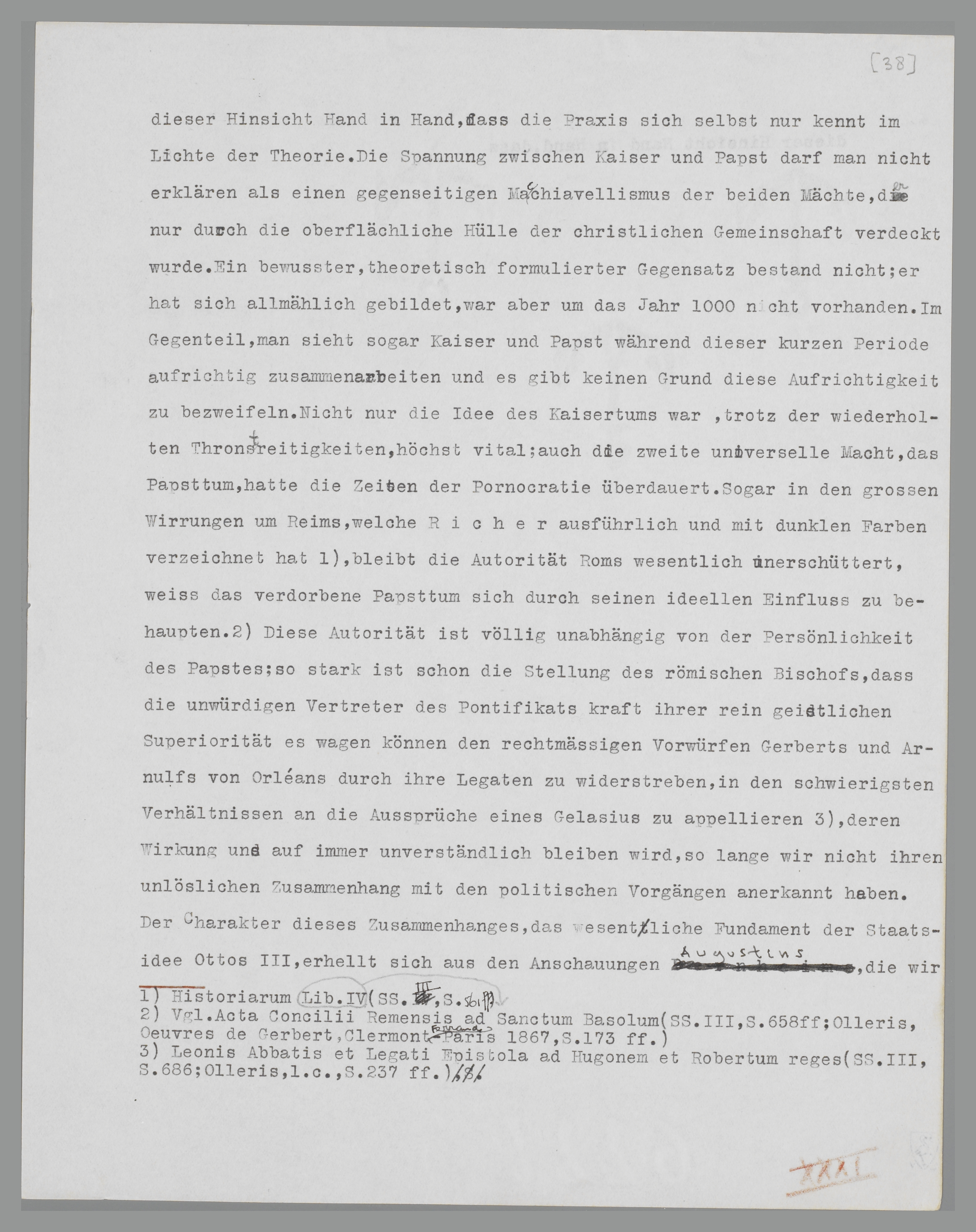 Pontifikats kraft seiner rein geistlichen Superiorität es wagen kann, den rechtmässigen Vorwürfen Gerberts und Arnulfs von Orléans zu widerstreben, in den schwierigsten Verhältnissen an die Aussprüche eines Gelasius zu appelieren62, deren Wirkung uns auf immer unverständlich bleiben wird, solange wir nicht ihren unlöslichen Zusammenhang mit den politischen Vorgängen anerkannt haben. Der Charakter dieses Zusammenhanges, das wesentliche Fundament der ‘Staats’idee Ottos III., erklärt sich aus den Anschauungen Augustins, die wir hier deshalb unter dem neuen Aspekt der Theorie Bernheims kurz überblicken wollen.