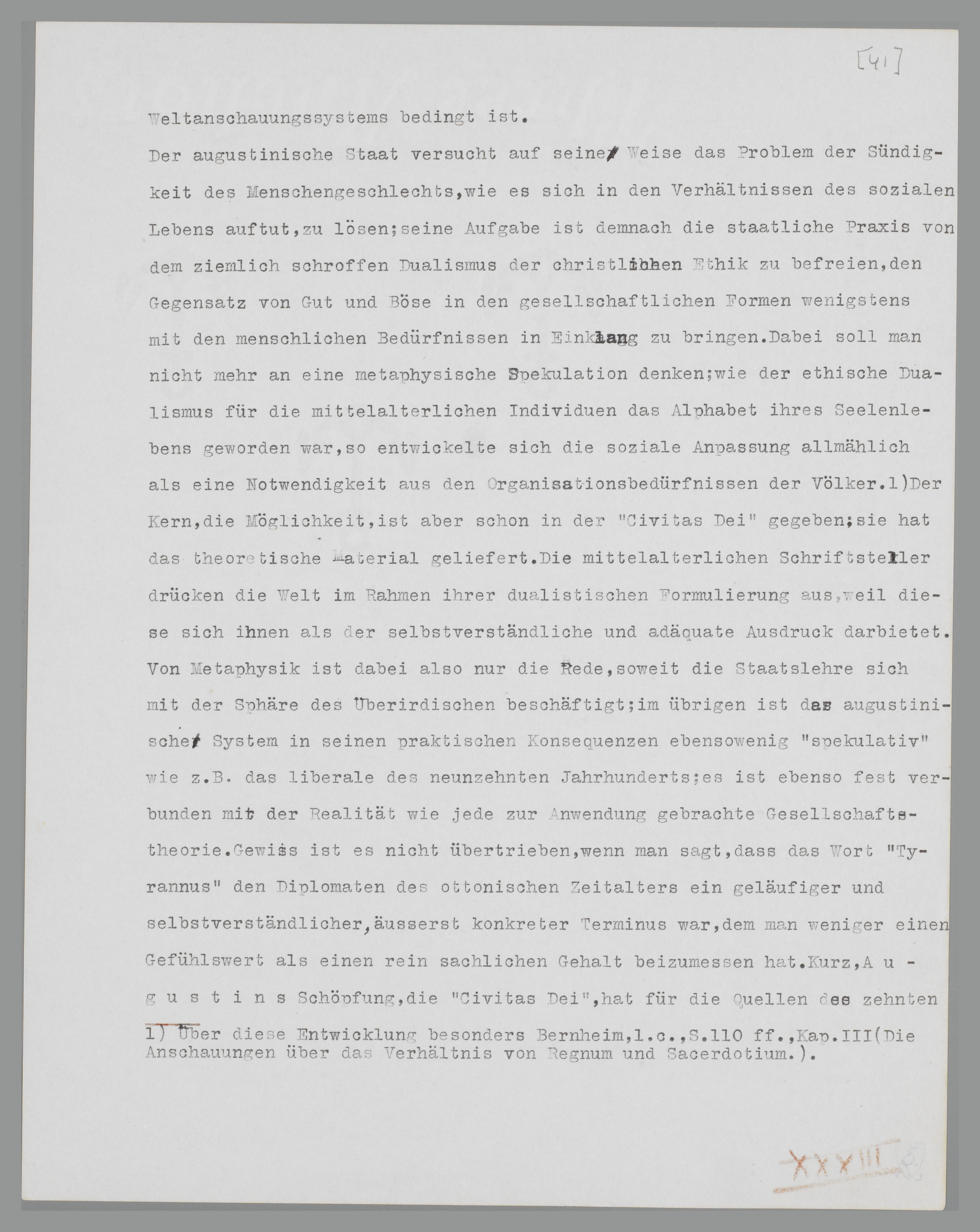 Der augustinische ‘Staat’ versucht auf seine Weise das Problem der Sündigkeit des Menschengeschlechts, wie es sich in den Verhältnissen des sozialen Lebens zeigt, zu lösen; seine Aufgabe ist demnach, die staatliche Praxis von dem ziemlich schroffen Dualismus der christlichen Ethik zu befreien, den Gegensatz von Gut und Böse in den gesellschaftlichen Formen wenigstens mit den menschlichen Bedürfnissen in Einklang zu bringen. Dabei soll man nicht mehr an eine metaphysische Spekulation denken; wie der ethische Dualismus für die mittelalterlichen Individuen das Alphabet ihres Seelenlebens geworden war, so entwickelte sich die soziale Anpassung allmählich als eine Notwendigkeit aus den Organisationsbedürfnissen der Völker.64 Der Kern, die Möglichkeit, ist aber schon in der ‘Civitas Dei’ gegeben; sie hat das theoretische Material geliefert. Die mittelalterlichen Schriftsteller drücken die Welt mit Hilfe ihrer dualistischen Formulierung aus, weil diese sich als der selbstverständliche und adäquate Ausdruck darbietet. Von Metaphysik ist dabei also nur die Rede, soweit die ‘Staats’lehre sich mit der Sphäre des Ueberirdischen beschäftigt; im