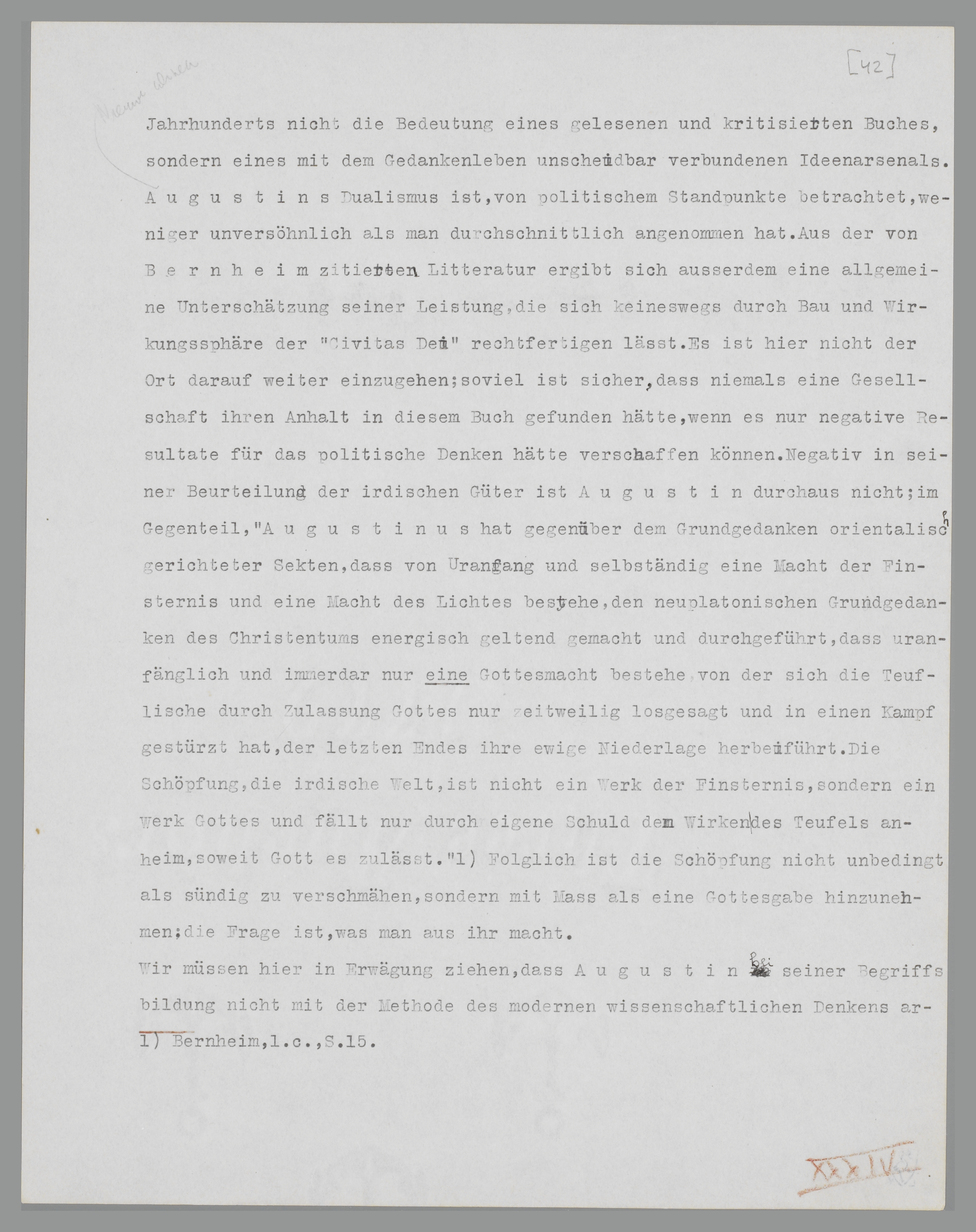 Augustins Dualismus ist, von politischem Standpunkte betrachtet, weniger unversöhnlich als man durchschnittlich angenommen hat. In der von Bernheim zitierten Litteratur kommt ausserdem eine allgemeine Unterschätzung der Leistung des Denkers ans Licht, die sich keineswegs durch Bau und Wirkungssphäre der ‘Civitas Dei’ rechtfertigen lässt. Es ist hier nicht der Ort, darauf weiter einzugehen; soviel ist sicher, dass niemals eine Gesellschaft ihren Anhalt in diesem Buch gefunden hätte, wenn es nur negative Resultate für das politische Denken hätte verschaffen können. Negativ in seiner Beurteilung der irdischen Güter ist Augustin durchaus nicht; im Gegenteil, ‘Augustinus hat gegenüber dem Grundgedanken orientalisch gerichteter Sekten, dass von Uranfang und selbständig eine Macht der Finsternis und eine Macht des Lichtes bestehe, den neuplatonischen Grundgedanken des Christentums energisch geltend gemacht und durchgeführt, dass uranfänglich und immerdar nur eine Gottesmacht bestehe, von der sich die teuflische durch Zulassung Gottes nur zeitweilig losgesagt und in einen Kampf gestürzt hat, der letzten Endes ihre ewige Niederlage herbeiführt. Die Schöpfung, die irdische Welt, ist nicht ein Werk der Fin-