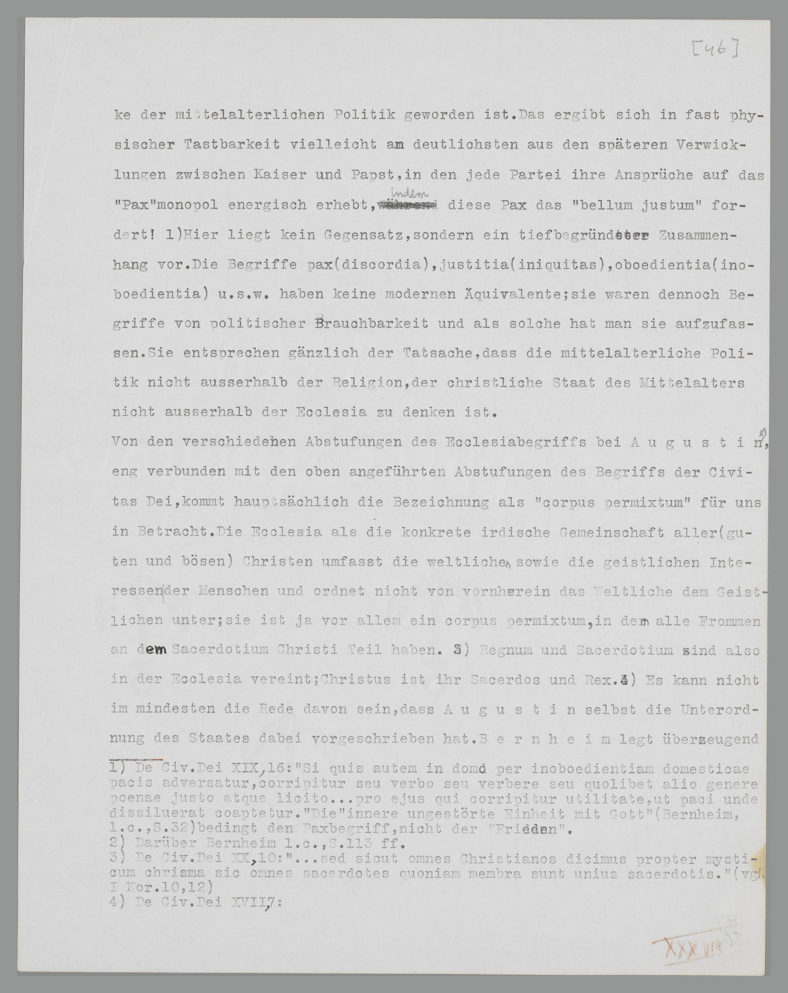 Wie man sieht, ist ein moderner ‘Staat’ im augustinischen Denken nicht aufzufinden, ebensowenig wie eine ‘Kirche’ nach moderner Vorstellung. Es gibt also auch keine ‘staatlichen’ oder ‘kirchlichen’ Motive und Handlungen; aus dem relativen Wert der irdischen Güter und Betätigungen folgt, dass ihre Verwendung und Richtung in der irdischen Ecclesia besonders betont wird, dass eben dieses Prinzip der leitende Gedanke der mittelalterlichen Politik geworden ist. Das ergibt sich in fast physischer Tastbarkeit vielleicht am deutlichsten bei den späteren Verwicklungen zwischen Kaiser und Papst, in denen jede Partei ihre Ansprüche auf das ‘Pax’monopol energisch erhebt, da diese Pax das ‘bellum justum’ fordert!76 Hier liegt kein Gegensatz, sondern ein tiefbegründeter Zusammenhang vor. Die Begriffe pax (discordia), justitia (iniquitas), oboedientia (inoboedientia) u.s.w. haben keine modernen Aequivalente; sie waren dennoch Begriffe von politischer Brauchbarkeit und als solche hat man sie aufzufassen. Sie entsprechen gänzlich der Tatsache, dass die mittelalterliche Politik nicht ausserhalb der ‘Religion’, der christliche ‘Staat’ des Mittelalters nicht ausserhalb der Ecclesia zu denken ist.