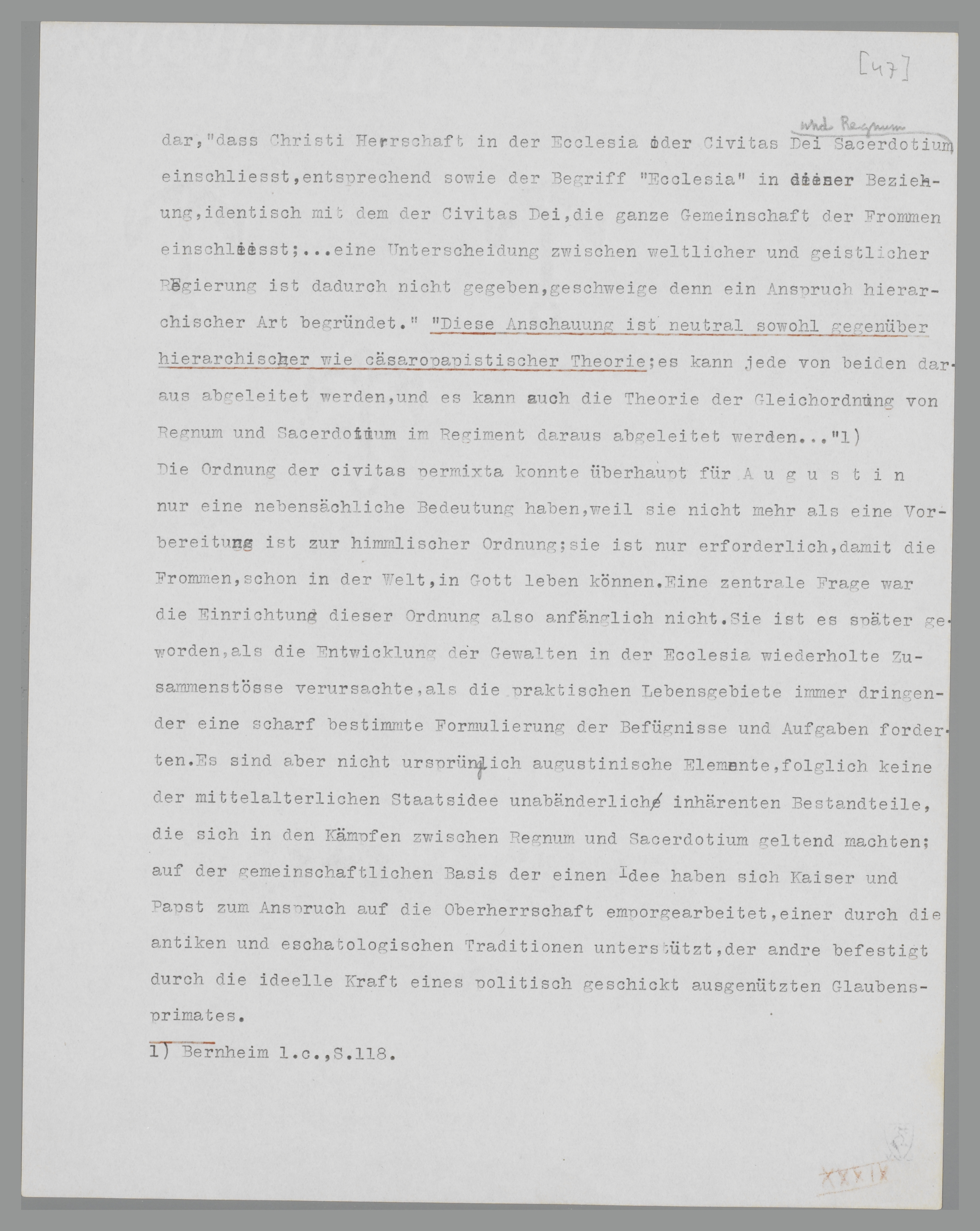 Ordnung; sie ist nur erforderlich, damit die Frommen schon in der Welt in Gott leben können. Eine zentrale Frage war die Einrichtung dieser Ordnung also anfänglich nicht. Sie ist es später geworden, als die Entwicklung der Gewalten in der Ecclesia wiederholte Zusammenstösse verursachte, als die praktischen Lebensgebiete immer dringender eine scharf bestimmte Formulierung der Befugnisse und Aufgaben forderten. Es sind aber nicht ursprünglich augustinische Elemente, folglich keine der mittelalterlichen Ecclesia-idee unabänderlich inhärenten Bestandteile, die sich in den Kämpfen zwischen Regnum und Sacerdotium geltend machten; auf der gemeinschaftlichen Basis der einen Idee haben sich Kaiser und Papst zum Anspruch auf die Oberherrschaft emporgearbeitet, einer durch die antiken und eschatologischen Traditionen unterstützt, der andere befestigt durch die ideelle Kraft eines politisch geschickt ausgenützten Glaubensprimates.