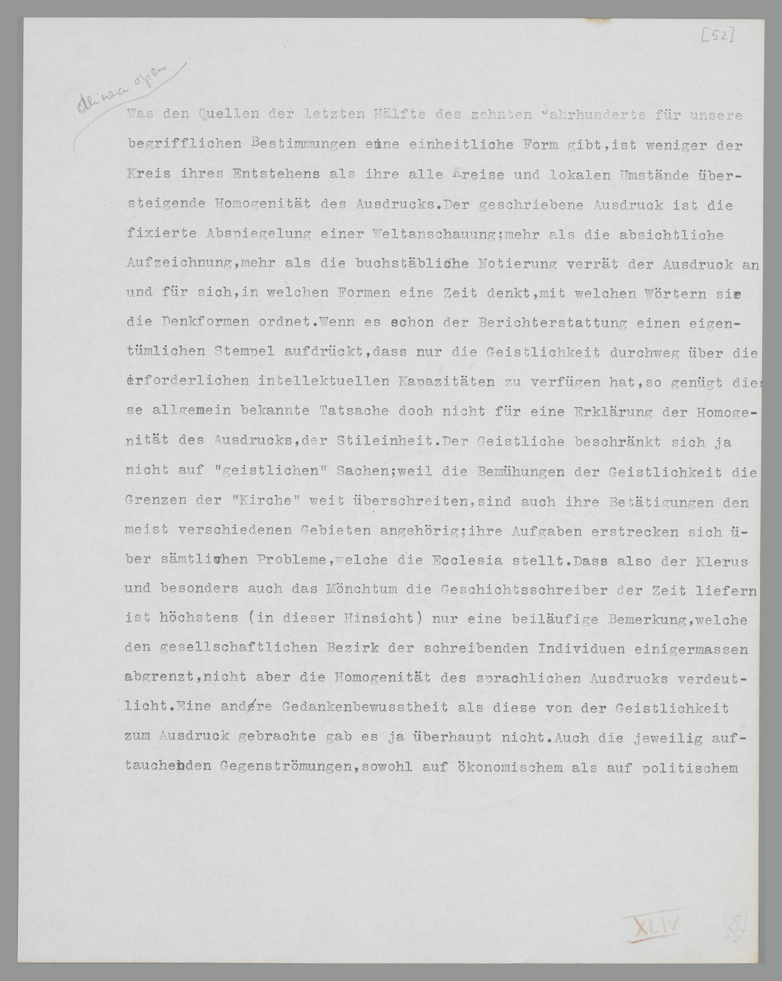 denkt, mit welchen Worten sie die Denkformen materialisiert. Wenn es schon der Berichterstattung einen eigentümlichen Stempel aufdrückt, dass durchweg nur die Geistlichkeit über die erforderlichen intellektuellen Kapazitäten zu verfügen hat, so genügt diese allgemein bekannte Tatsache doch nicht für eine Erklärung der Homogenität des Ausdrucks, der Stileinheit. Der Geistliche beschränkt sich ja nicht auf ‘geistliche’ Sachen; da die Bemühungen der Geistlichkeit die Grenzen der ‘Kirche’ weit überschreiten, sind auch ihre Betätigungen den verschiedensten Gebieten angehörig; ihre Aufgaben erstrecken sich über sämtliche Probleme, welche die Ecclesia stellt. Dass also der Klerus und besonders auch das Mönchtum die Geschichtsschreiber der Zeit liefert, ist höchtstens (in dieser Hinsicht) nur eine beiläufige Bemerkung, welche den gesellschaftlichen Bezirk der schreibenden Individuen einigermassen abgrenzt, nicht aber die Homogenität des sprachlichen Ausdrucks erklärt. Eine andere Gedankenbewusstheit als diese von der Geistlichkeit zum Ausdruck gebrachte, gab es ja überhaupt nicht. Auch die jeweilig auftauchenden Gegenströmungen, sowohl auf ökonomischem als auf politischem oder religiösem Gebiete88, zeigen dieselben Formen des Bewusstwerdens, verkleiden ihre Tendenzen unter dieselben Begriffe; sie weichen nur inhaltlich, nicht formal, von den offiziellen Strömungen ab. Wir dürfen sagen, dass die ‘Opposition’ während der Regierung Ottos III. keine einzige schriftliche Tradition zurückgelassen hat,