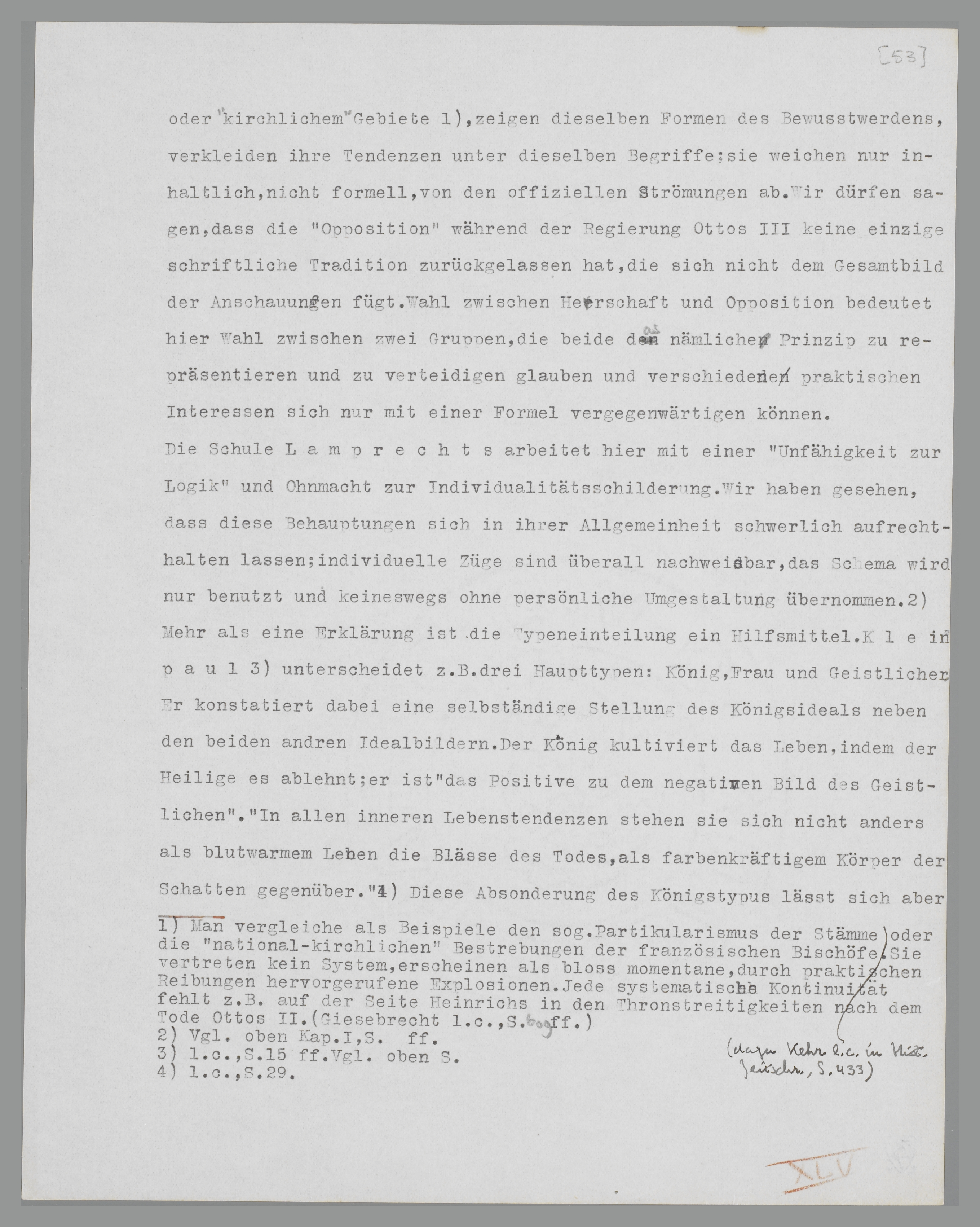 dass man von einem nach modernen Gesetzen geordneten Nationalstaat noch keine Ahnung hatte; dass die ‘Kirche’ nicht, wie später, ein dem ‘Staat’ entgegengesetzter Pol war, dass sie ebensowenig einen Konkurrenzkampf zu führen brauchte oder, dem Staat gegenüber, spezielle ‘geistliche’ Interessen verfolgen musste. Denn alle diese Ausdrücke vertreten durchaus moderne Werte; und man irrt sich wenn man das unter Hinweis auf das Allgemeinmenschliche dieser Gegensätze ignoriert. Es bleiben ganze Tatsachen- und Gedankengruppen unerklärt, wenn man auf die Formunterschiede keine Rücksicht nimmt; und man wird nicht mit Unrecht viele der herrschenden anachronistischen Vorstellungen auf diese ungenaue Definition der Grundbegriffe zurückführen müssen. Von Eicken, der ‘die Verneinung des Irdischen als das Prinzip der mittelalterlichen Sittenlehre’ ansieht57, schliesst, wie Bernheim eingesehen hat58, die Möglichkeit einer richtigen Interpretation der christlichmittelalterlichen Staatsanschauungen aus; wie soll man sich einen Staat denken, der sich selbst organisieren und im nämlichen Augenblick verneinen muss! Der Gedanke wäre schon im voraus unwahrscheinlich, weil es gerade eine Eigentümlichkeit des ‘Staates’ ist, sich in seinen moralischen Grundlagen auf die gangbaren ‘kirchlichen’ Ideen zu stützen. Auch wenn man also annimmt, dass in den Menschen aller Zeiten analoge Triebe bestehen, dass analoge Leidenschaften die Entwicklung der geschichtlichen Gruppierungen verursachen, hat man damit über die Form dieser Gruppierungen noch nichts gesagt; der Verneinungstrieb, die Verschmähung des Irdischen im asketischen Akt z.B., die wir bei Otto III. so stark ausgeprägt finden, sind für die heutige Gesellschaft als anti-sozial zu bezeichnen,