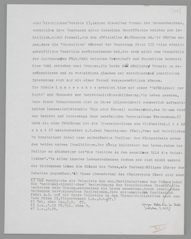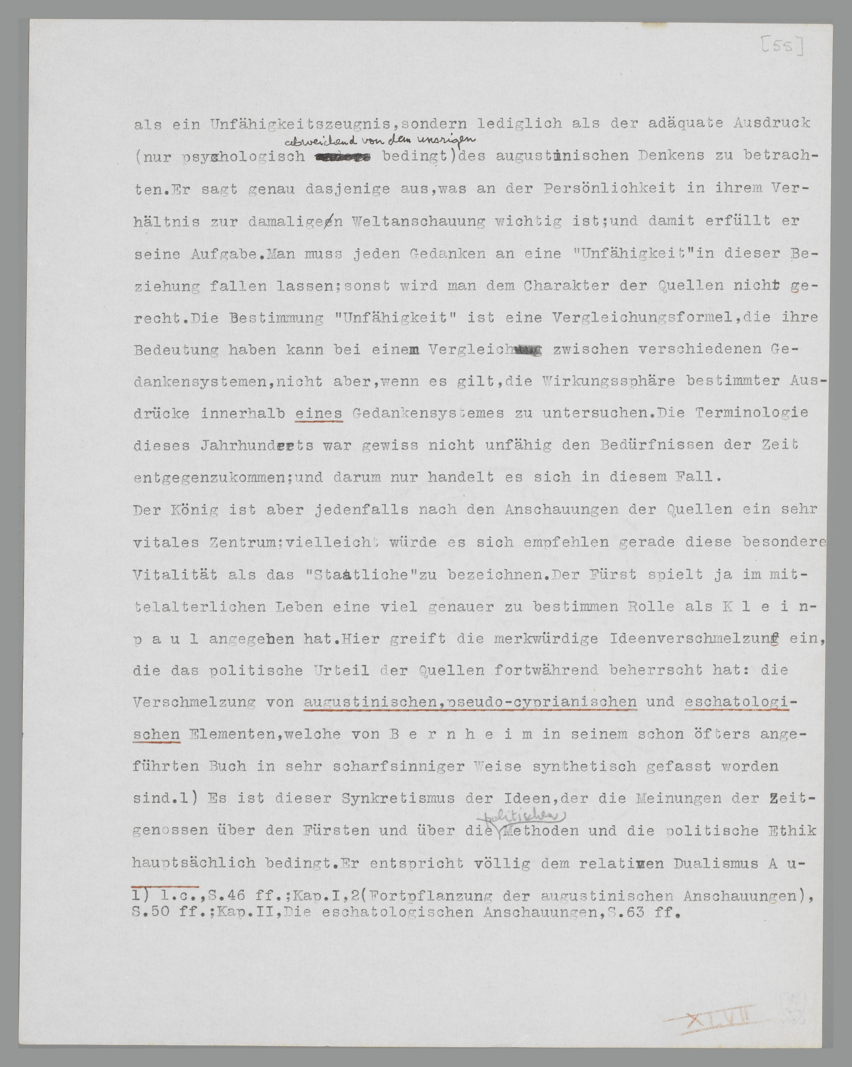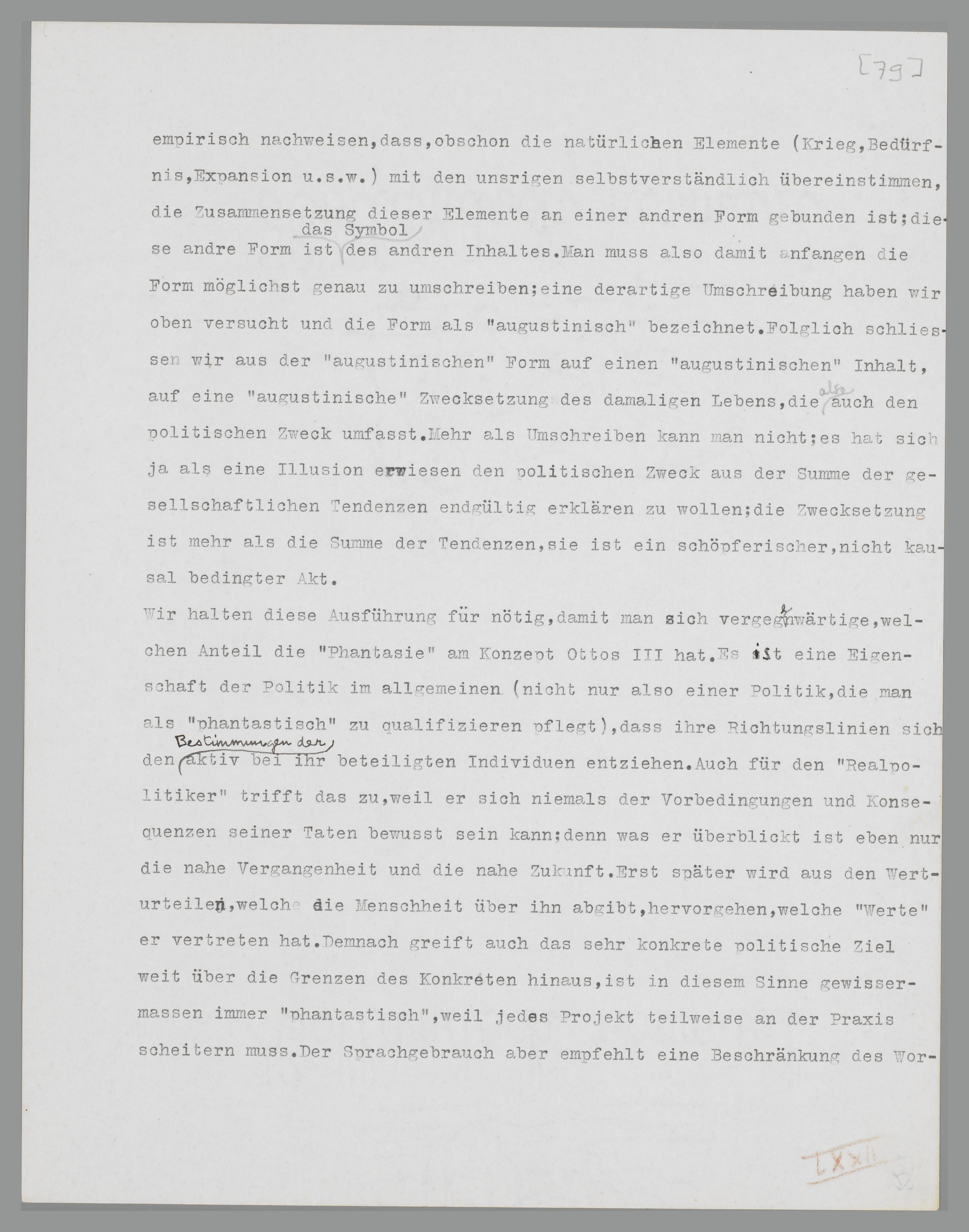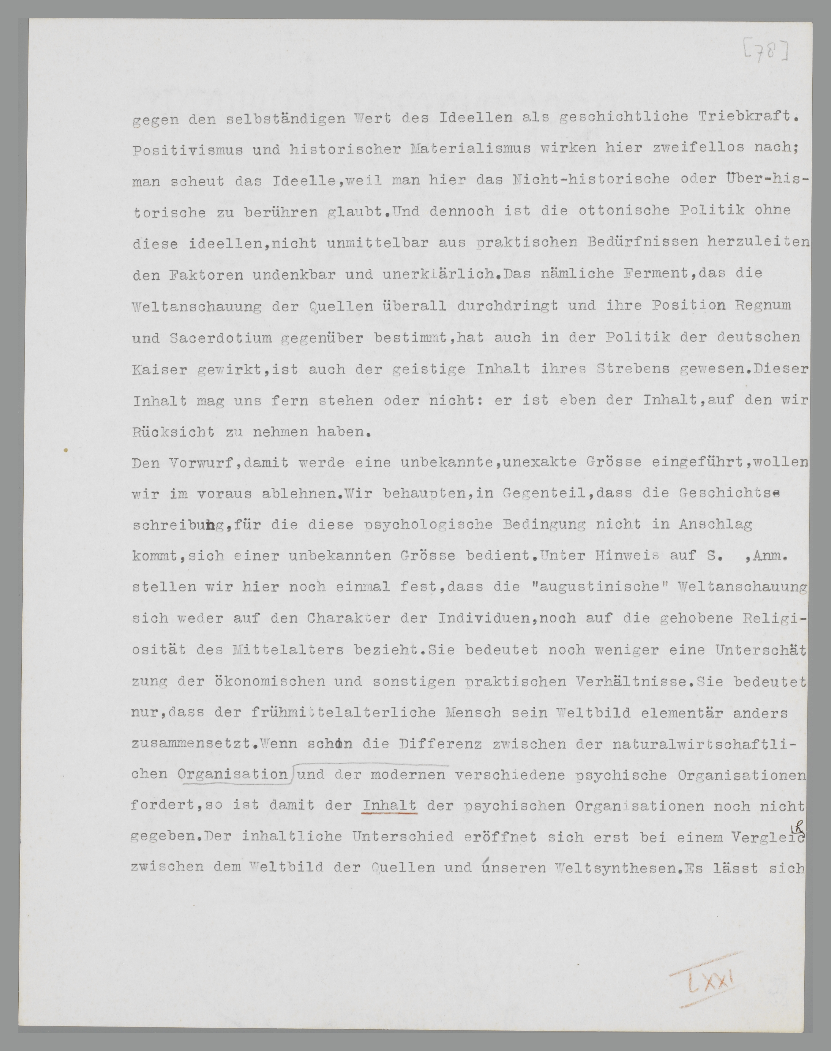 sich einer unbekannten Grösse bedient. Unter Hinweis auf S. 55, Anm. 1, stellen wir hier noch einmal fest, dass die ‘augustinische’ Weltanschauung sich weder auf den Charakter der Individuen, noch auf die gehobene Religiosität des Mittelalters bezieht. Sie bedeutet noch weniger eine Unterschätzung der ökonomischen und sonstigen praktischen Verhältnisse. Sie bedeutet nur, dass der frühmittelalterliche Mensch sein Weltbild elementar anders zusammensetzt. Wenn schon die Differenz zwischen der naturalwirtschaflichen und der modernen Organisation der Gesellschaft verschiedene psychische Organisationen fordert, so ist damit die Form dieser psychischen Organisationen noch nicht gegeben. Der formale Unterschied eröffnet sich erst bei einem Vergleich zwischen dem Weltbild der Quellen und unseren Weltsynthesen. Es lässt sich empirisch nachweisen, dass, obschon die natürlichen, ‘biologischen’ Elemente (Krieg, Bedürfnis, Expansion u.s.w.) mit den unsrigen selbstverständlich übereinstimmen, die Zusammensetzung dieser Elemente an eine andere Form gebunden ist; diese andere Form ist das Symbol eines anderen psychischen Reagierens auf die Natur. Man muss also damit anfangen, die Form möglichst genau zu umschreiben; eine derartige Umschreibung haben wir oben versucht und die Form als ‘augustinisch’ bezeichnet. Folglich schliessen wir aus der ‘augustinischen’ Form auf ein ‘augustinisches’ Reagieren, auf eine ‘augustinische’ Zwecksetzung des damaligen Lebens, die also auch den politischen Zweck umfasst. Mehr als umschreiben kann man nicht; aber schon die Möglichkeit einer Umschreibung der ‘augustinischen’ Lebensanschauung beweist, dass die besondere Form des psychischen Reagierens primär ist.