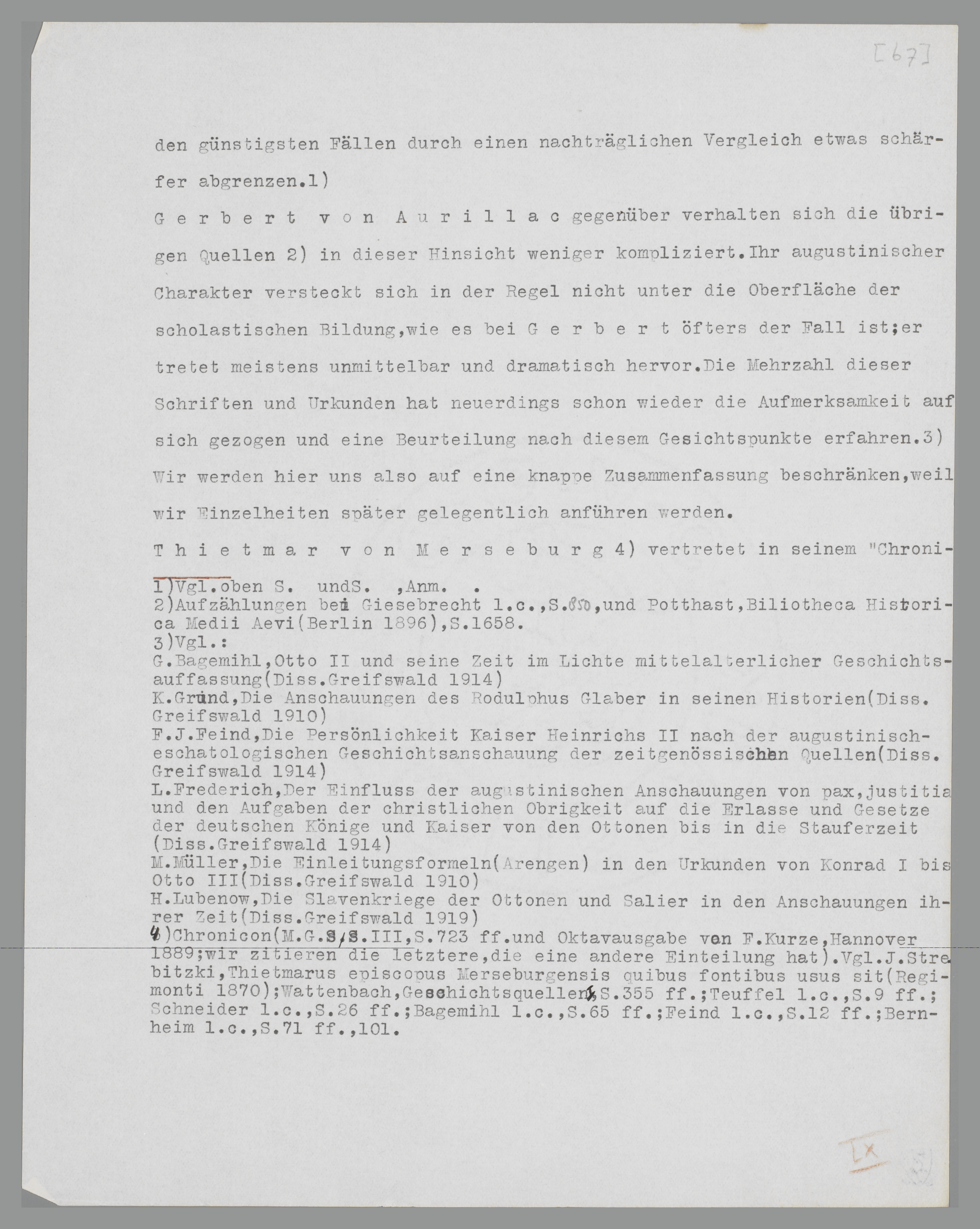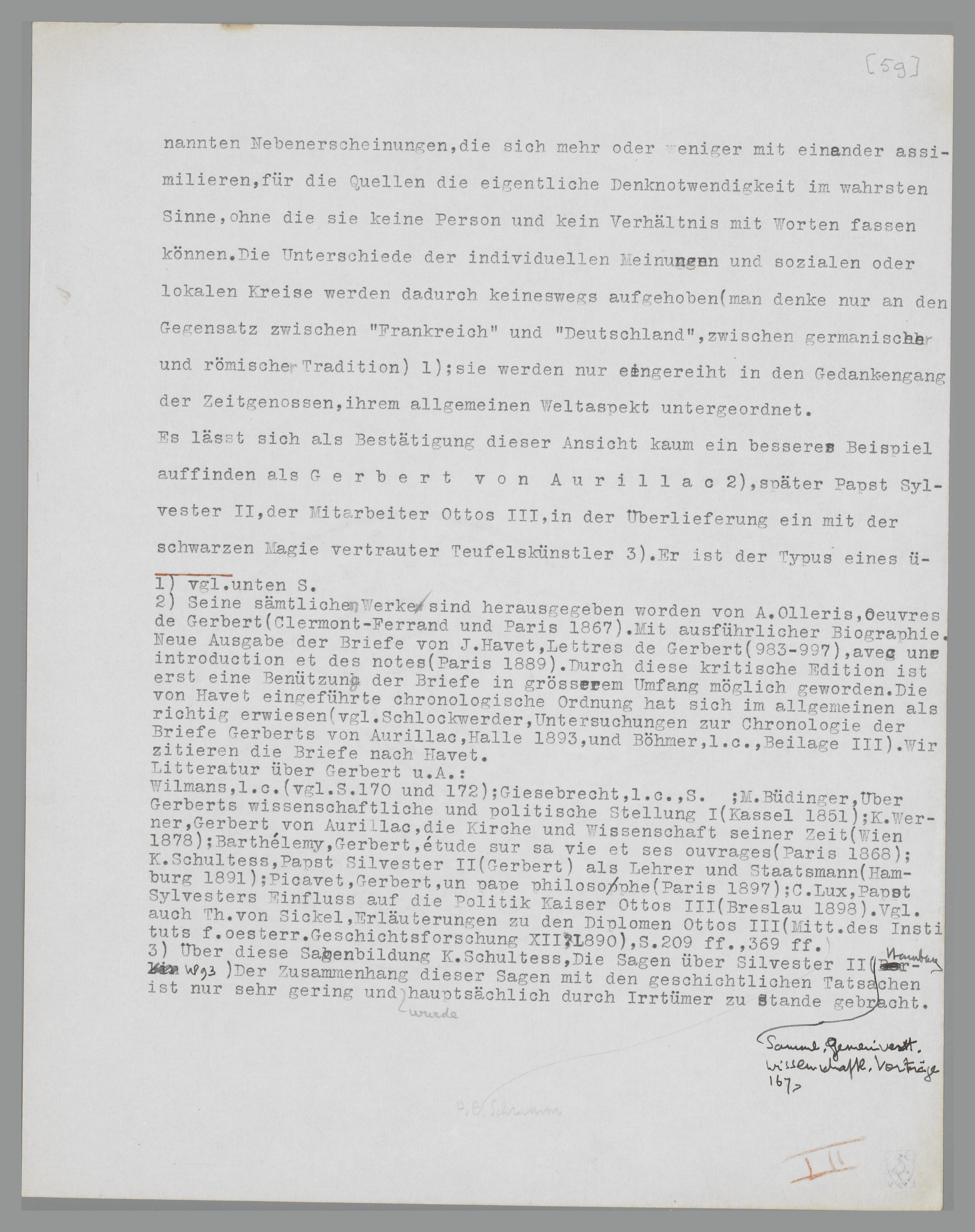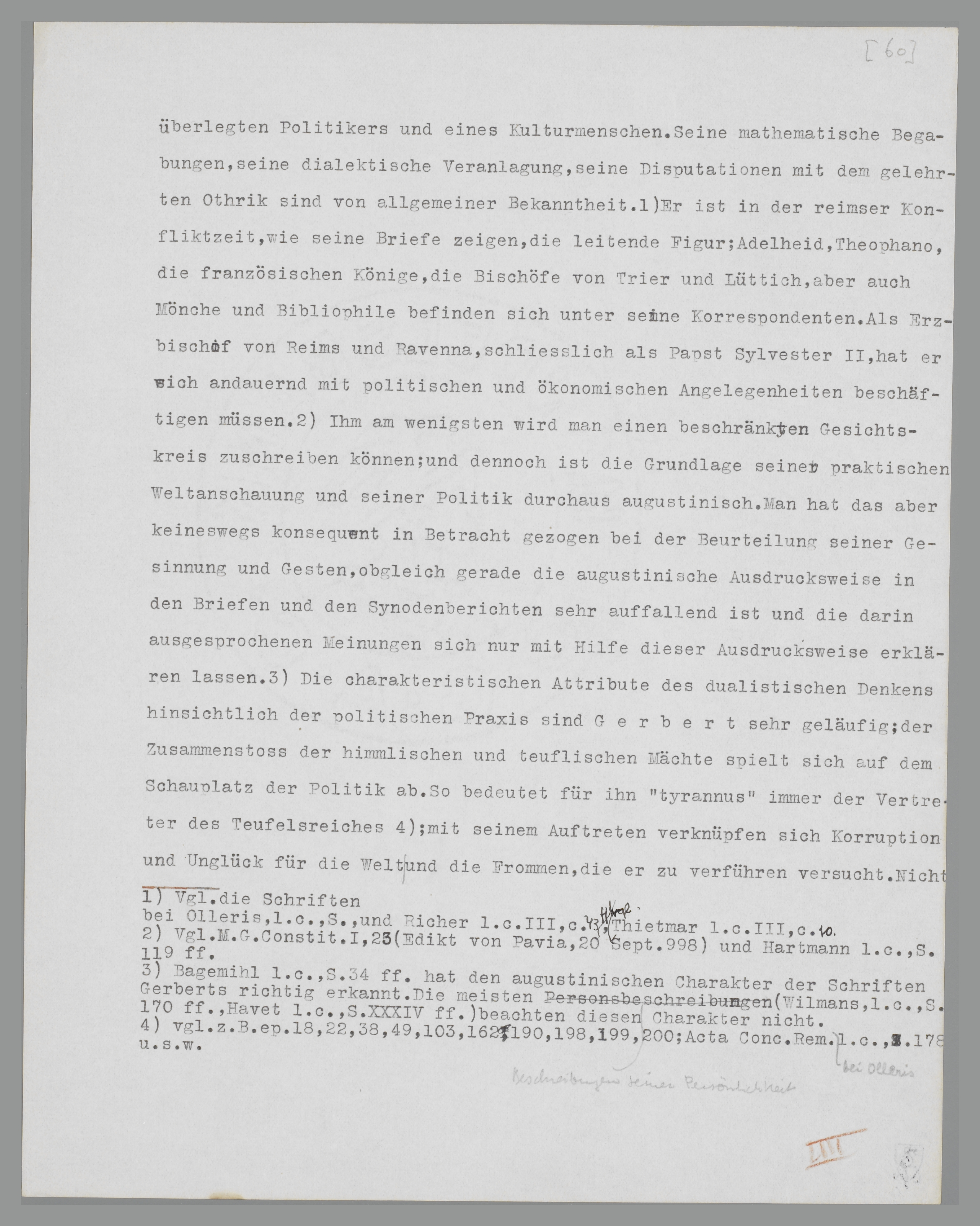 später Papst Silvester II., der Mitarbeiter Ottos III., in der Ueberlieferung ein mit der schwarzen Magie vertrauter Teufelskünstler107. Er ist der Typus eines überlegten Politikers und eines Kulturmenschen. Seine mathematische Begabung, seine dialektische Veranlagung, seine Disputationen mit dem gelehrten Othrik sind allgemein bekannt108. Er ist in der Reimser Konfliktzeit, wie seine Briefe zeigen, der leitende Kopf; Adelheid, Theophano, die französischen Könige, die Bischöfe von Trier und Lüttich, aber auch Cluniazenser und Bibliophilen befinden sich unter seinen Korrespondenten. Als Erzbischof von Reims und Ravenna, schliesslich als Papst Silvester II., hat er sich stets mit politischen und ökonomischen Angelegenheiten beschäftigen müssen109. Ihm am wenigsten wird man einen beschränkten Gesichtskreis zuschreiben können; und dennoch ist die Grundlage seiner praktischen Weltanschauung und seiner Politik durchaus augustinisch. Man hat das aber keineswegs konsequent in Betracht gezogen bei der Beurteilung seiner Gesinnung und seiner Gesten, obgleich gerade die augustinische Ausdrucksweise in den Briefen und den Synodenberichten sehr auffallend ist und die darin ausgesprochenen Meinungen sich nur mit Hilfe dieser Ausdrucksweise erklären