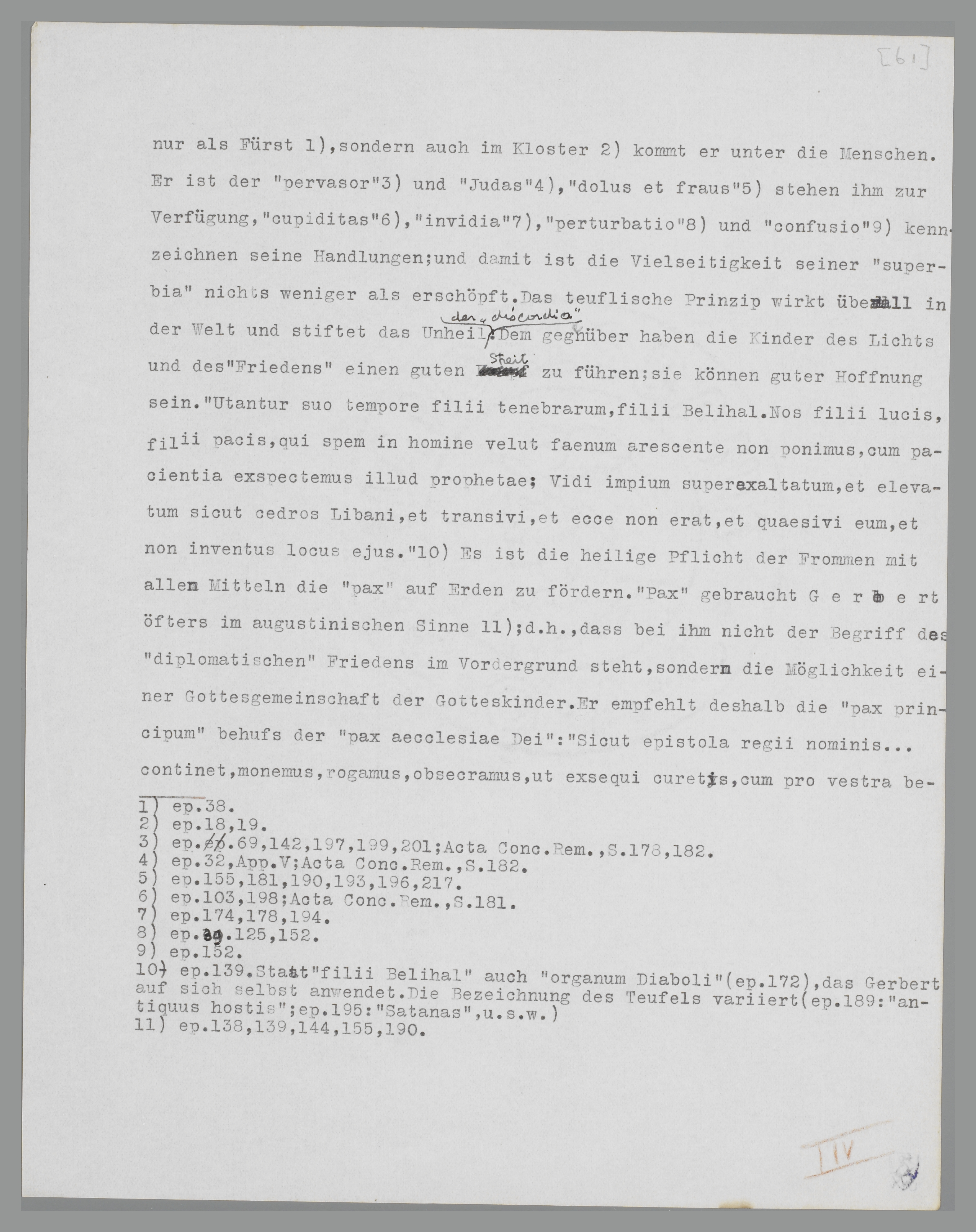 lassen110. Die charakteristischen Attribute des dualistischen Denkens in Bezug auf die politische Praxis sind Gerbert sehr geläufig; der Zusammenstoss der himmlischen und teuflischen Mächte spielt sich auf dem Schauplatz der Politik ab. So bedeutet für ihn ‘tyrannus’ immer der Vertreter des Teufelsreiches111; mit seinem Auftreten verknüpfen sich Korruption und Unglück für die Welt und die Frommen, die er zu verführen sucht. Nicht nur als Fürst112, sondern auch im Kloster113 kommt er unter die Menschen. Er ist der ‘pervasor’114 und ‘Judas’115, ‘dolus et fraus’116 sind seine Hilfsmittel, ‘cupiditas’117, ‘invidia’118, ‘perturbatio’119 und ‘confusio’120 kennzeichnen seine Handlungen; und damit ist die Vielseitigkeit seiner ‘superbia’ nichts weniger als erschöpft. Das teuflische Prinzip wirkt überall in der Welt und stiftet das Unheil der ‘discordia’. Dem gegenüber haben die Kinder des Lichts und des ‘Friedens’ einen guten Streit zu führen; sie können guter Hoffnung sein. ‘Utantur suo tempore filii tenebrarum, filii Belihal. Nos filii lucis, filii pacis, qui spem in homine velut faenum arescente non ponimus, cum pacientia exspectemus illud prophetae: Vidi impium superexaltatum, et elevatum sicut cedros Libani, et transivi, et ecce non erat, et