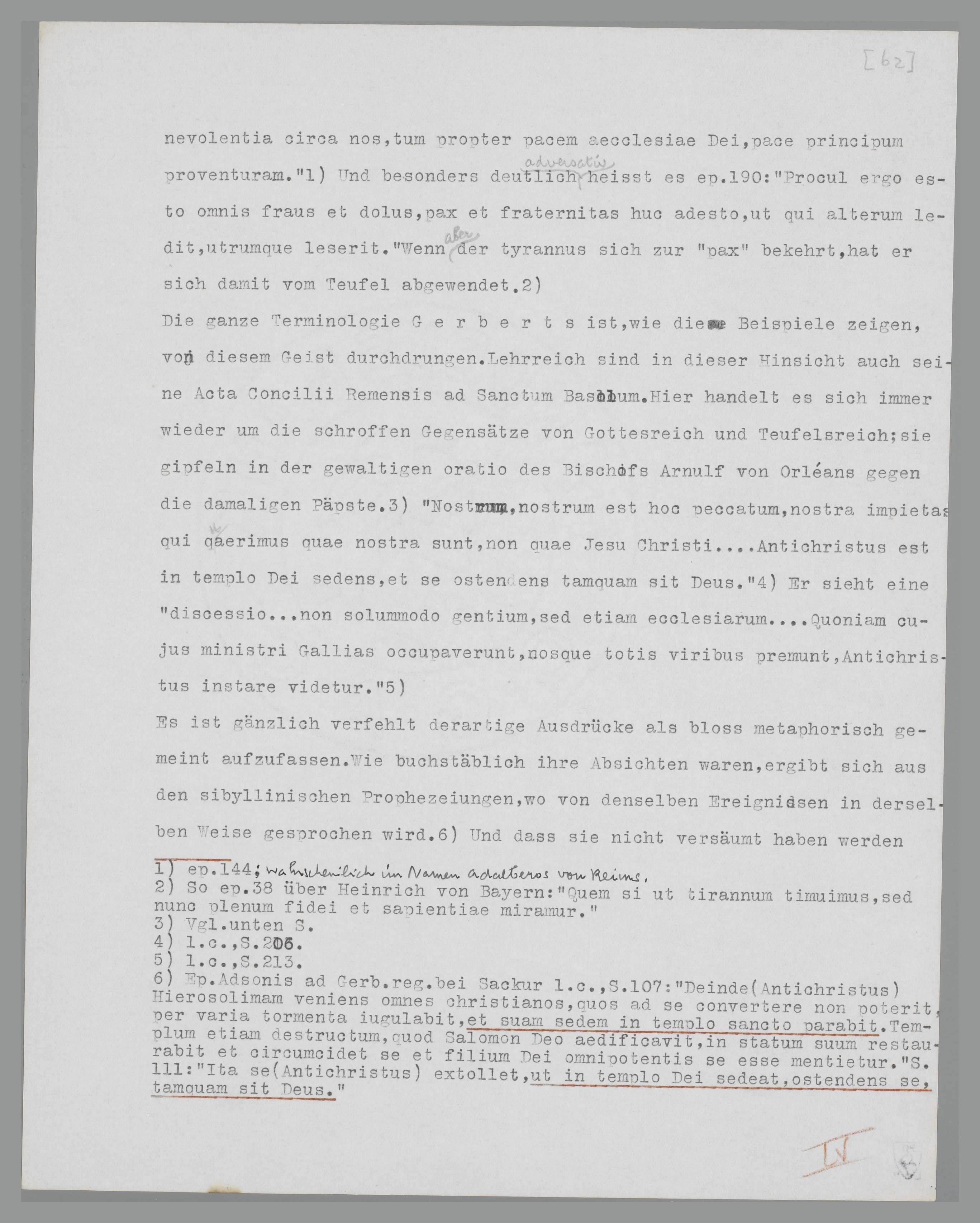 Die ganze Terminologie Gerberts ist, wie die Beispiele zeigen, von diesem Geist durchdrungen. Lehrreich sind in dieser Hinsicht auch seine Acta Concilii Remensis ad Sanctum Basolum. Hier handelt es sich immer wieder um die schroffen Gegensätze von Gottesreich und Teufelsreich; sie gipfein in der gewaltigen oratio des Bischofs Arnulf von Orléans gegen die damaligen Päpste125. ‘Nostrum, nostrum est hoc peccatum, nostra impietas qui quaerimus quae nostra sunt, non quae Jesu Christi..... Antichristus est in templo Dei sedens, et se ostendens tamquam sit Deus’126. Er sieht