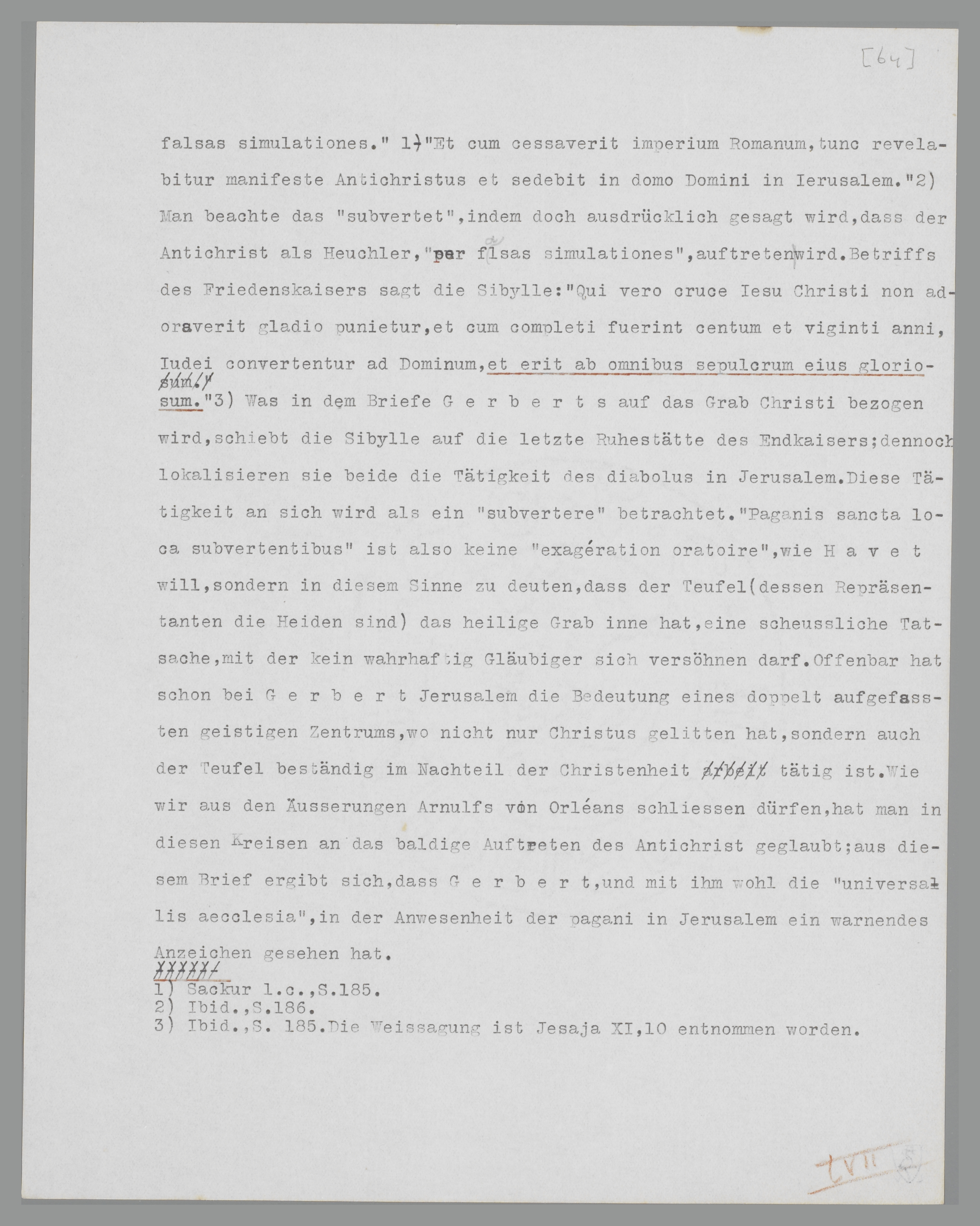 Enitere ergo, miles Christi, esto signifer et conpugnator etc’. Gewiss war es ungereimt, in diesem Passus eine Anspielung auf einen Kreuzzug zu suchen, denn nirgendwo ist von einem militärischen Einschreiten die Rede. Ebensowenig kann ‘paganis sancta loca subvertentibus’ heidnische Gewalttaten betreffen130. Der ganze Brief erhält nur dann einen Sinn, wenn man die unmittelbar einschlagende Wirkung des Namens Jerusalem vor Augen hat. Jerusalem spielt bekanntlich eine grosse Rolle in den Prophezeiungen über den Antichrist. Der Friedensfürst Constans wird nach der tiburtinischen Sibylle, bevor er nach Jerusalem kommt, den Antichrist besiegen. ‘Hic erit filius perditionis et caput superbie, et magister erroris, plenitudo malicie, qui subvertet orbem et faciet prodigia et signa magna per falsas simulationes’131. ‘Et cum cessaverit imperium Romanum tunc revelabitur manifeste Antichristus et sedebit in domo Domini in Jerusalem’132. Man beachte das ‘subvertet’, womit doch ausdrücklich gesagt wird, dass der Antichrist als Heuchler, ‘per falsas simulationes’, auftreten wird. Betreffs des Friedenskaisers sagt die Sibylle: ‘Qui vero cruce Iesu Christi non adoraverit gladio punietur, et cum completi fuerint centum et viginti anni, Iudei convertentur ad Dominum, et erit ab omnibus sepulcrum eius gloriosum’133. Was in dem Briefe Gerberts auf das Grab Christi bezogen wird, bezieht die Sibylle auf die letzte Ruhestätte des Endkaisers; dennoch lokalisieren sie beide die Tätigkeit des diabolus in Jerusalem. Diese Tätigkeit an sich wird als ein ‘subvertere’ betrachtet. ‘Paganis sancta loca subvertentibus’ ist also keine ‘exagération oratoire’, wie Havet will,