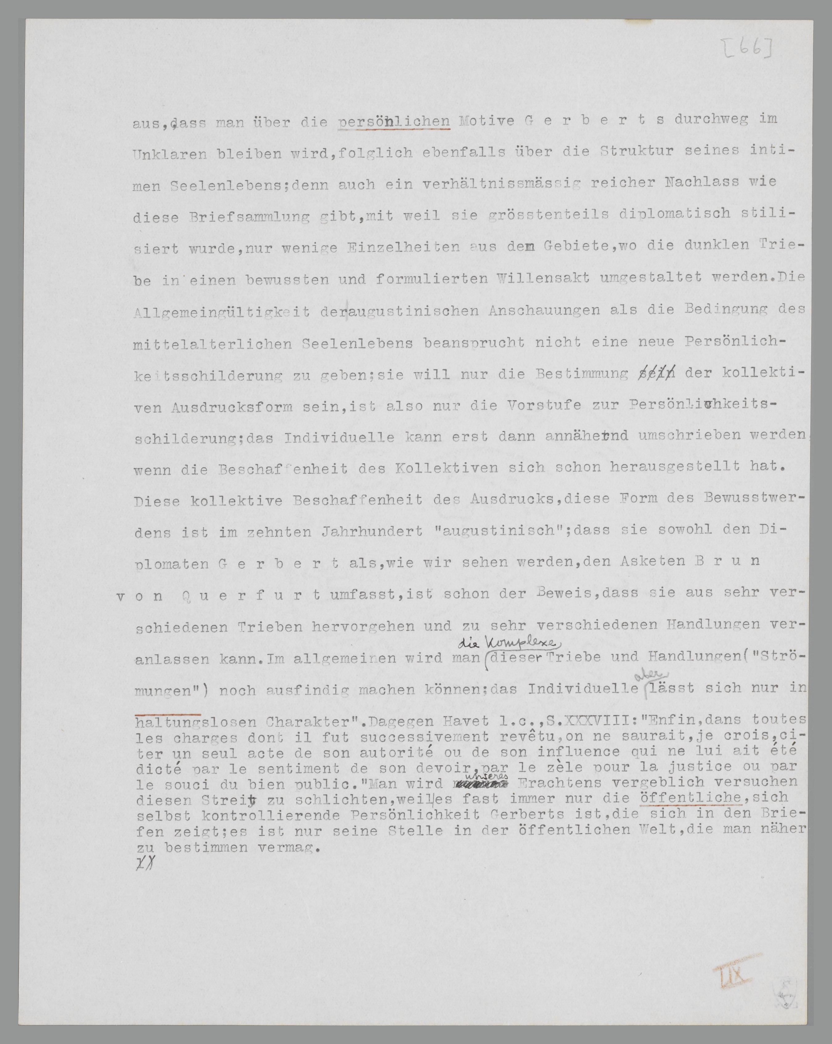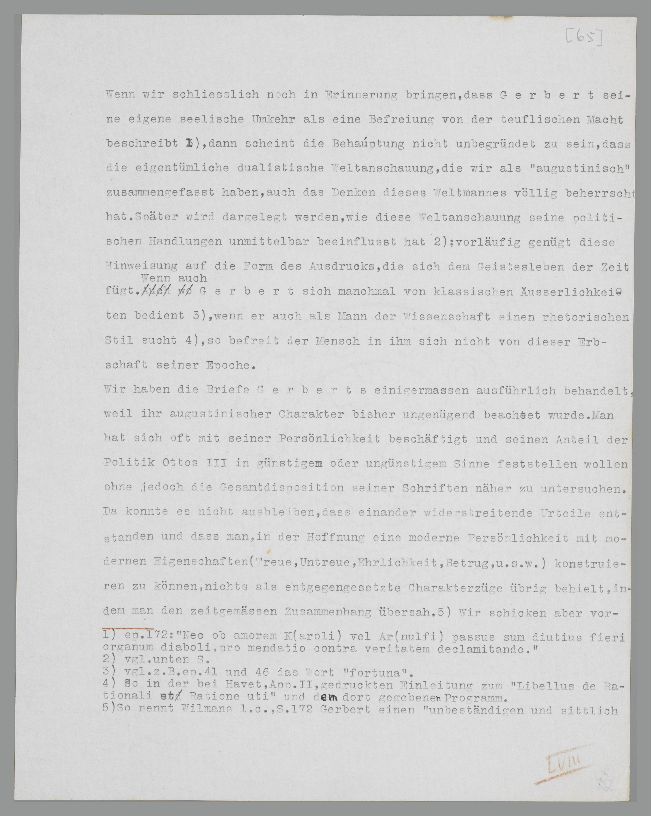 Wir haben die Briefe Gerberts einigermassen ausführlich behandelt, weil ihr augustinischer Charakter bisher ungenügend beachtet wurde. Man hat sich oft mit Gerberts Persönlichkeit beschäftigt und seinen Anteil an der Politik Ottos III. in günstigem oder ungünstigem Sinne feststellen wollen, ohne jedoch die Gesamtdisposition seiner Schriften näher zu untersuchen. Da konnte es nicht ausbleiben, dass einander widerstreitende Urteile entstanden, und dass man, in der Hoffnung, eine moderne Persönlichkeit mit modernen Eigenschaften (Treue, Untreue, Ehrlichkeit, Unehrlichkeit, u.s.w.) konstruieren zu können, nichts als widersprechende Charakterzüge übrig behielt, indem man den zeitbedingten Zusammenhang übersah138. Wir schicken aber voraus, dass man über die persönlichen Motive Gerberts durchweg im Unklaren bleiben wird, folglich ebenfalls öber die Struktur seines intimen Seelenlebens; denn auch ein verhältnismässig reicher Nachlass wie diese Briefsammlung gibt, schon weil sie grösstenteils diplomatisch stilisiert wurde, nur wenige Einzelheiten aus dem Gebiete, in dem die dunklen Triebe in einen bewussten und formulierten Willensakt umgestaltet werden. Die Allgemeingültigkeit der augustinischen Anschauungen als Bedingung des mittelalterlichen Seelenlebens fordert nicht eine neue Persönlichkeitsschilderung; sie will nur die Bestimmung der kollektiven Ausdrucksform sein, ist also nur die Vorstufe