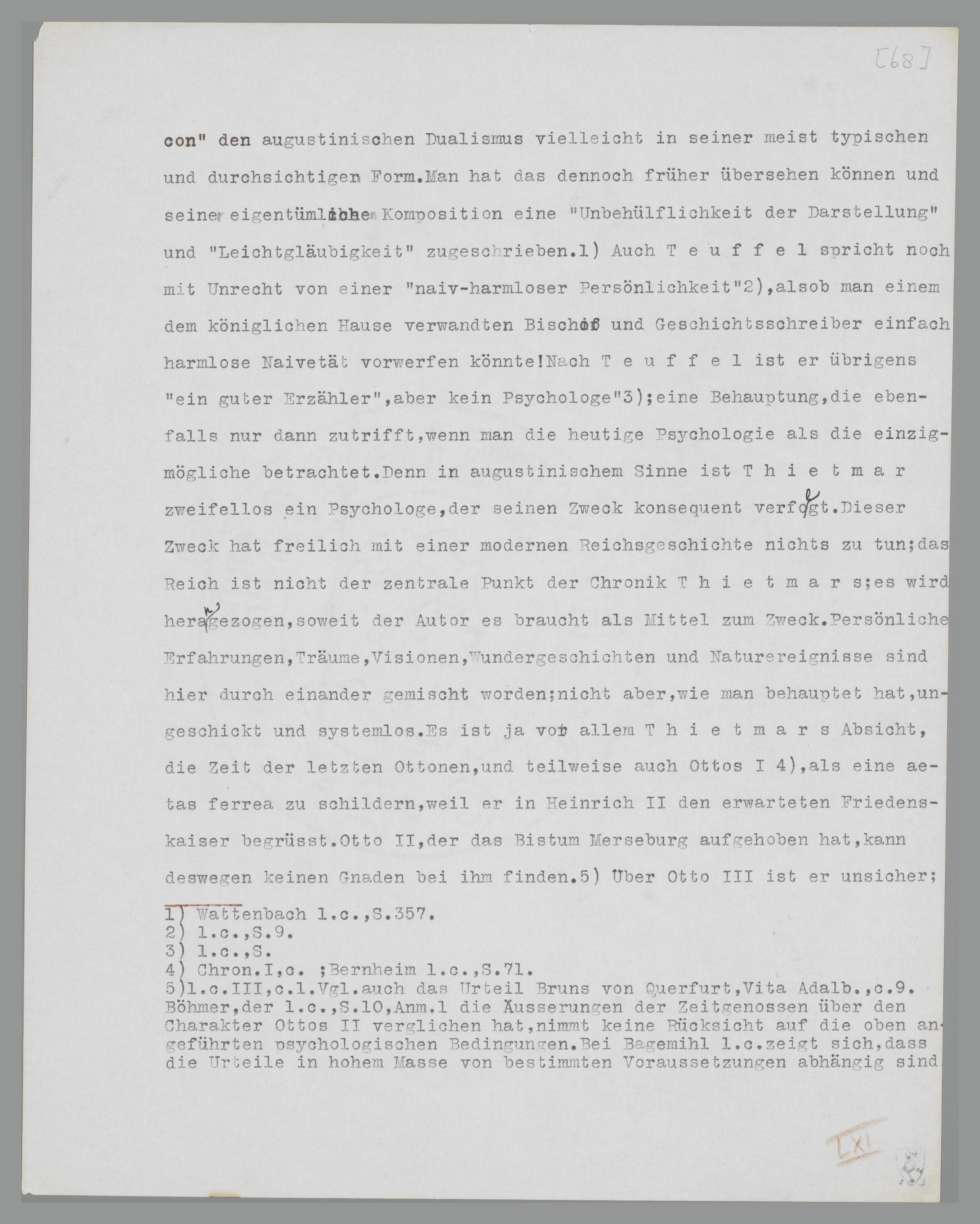 Thietmar von Merseburg142 vertritt in seinem ‘Chronicon’ den augustinischen Dualismus vielleicht in seiner typischsten und durchsichtigsten Form. Man hat das dennoch früher übersehen können und seine eigentümliche Komposition einer ‘Unbehülflichkeit der Darstellung’ und ‘Leichtgläubigkeit’ zugeschrieben143. Auch Teuffel spricht noch mit Unrecht von einer ‘naiv-harmlosen Persönlichkeit’144, als ob man einem mit dem königlichen Hause verwandten Bischof und Geschichtsschreiber einfach harmlose Naivität vorwerfen könnte! Nach Teuffel ist er übrigens ‘ein guter Erzähler aber kein Psychologe’145; eine Behauptung, die ebenfalls nur dann zutrifft, wenn man die heutige Psychologie als die einzigmögliche betrachtet. Denn im augustinischen Sinne ist Thietmar zweifellos ein Psychologe, der seinen Zweck konsequent verfolgt. Dieser Zweck hat freilich mit einer modernen Reichsgeschichte nichts zu tun; das Reich ist nicht der zentrale Punkt der Chronik Thietmars; es wird erwähnt, soweit der Autor es braucht als Mittel zum Zweck. Persönliche Erfahrungen, Träume, Visionen, Wunder-