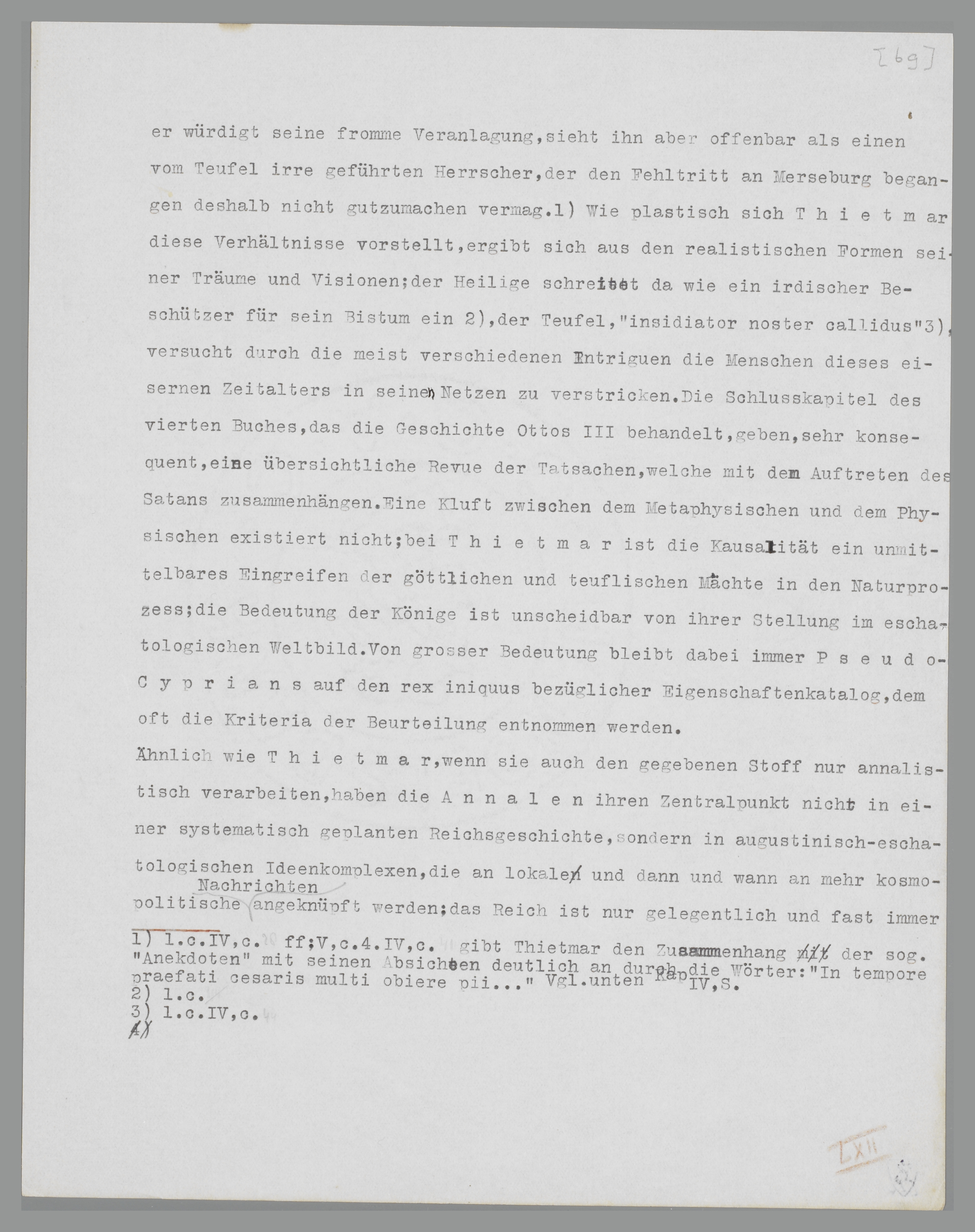 geschichten und Naturereignisse sind hier durch einander gemischt worden; nicht aber, wie man behauptet hat, ungeschickt und systemlos. Es ist ja vor allem Thietmars Absicht, die Zeit der letzten Ottonen, und teilweise auch Ottos I.146, als eine aetas ferrea zu schildern, weil er in Heinrich II. den erwarteten Friedenskaiser begrüsst. Otto II., der das Bistum Merseburg aufgehoben hat, kann deswegen keine Gnaden bei ihm finden147. In Bezug auf Otto III. ist er unsicher; er würdigt seine fromme Veranlagung, sieht ihn aber offenbar als einen vom Teufel irregeführten Herrscher an, der den an Merseburg begangenen Fehltritt nicht gutzumachen vermag148. Wie plastisch sich Thietmar diese Verhältnisse vorstellt, ergibt sich aus den realistischen Formen seiner Träume und Visionen; der Heilige schreitet da wie ein irdischer Beschützer zu Gunsten seines Bistums ein, der Teufel, ‘insidiator noster callidus’ versucht durch unzählige Intriguen die Menschen dieses eisernen Zeitalters in seine Netze zu verstricken. Die Schlusskapitel des vierten Buches, das die Geschichte Ottos III. behandelt, geben sehr konsequent eine Uebersicht der Tatsachen, welche mit dem Auftreten des Antichrist zusammenhangen. Eine Kluft zwischen dem Metaphysischen und dem Physischen existiert nicht; bei Thietmar ist die Kausalität