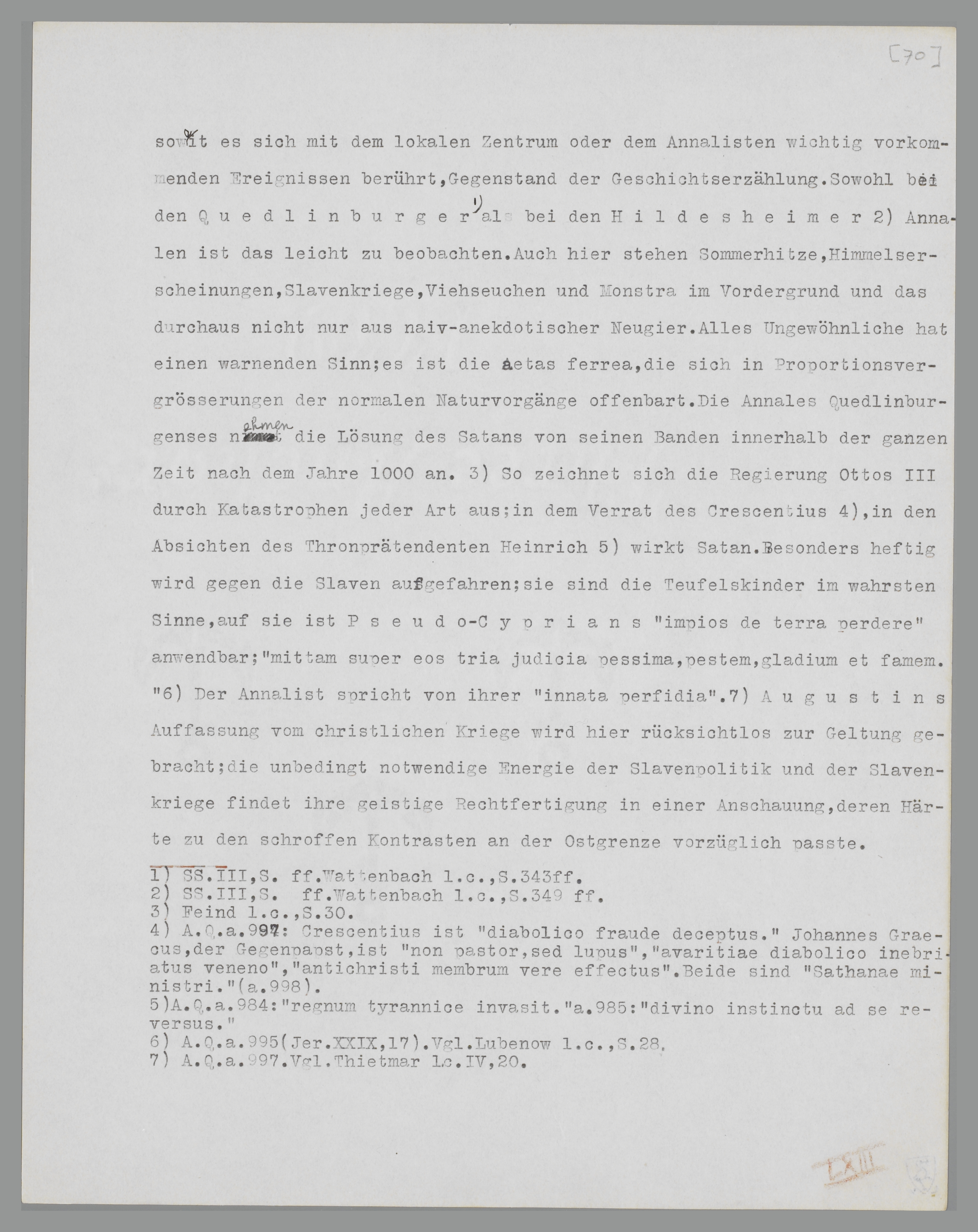 rich153 wirkt Satan. Besonders heftig wird mit den Slaven verfahren; sie sind die Teufelskinder im wahrsten Sinne, auf sie ist Pseudo-Cyprians ‘impios de terra perdere’ anwendbar; ‘mittam super eos tria judicia pessima, pestem, gladium et famem’154. Der Annalist spricht von ihrer ‘innata perfidia’155. Augustins Auffassung vom christlichen Kriege wird hier rücksichtlos zur Geltung gebracht; die unbedingt notwendige Energie der Slavenpolitik und der Slavenkriege findet ihre geistige Rechtfertigung in einer Anschauung, deren Härte zu den schroffen Konflikten an der Ostgrenze vorzüglich passte.