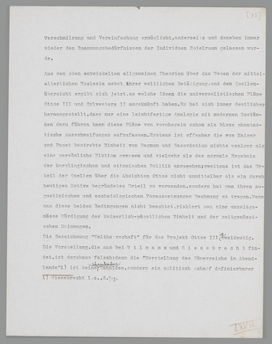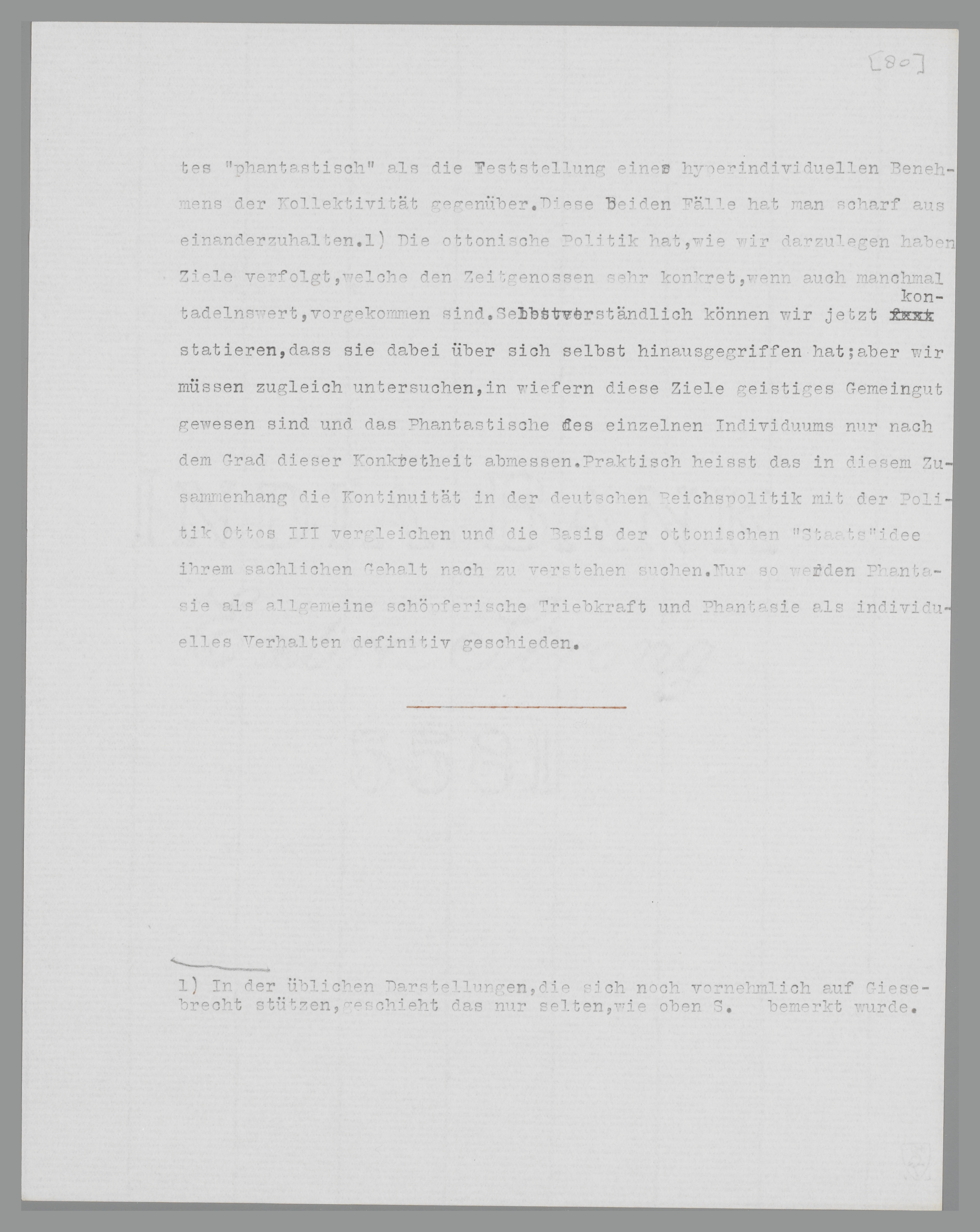 tastisch’ zu qualifizieren pflegt), dass ihre Richtlinien sich den aktiv an ihr beteiligten Individuen entziehen. Auch für den ‘Realpolitiker’ trifft das zu, weil er sich niemals der Vorbedingungen und Konsequenzen seiner Taten bewusst sein kann; denn was er überblickt, ist eben nur die nahe Vergangenheit und nahe Zukunft. Erst später wird aus den Werturteilen, welche die Menschheit über ihn abgibt, hervorgehen, welche ‘Werte’ er vertreten hat. Demnach greift auch das sehr konkrete politische Ziel weit über die Grenzen des Konkreten hinaus, ist in diesem Sinne gewissermassen immer ‘phantastisch’, weil jedes Projekt teilweise an der Praxis scheitern muss. Der Sprachgebrach aber empfiehlt eine Beschränkung des Wortes ‘phantastisch’ auf die Feststellung eines hyperindividuellen Benehmens der Kollektivität gegenüber. Diese beiden Fälle hat man scharf auseinanderzuhalten179. Die ottonische Politik hat, wie wir darzulegen haben, Ziele verfolgt, welche den Zeitgenossen sehr konkret, wenn auch manchmal tadelnswert, erschienen sind. Selbstverständlich können wir jetzt konstatieren, dass sie dabei über sich selbst hinausgegriffen hat; aber wir müssen zugleich untersuchen, inwiefern diese Ziele geistiges Gemeingut gewesen sind und wir dürfen das Phantastische des einzelnen Individuums nur nach dem Grade dieser Konkretheit abmessen. Praktisch heisst das in diesem Zusammenhang, die Kontinuität in der deutschen Reichspolitik mit der Politik Ottos III. zu vergleichen und die Basis der ottonischen Staatsidee ihrem sachlichen Gehalt nach zu verstehen suchen. Nur so werden Phantasie als allgemeine schöpferische Triebkraft und Phantasie als individuelles Verhalten definitiv geschieden.