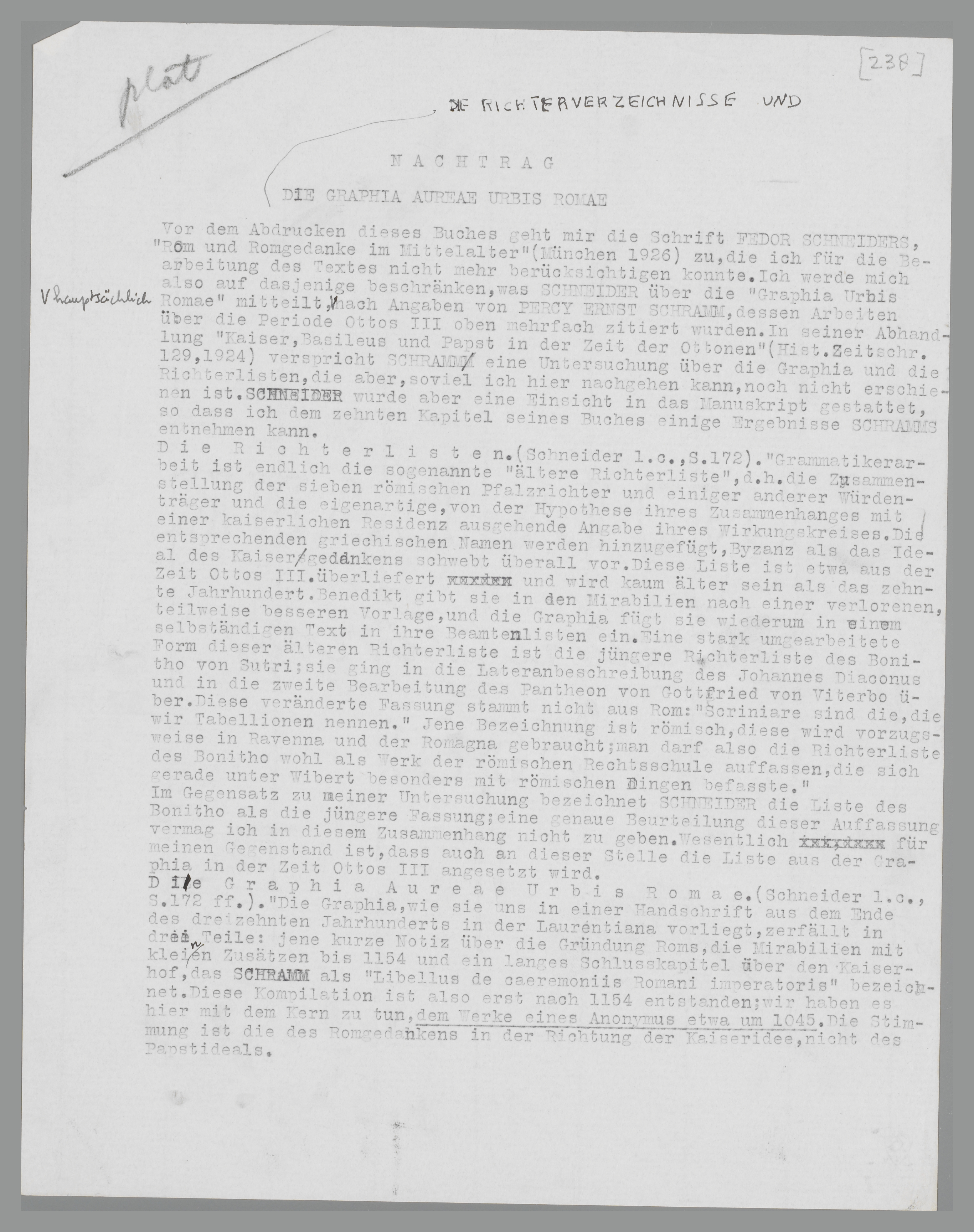Vor der endgültigen Drucklegung dieses Buches geht mir noch die Schrift Fedor Schneiders, ‘Rom und Romgedanke im Mittelalter’ (München 1926) zu, die ich bei der Bearbeitung des Textes nicht mehr berücksichtigen konnte. Ich werde mich also auf dasjenige beschränken, was Schneider über die ‘Graphia Aureae Urbis Romae’ mitteilt; er verwertet hauptsächlich Angaben von Percy Ernst Schramm, dessen Arbeiten über die Periode Ottos III. oben mehrfach zitiert wurden. In seiner Abhandlung ‘Kaiser, Basileus und Papst in der Zeit der Ottonen’ (Hist. Zeitschr. 129, 1924) verspricht Schramm eine Untersuchung über die Graphia und die Richterlisten, die aber, soviel ich hier feststellen konnte, noch nicht erschienen ist. Schneider wurde aber eine Einsicht in das Manuskript gestattet, sodass ich dem zehnten Kapitel seines Buches einige Ergebnisse Schramms entnehmen kann.