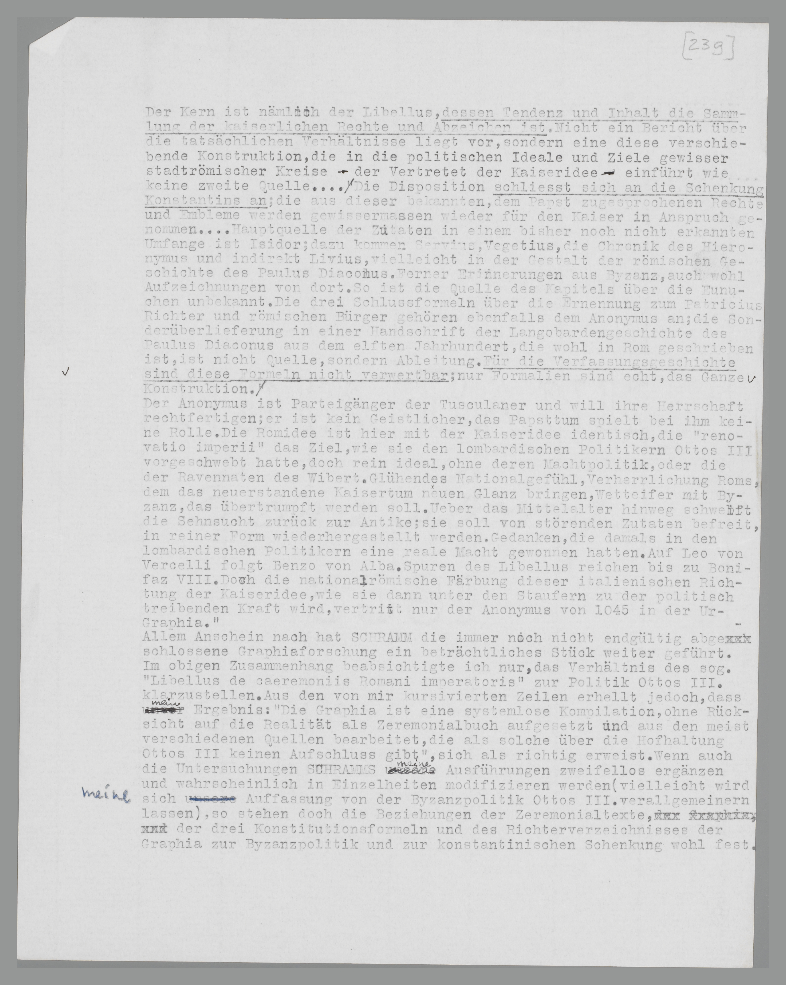 Allem Anschein nach hat Schramm die immer noch nicht endgültig abgeschlossene Graphiaforschung ein beträchtliches Stück weitergeführt. Im obigen Zusammenhang beabsichtigte ich nur, das Verhältnis des sog. ‘Libellus de caeremoniis Romani imperatoris’ zur Politik Ottos III. klarzustellen. Aus den von mir kursiv gedruckten Zeilen erhellt jedoch, dass mein Ergebnis: ‘Die Graphia ist eine systemlose Kompilation, ohne Rücksicht auf die Realität als Zeremonialbuch aufgesetzt und aus den verschiedensten Quellen bearbeitet, die als solche über die Hofhaltung Ottos III. keinen Aufschluss gibt’, sich als richtig erweist. Wenn auch die Untersuchungen Schramms meine Ausführungen zweifellos ergänzen und wahrscheinlich in Einzelheiten modifizieren werden (vielleicht wird sich meine Auffassung von der Byzanzpolitik Ottos III. verallgemeinern lassen), so stehen doch die Beziehungen der Zeremonialtexte, der drei Konstitutionsformeln und des Richterverzeichnisses der Graphia zur Byzanzpolitik und zur konstantinischen Schenkung