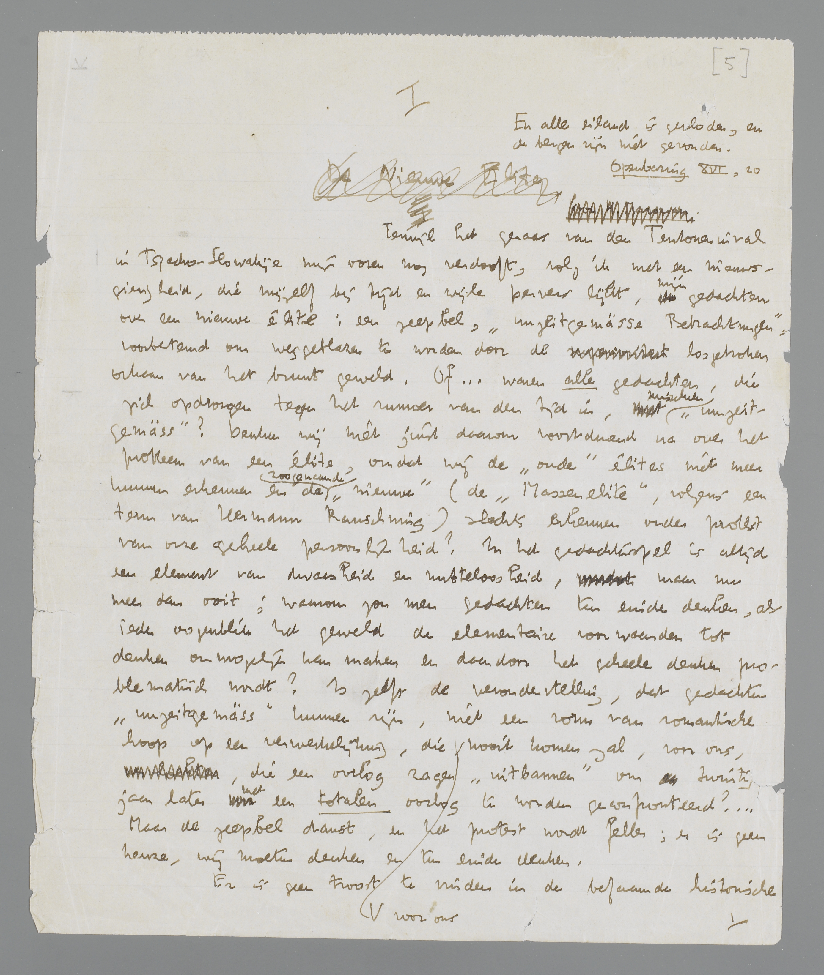 Terwijl het geraas van den Teutoneninval in Tsjecho-Slowakije mijn ooren nog verdooft, volg ik met een nieuwsgierigheid, die mijzelf bij tijd en wijle pervers lijkt, mijn gedachten over een nieuwe elite: een zeepbel, ‘unzeitgemässe Betrachtungen’, voorbestemd om weggeblazen te worden door de losgebroken orkaan van het bruut geweld. Of... waren alle gedachten, die zich opdrongen tegen het rumoer van den tijd in, misschien ‘unzeitgemäss’? Denken wij niet juist daarom voortdurend na over het probleem van een elite, omdat wij de ‘oude’ elites niet meer kunnen erkennen en de zoogenaamde ‘nieuwe’ (de ‘Massenelite’, volgens een term van Hermann Rauschning) slechts erkennen onder protest van onze geheele persoonlijkheid? In het gedachtenspel is altijd een element van dwaasheid en nutteloosheid, maar nu meer dan ooit; waarom zou men gedachten ten einde denken, als ieder oogenblik het geweld de elementaire voorwaarden tot denken onmogelijk kan maken en daardoor het geheele denken problematisch wordt? Is zelfs de veronderstelling, dat gedachten ‘unzeitgemäss’ kunnen zijn, niet een vorm van romantische hoop op een verwerkelijking, die voor ons nooit komen zal, voor ons, die een oorlog zagen ‘uitbannen’ om twintig jaar later met een totalen oorlog te worden geconfronteerd?... Maar de zeepbel danst, en het protest wordt feller; er is geen keuze, wij moeten denken en ten einde denken.