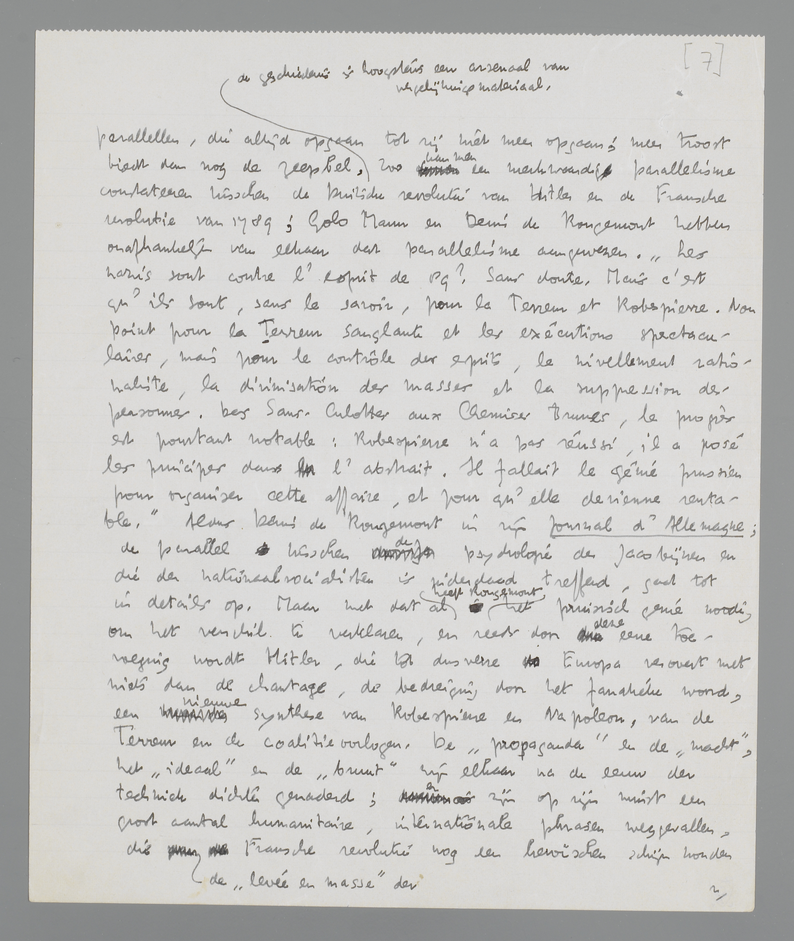 Er is geen troost te vinden in de befaamde historische parallellen, die altijd opgaan toe zij niet meer opgaan; meer troost biedt dan nog de zeepbel, de geschiedenis is hoogstens een arsenaal van vergelijkingsmateriaal. Zoo kan men een merkwaardig parallelisme constateeren tusschen de Duitsche revolutie van Hitler en de Fransche revolutie van 1789; Golo Mann en Denis de Rougemont hebben onafhankelijk van elkaar dat parallelisme aangewezen. ‘Les nazis sont contre l'esprit de 89? Sans doute. Mais c'est qu'ils sont, sans le savoir, pour la Terreur et Robespierre. Non point pour la Terreur sanglante et les exécutions spectaculaires, mais pour le contrôle des esprits, le nivellement rationaliste, la divinisation des masses et la suppression des personnes. Des Sans-Culottes aux Chemises Brunes, le progrès est pourtant notable: Robespierre n'a pas réussi, il a posé les principes dans l'abstrait. Il faillait le génie prussien pour organiser cette affaire, et pour qu'elle devienne rentable.’ Aldus Denis de Rougemont in zijn Journal d'Allemagne; de parallel tusschen de psychologie der Jacobijnen en die der nationaalsocialisten is inderdaad treffend, gaat tot in details op. Maar met dat al heeft Rougemont het pruisisch genie noodig om het verschil te verklaren, en reeds door deze eene toevoeging wordt Hitler, die tot dusverre Europa verovert met niets dan de chantage, de bedreiging door het fanatieke woord, iets nieuws: synthese van Robespierre en Napoleon, van de Terreur en de coalitieoorlogen. De ‘propaganda’ en de ‘macht’, het ‘ideaal’ en de ‘bruut’ zijn elkaar na de eeuw der techniek dichter genaderd; er zijn op zijn minst al een groot aantal humanitaire, internationale phrasen weggevallen, die de ‘levée en masse’ der Fransche revolutie nog een heroïschen schijn konden geven, die ook den genialen militair een kans gaven om de phraseologie deels weer op te heffen, deels tot Europeesch gemeengoed te maken. Men kan het met één zin zeggen: wij zijn nihilistischer geworden. Daarom verliest ook deze betooverende parallel op het beslissende moment haar bekoring en is zij, op datzelfde moment, niet meer ‘leerrijk’. ‘Liberté’, merkt Rougemont zelf op, kan men tegenwoordig vertalen door ‘herbewapening’. Zoo zou men de beide andere slogans der Fransche revolutie, ‘égalité’ en ‘fraternité’, kunnen vertalen door ‘gelijkschakeling’ en