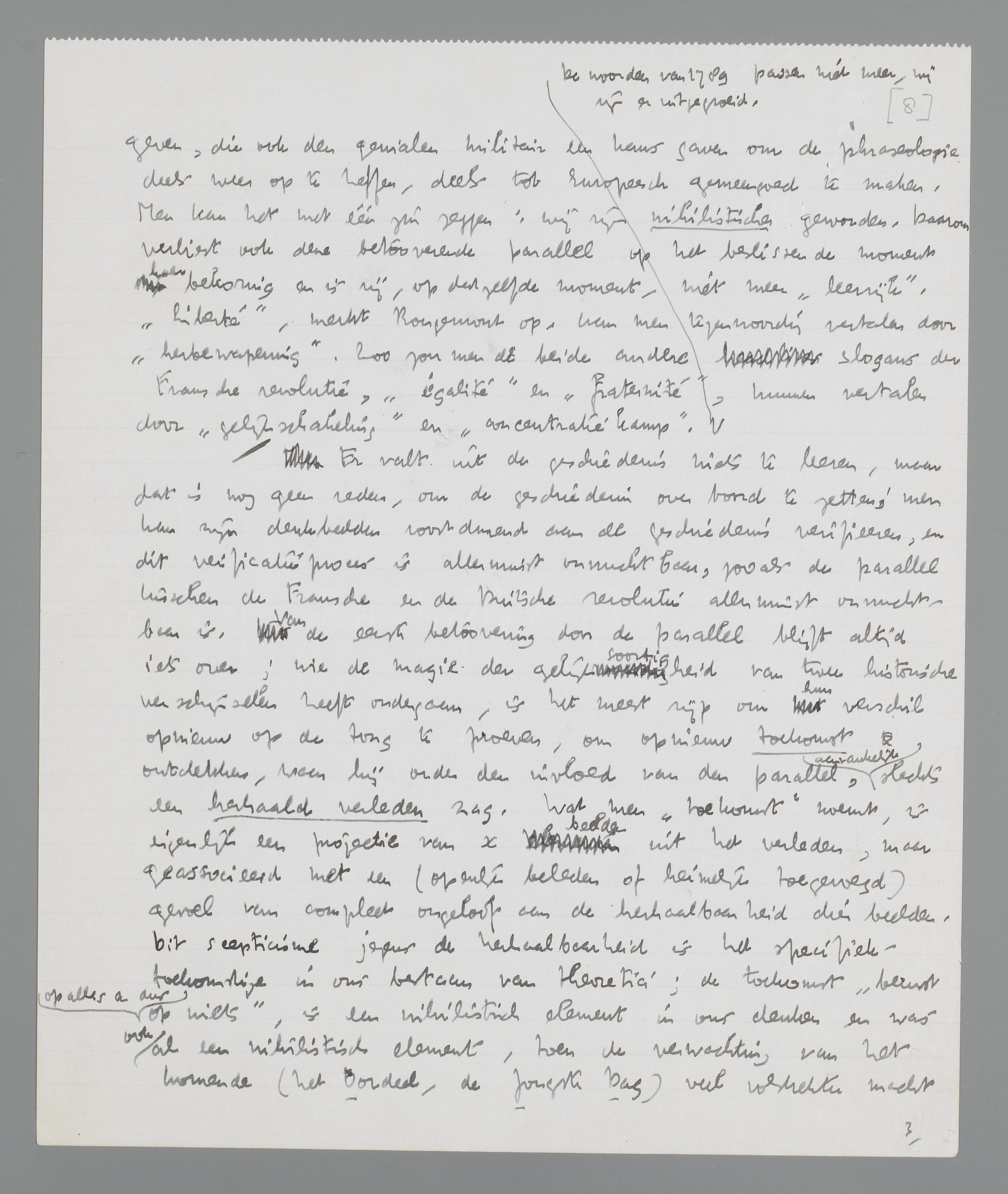 Er valt uit de geschiedenis niets te leeren, maar dat is nog geen reden om de geschiedenis over boord te zetten; men kan zijn denkbeelden voortdurend aan de geschiedenis verifieeren, en dit verificatieproces is allerminst onvruchtbaar, zooals de parallel tusschen de Fransche en de Duitsche revolutie allerminst onvruchtbaar is. Van de eerste betoovering door de parallel blijft altijd iets over; wie de magie der gelijksoortigheid van twee historische verschijnselen heeft ondergaan, is het meest rijp om hun verschil opnieuw op de tong te proeven, om opnieuw toekomst te ontdekken, waar hij, onder den invloed van de parallel, aanvankelijk slechts een herhaald verleden zag. Wat men toekomst noemt, is eigenlijk een projectie van x beelden uit het verleden, maar geassocieerd met een (openlijk beleden of heimelijk toegevoegd) gevoel van compleet ongeloof aan de herhaalbaarheid dier beelden. Dit scepticisme jegens de herhaalbaarheid is het specifiek-toekomstige in ons bestaan van theoretici; de toekomst ‘berust op alles en dus op niets’, is een nihilistisch element in ons denken en was ook al een nihilistisch element, toen de verwachting van het komende (het Oordeel, de Jongste Dag) veel volstrekter macht had over de zielen dan thans en de toekomst gebonden scheen aan een van te voren vastgesteld plan,... want de Jongste Dag bleef steeds maar uit en moest telkens opnieuw gedroomd worden als de toekomstige oplossing.