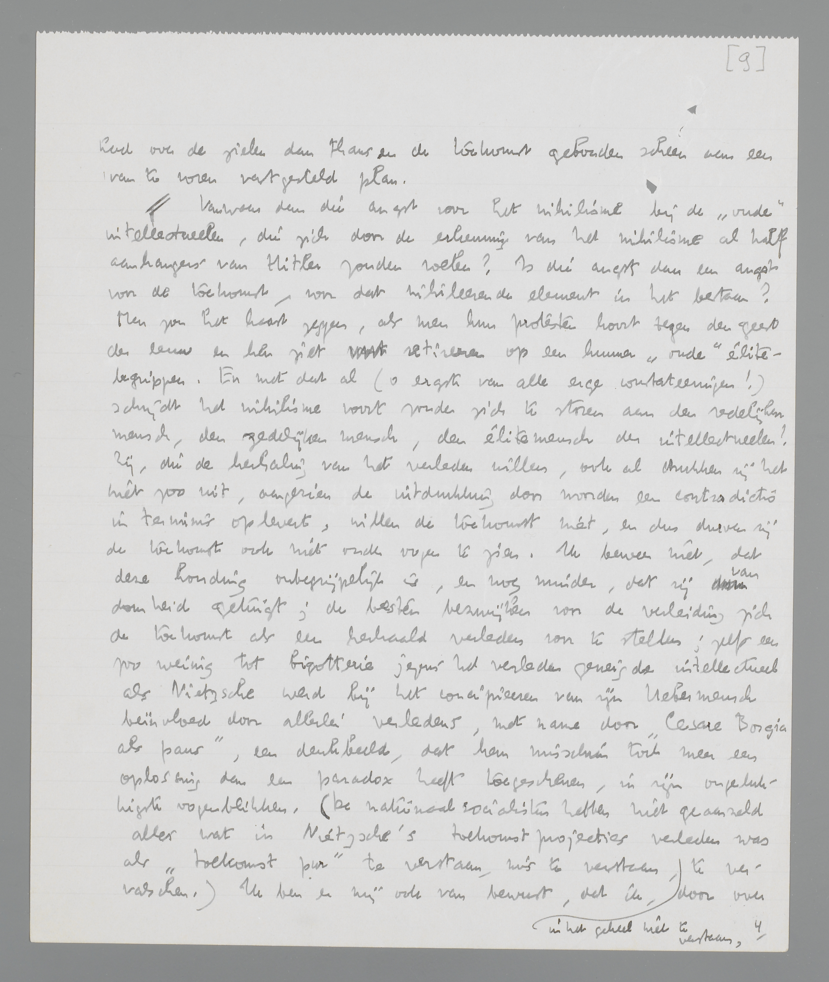 Vanwaar dan die angst voor het nihilisme bij de ‘oude’ intellectueelen, die zich door de erkenning van het nihilisme al half aanhangers van Hitler zouden voelen? Is die angst dan een angst voor de toekomst, voor dat nihileerende element in het bestaan? Men zou het haast zeggen, als men hun protesten hoort tegen den geest der eeuw en hen ziet retireeren op een hunner oude elite-begrippen. En met dat al (o ergste van alle erge constateeringen!) schrijdt het nihilisme voort zonder zich te storen aan den redelijken mensch, den zedelijken mensch, den elitemensch der intellectueelen! Zij, die de herhaling van het verleden willen, ook al drukken zij het niet zoo uit, aangezien de uitdrukking door woorden een contradictio in terminis oplevert, willen de toekomst niet, en dus durven
