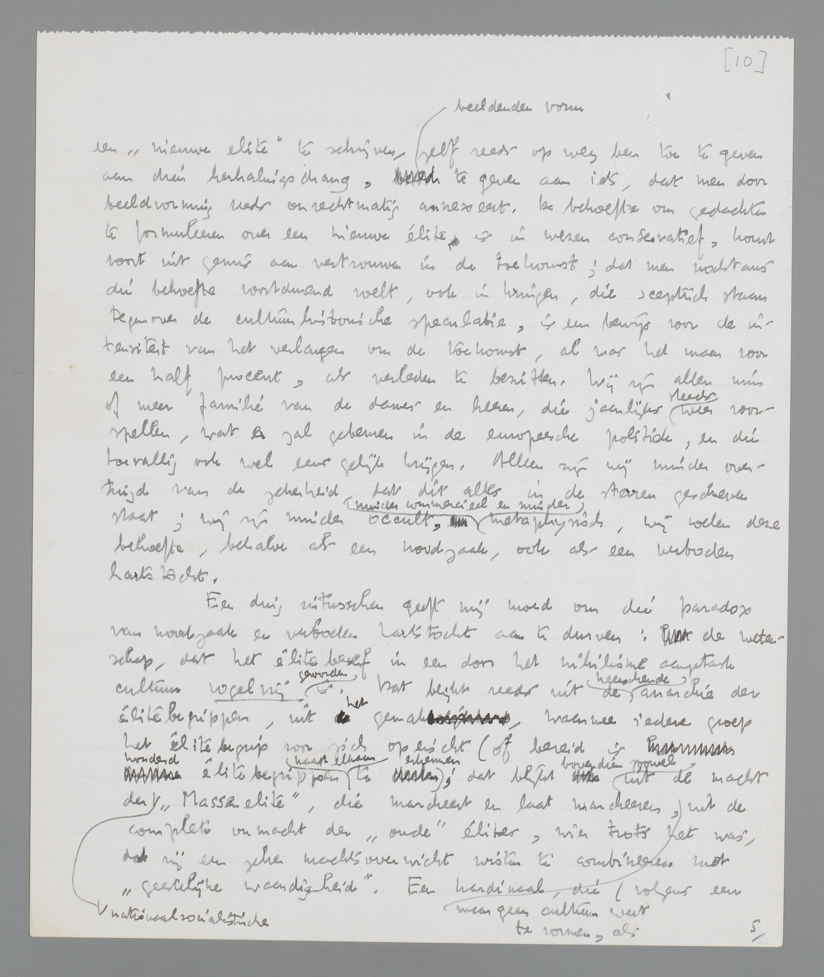 zij de toekomst ook niet onder oogen te zien. Ik beweer niet, dat deze houding onbegrijpelijk is, en nog minder, dat zij van domheid getuigt; de besten bezwijken voor de verleiding zich de toekomst als een herhaald verleden voor te stellen; zelfs een zoo weinig tot bigotterie jegens het verleden geneigde intellectueel als Nietzsche werd bij het concipieeren van zijn Uebermensch beïnvloed door allerlei verledens, met name door ‘Cesare Borgia als paus’, een denkbeeld, dat hem misschien toch meer een oplossing dan een paradox heeft toegeschenen, in zijn ongelukkigste oogenblikken. (De nationaalsocialisten hebben niet geaarzeld alles wat in Nietzsche's toekomst-projecties verleden was als ‘toekomst pur’ te verstaan, mis te verstaan, in het geheel niet te verstaan, te vervalschen.) Ik ben er mij ook van bewust, dat ik, door over een ‘nieuwe elite’ te schrijven, zelf reeds op weg ben toe te geven aan dien herhalingsdrang, beeldenden vorm te geven aan iet, dat men door beeldvorming al onrechtmatig annexeert. De behoefte om gedachten te formuleeren over een nieuwe elite is in wezen conservatief, komt voort uit gemis aan vertrouwen in de toekomst; dat wij nochtans die behoefte voortdurend voelen, óók wij, die sceptisch staan tegenover de cultuur-historische speculatie, is een bewijs voor de intensiteit van het verlangen om de toekomst, al was het maar voor een half procent, als verleden te bezitten. Wij zijn allen min of meer familie van de dames en heeren, die jaarlijks steeds weer voorspellen, wat er zal gebeuren in de europeesche politiek, en die toevallig ook soms gelijk krijgen. Alleen zijn wij minder overtuigd van de zekerheid, dat dit alles in de sterren geschreven staat; wij zijn minder occult, minder commercieel en minder metaphysisch, wij voelen deze behoefte, behalve als een noodzaak, ook als een verboden hartstocht.