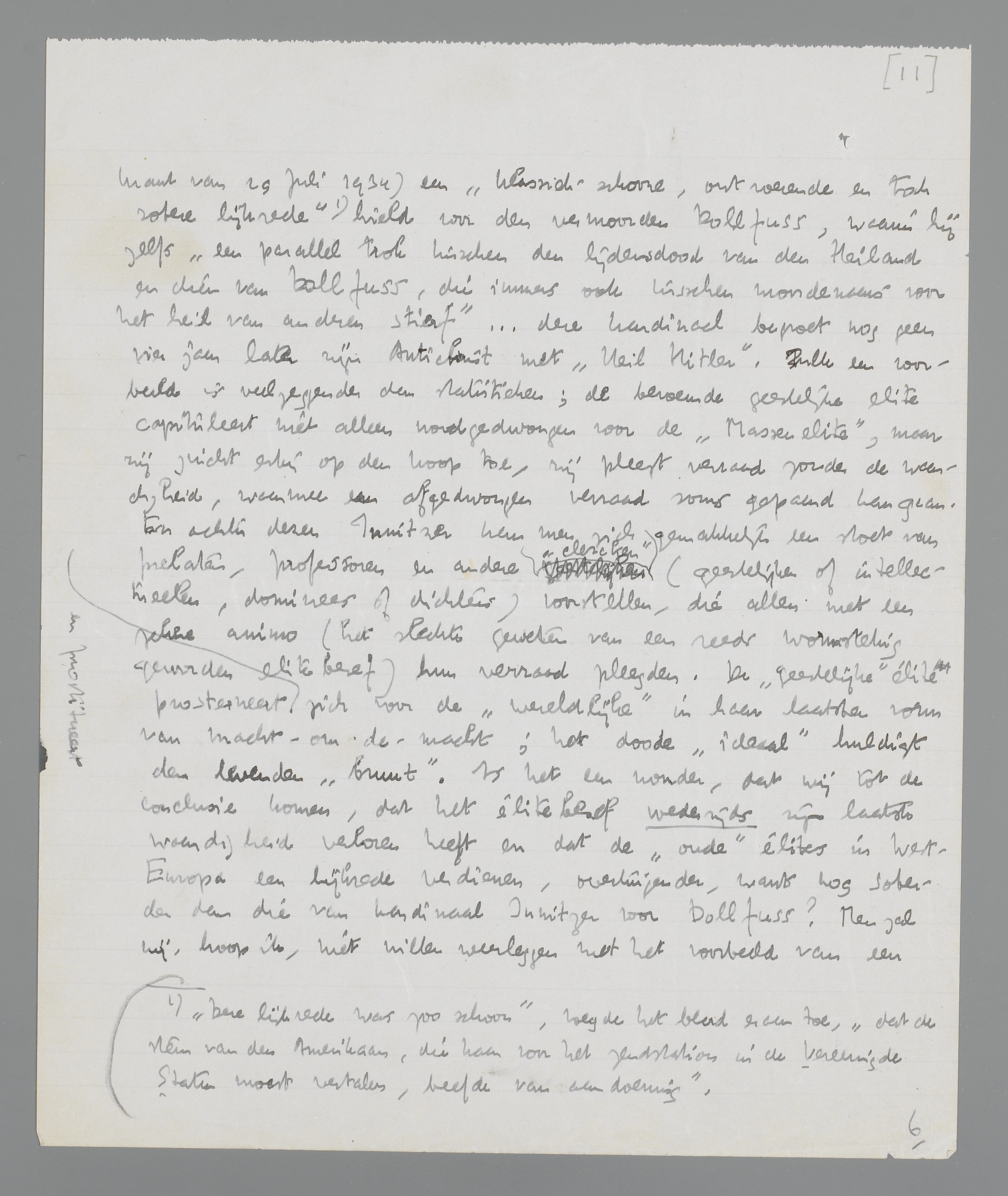 ‘MasseneLite’, die marcheert en laat marcheeren, maar geen cultuur weet te vormen, als uit de complete onmacht der ‘oude’ elites, wier trots het was, dat zij een zeker machts-overwicht wisten te combineeren met ‘geestelijke waardigheid’. Een kardinaal, die (volgens een krant van 29 Juli 1934) een ‘klassiek-schoone, ontroerende en toch sobere lijkrede’1 hield voor den vermoorden Dollfuss, waarin hij zelfs ‘een parallel trok tusschen den lijdensdood van den Heiland en dien van Dollfuss, die immers ook tusschen moordenaars voor het heil van anderen stierf’... deze kardinaal begroet nog geen vier jaar later zijn Antichrist met ‘Heil Hitler’. Zulk een voorbeeld is veelzeggender dan statistieken; de beroemde geestelijke elite capituleert niet alleen noodgedwongen voor de ‘Massenelite’, maar zij juicht erbij op den koop toe, zij pleegt verraad zonder de waardigheid, waarmee een afgedwongen verraad soms gepaard kan gaan. En achter dezen Innitzer kan men zich gemakkelijk een stoet van prelaten, professoren en andere ‘clercken’ (geestelijken of intellectueelen, dominees of dichters) voorstellen, die allen met een zekere animo (het slechte geweten van een reeds wormstekig geworden elitebesef) hun verraad pleegden. De ‘geestelijke’ elite prosterneert en prostitueert zich voor de ‘wereldlijke’ in haar laatsten vorm van macht-om-de-macht; het doode ‘ideaal’ huldigt den levenden ‘bruut’. Is het een wonder, dat wij tot de conclusie komen, dat het elitebesef wederzijds zijn laatste waardigheid verloren heeft en dat de oude elites in West-Europa een lijkrede verdienen, overtuigender, want nog soberder dan die van kardinaal Innitzer voor Dollfuss? Men zal mij, hoop ik, niet willen weerleggen met het voorbeeld van een Niemöller, dat zeer veel bewijst voor den persoonlijken moed van den enkeling, maar niets voor het elitebesef van zijn stand. Integendeel; het waren de collega's van Niemöller, wij waren het allen, die het zoover lieten komen, geïnfecteerd als wij waren door elitebegrippen van het kerkhof der cultuur...