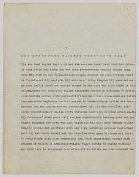 Wie een boek begint, legt zich met den eersten regel vast voor het geheele boek. Ieder schrijver met een schrijversgeweten aarzelt daarom lang voor hij zich op een regenachtigen morgen neerzet om dien eersten regel te formuleeren; hij weet, dat hij niet meer terug kan, dat hij gewetenloos en opzettelijk barok zou moeten worden om den toon van zijn begin te herroepen. Onder het schrijven zullen honderden varianten opduiken; de gesluierde beelden zullen zich onophoudelijk moeten verscherpen, sommige zullen langzamerhand wegdansen om niet weerom te komen, andere zullen zoo onherkenbaar aan het papier worden toevertrouwd, dat zij den schrijver zelf nieuw toeschijnen; er zullen zelfs bliksems door zijn hersens schieten, die hij ‘vondsten’ noemt, omdat hij van hun onderaardsch bestaan geen omlijnd begrip had; maar den toon van zijn begin zal hij niet meer kunnen verliezen, het geheel zal geschapen zijn met dien beruchten eersten regel. Naarmate hij het einde nadert, zal die toon hem meer gaan hinderen: hij leert al schrijvende zijn toon kennen, hij gaat zich ergeren; hij tracht zijn kruisen in mollen te transponeeren, hij waagt poging op poging zichzelf met zijn toon te verzoenen