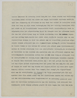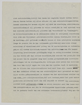 door alles uit te buiten, wat een toonaard omvatten kan; maar de ervaring leert hem, dat het einde steeds een verlossing beteekent, omdat alleen een einde een begin beslissend ongedaan maakt. En dan: hoe stumperig en officieus is nog vaak het einde! De schrijver heeft zich zoo lang op zijn einde verheugd, dat hij het twintig bladzijden vóór het einde al in verschillende temperaturen heeft doorleefd; zijn boek is afgedacht, voor het afgeschreven is, en de vreugde over het afdenken heeft die van het afschrijven lang en breed verslonden voor die regenachtige middag komt, waarin het einde einde wordt. De laatste zin: en een regenachtige morgen is door een geheel van op eenzelfden grondtoon afgestemde zinnen gekoppeld aan een regenachtigen middag. Nu zullen binnenkort de lezers komen en zij zullen dit geheel als geheel gaan verslinden; zij zullen de kleine avonturen voor een schrijftafel volbracht, de weerbarstige variaties op den eersten zin, aanvatten als een officieel complex van bedoelingen; de recensenten zullen hun plicht weer doen en alles, wat voor de schrijftafel met kleine, bijna onmerkbare zwenkingen tusschen sigaren en kopjes thee officieus ontstond, zullen zij - met het gelijk van hun vak - tot hun eigen gerief vergrooten. Over het geval van den man, die een jaar of langer de slaaf was van bladen wit papier, zullen zij niet meer spreken; zij zullen spreken over ‘den roman’, ‘het essay’, ‘de figuur’ (denk niet aan de schrijftafel: de figuur!) en ‘zijn generatie’. Of: àls zij