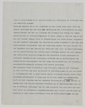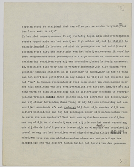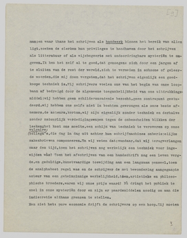 kan hij het verdragen onder zijn medemenschen rond te waren als een mysterie? Want voor een mysterieus wezen verslijten ons nog altijd de nietschrijvers, ook zij, die ons het meest verachten, ook zij, die de intelligentste lezers zijn en wien slechts door een betrekkelijk toeval de weg tot het schrijven werd afgesloten. Nog altijd ligt over het schrijven iets van den middeleeuwschen glans, van het privilege der clerken, die een vak geleerd hebben buiten het bereik van den gemeenen man; en waar thans het schrijven als handwerk binnen het bereik van allen ligt, zoeken de clerken hun privileges te handhaven door het schrijven als litteratuur of als wijsbegeerte met ondoordringbare mysteriën te omgeven. Ik ken het zelf al te goed, dat genoegen: zich door een jargon af te sluiten van de rest der wereld, zich te vermeien in schoone of geleerde woorden, die mij doen vergeten, dat het schrijven eigenlijk een goedkoope techniek is. Wij schrijvers voelen ons van het begin van onze loopbaan af bedreigd door de algemeene toegankelijkheid van ons uitdrukkingsmiddel; wij hebben geen schildersacademie bezocht, geen contrapunt gestudeerd, wij hebben ons zelfs niet in bochten gewrongen als onze beste afnemers, de acteurs, kortom, wij zijn eigenlijk zonder techniek en derhalve zonder natuurlijk verdedigingswapen tegen de onbescheiden blikken der leeken: het kost ons moeite, een schijn van vaksuperioriteit te veroveren op onze collega's van het kantoor, die dag in dag uit achter hun schrijfmachines onberispelijke