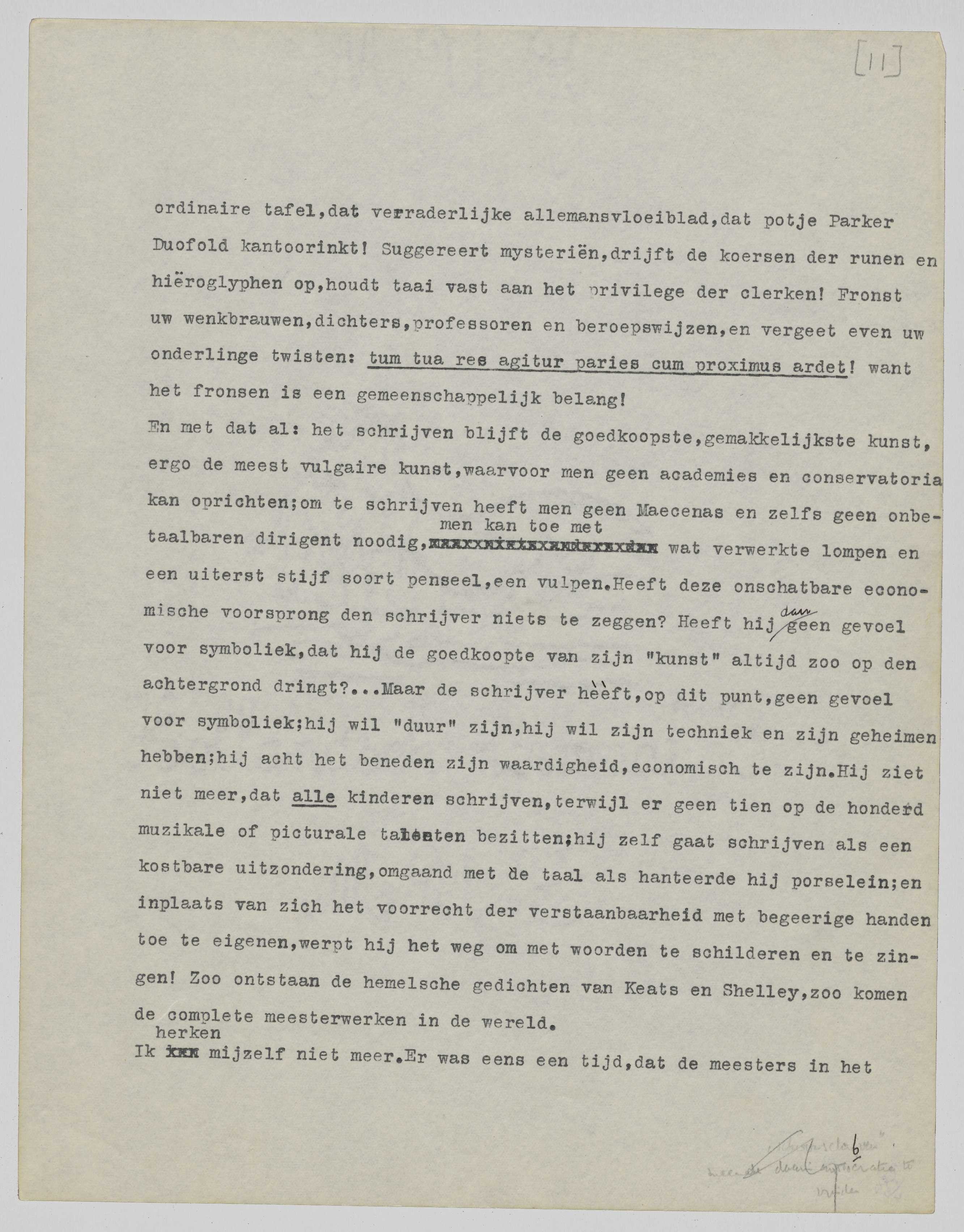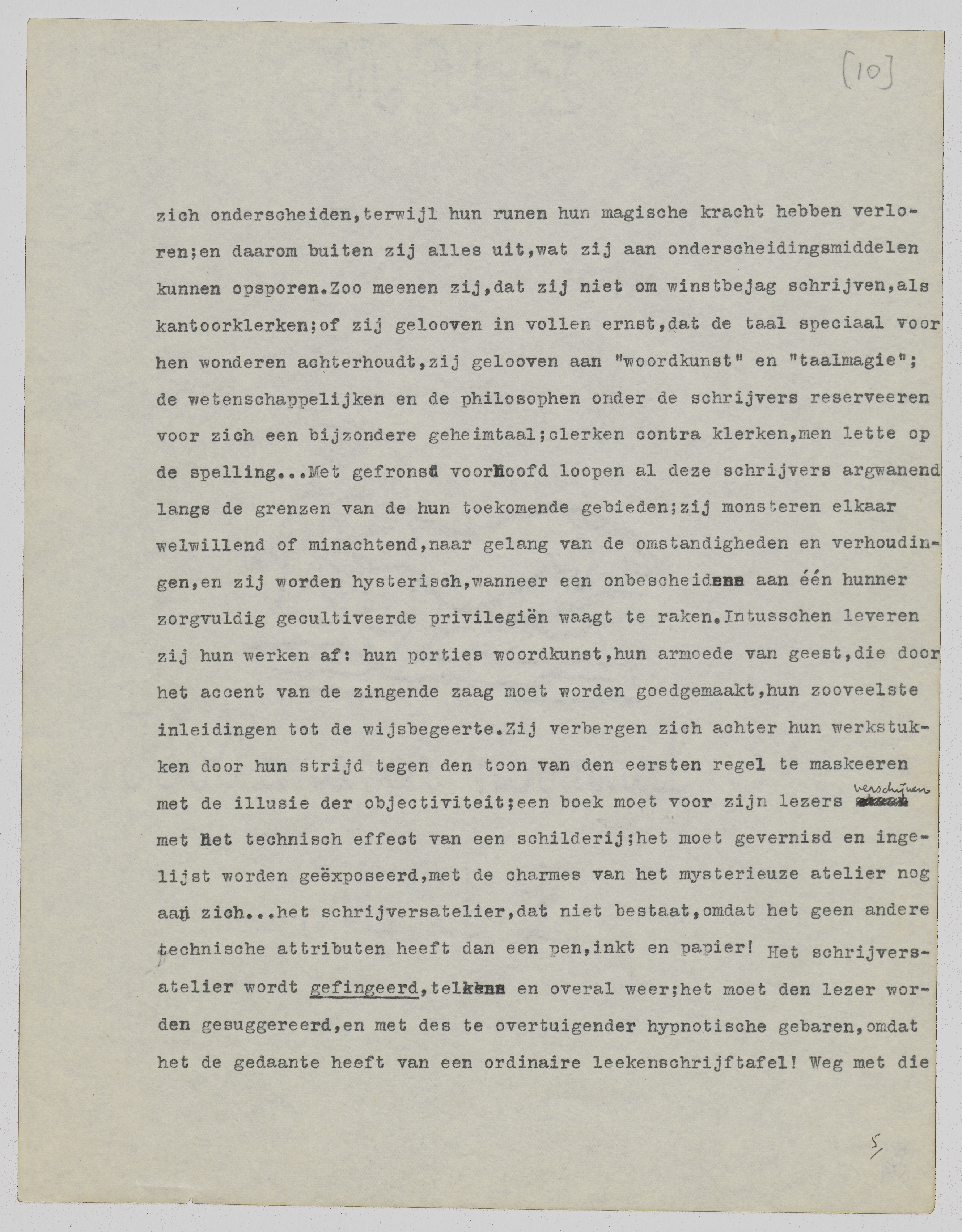 Men ziet het: pure economie drijft de schrijvers op een hoop. Zij moeten zich onderscheiden, terwijl hun runen hun magische kracht hebben verloren; en daarom buiten zij alles uit, wat zij aan onderscheidingsmiddelen kunnen opsporen. Zoo meenen zij, dat zij niet om winstbejag schrijven, als kantoorklerken; of zij gelooven in vollen ernst, dat de taal speciaal voor hen wonderen achterhoudt. Zij gelooven aan ‘woordkunst’ en ‘taalmagie’; de wetenschappelijken en de philosophen onder de schrijvers reserveeren voor zich een bijzondere geheimtaal; clerken contra klerken, men lette op de spelling... Met gefronst voorhoofd loopen al deze schrijvers argwanend langs de grenzen van de hun toekomende gebieden; zij monsteren elkaar welwillend of minachtend, naar gelang van de omstandigheden en verhoudingen, en zij worden hysterisch, wanneer