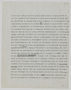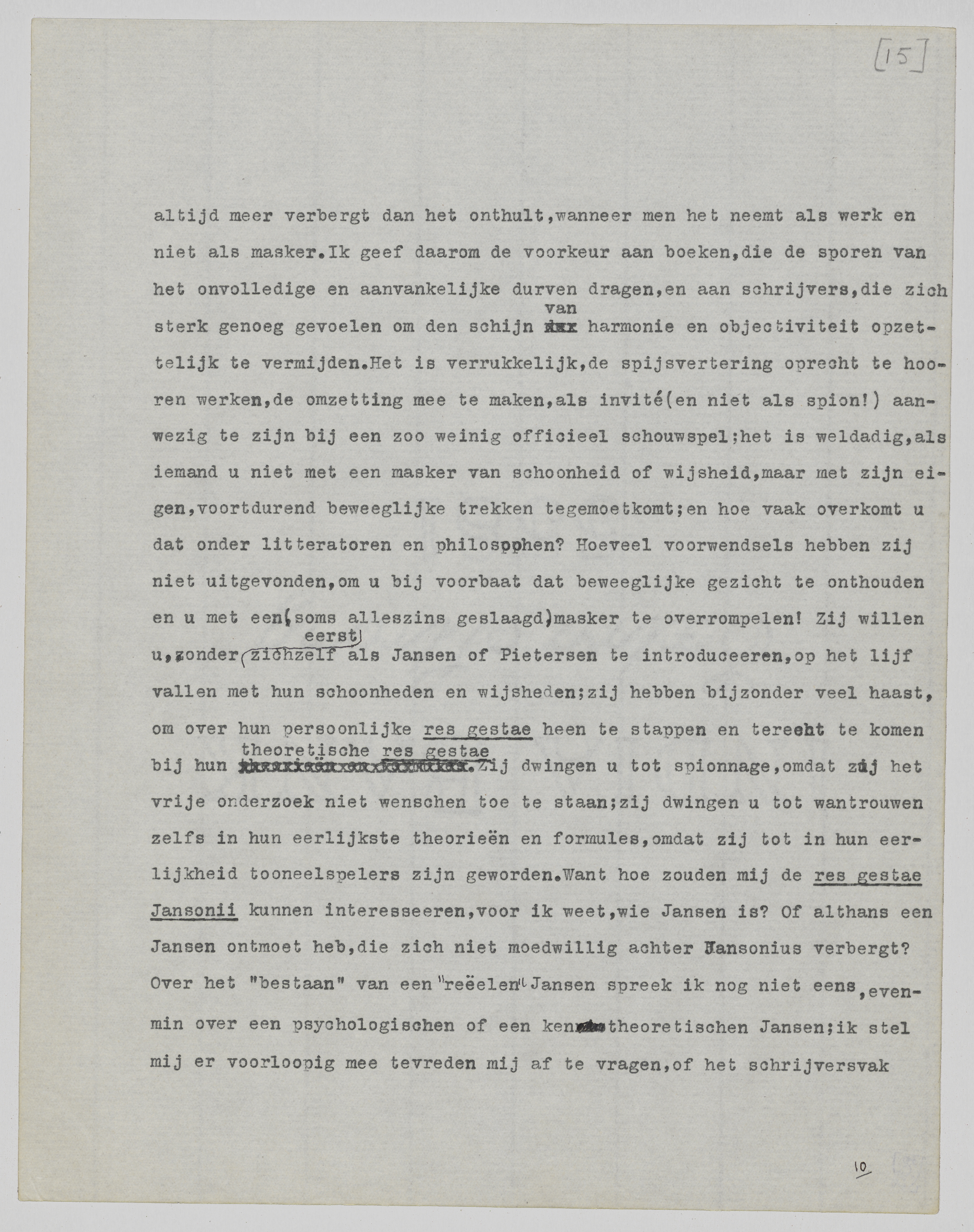 over hun persoonlijke res gestae heen te stappen en terecht te komen bij hun theoretische res gestae. Zij dwingen u tot spionnage, omdat zij het vrije onderzoek niet wenschen toe te staan; zij dwingen u tot wantrouwen zelfs in hun eerlijkste theorieën en formules, omdat zij tot in hun eerlijkheid tooneelspelers zijn geworden. Want hoe zouden mij de res gestae Jansonii kunnen interesseeren, voor ik weet, wie Jansen is? Of althans een Jansen ontmoet heb, die zich niet moedwillig achter Jansonius verbergt? Over het ‘bestaan’ van een ‘reëelen’ Jansen spreek ik nog niet eens, evenmin over een psychologischen of een kentheoretischen Jansen; ik stel mij er voorloopig mee tevreden mij af te vragen, of het schrijversvak soms is uitgevonden om de spijsvertering der schrijvers te verbergen door een ambtelijk gewaad. Begrijpt men, dat ik op dit oogenblik in mijn leven geen ander boek zou kunnen schrijven dan een boek overloopend van onvolledigheid en aanvankelijkheid? Dat het een eerezaak kan worden, allen schijn van roman-objectiviteit of verhandelingsstijl te laten varen en voor den dag te komen als Jansen? Daarom laten de bekommeringen van velen mijner tijdgenooten mij koud; het aanleggen van wederom een nieuw bloembed in den tuin der nederlandsche letterkunde laat ik voorloopig gaarne over aan hen, die beter kweekers zijn dan ik; voor het schrijven van tijd- en industrieromans, die de spijsvertering bij uitstek goed verbergen achter een veel pompeuzer Collectieve Spijsvertering, kan men bovendien altijd